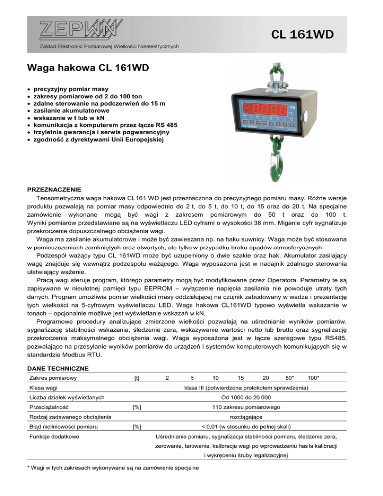 Waga hakowa CL 161WD • • • • • • • • precyzyjny pomiar masy zakresy pomiarowe od 2 do 100 ton zdalne sterowanie na podczerwień do 15 m zasilanie akumulatorowe wskazanie w t lub w kN komunikacja z komputerem przez łącze RS 485 trzyletnia gwarancja i serwis pogwarancyjny zgodność z dyrektywami Unii Europejskiej PRZEZNACZENIE Tensometryczna waga hakowa CL161 WD jest przeznaczona do precyzyjnego pomiaru masy. Różne wersje produktu pozwalają na pomiar masy odpowiednio do 2 t, do 5 t, do 10 t, do 15 oraz do 20 t. Na specjalne zamówienie wykonane mogą być wagi z zakresem pomiarowym do 50 t oraz do 100 t. Wyniki pomiarów przedstawiane są na wyświetlaczu LED cyframi o wysokości 38 mm. Miganie cyfr sygnalizuje przekroczenie dopuszczalnego obciążenia wagi. Waga ma zasilanie akumulatorowe i może być zawieszana np. na haku suwnicy. Waga może być stosowana w pomieszczeniach zamkniętych oraz otwartych, ale tylko w przypadku braku opadów atmosferycznych. Podzespół ważący typu CL 161WD może być uzupełniony o dwie szakle oraz hak. Akumulator zasilający wagę znajduje się wewnątrz podzespołu ważącego. Waga wyposażona jest w nadajnik zdalnego sterowania ułatwiający ważenie. Pracą wagi steruje program, którego parametry mogą być modyfikowane przez Operatora. Parametry te są zapisywane w nieulotnej pamięci typu EEPROM – wyłączenie napięcia zasilania nie powoduje utraty tych danych. Program umożliwia pomiar wielkości masy oddziałującej na czujnik zabudowany w wadze i prezentację tych wielkości na 5-cyfrowym wyświetlaczu LED. Waga hakowa CL161WD typowo wyświetla wskazanie w tonach – opcjonalnie możliwe jest wyświetlanie wskazań w kN. Programowe procedury analizujące zmierzone wielkości pozwalają na uśrednianie wyników pomiarów, sygnalizację stabilności wskazania, śledzenie zera, wskazywanie wartości netto lub brutto oraz sygnalizację przekroczenia maksymalnego obciążenia wagi. Waga wyposażona jest w łącze szeregowe typu RS485, pozwalające na przesyłanie wyników pomiarów do urządzeń i systemów komputerowych komunikujących się w standardzie Modbus RTU. DANE TECHNICZNE Zakres pomiarowy [t] Klasa wagi 2 5 Funkcje dodatkowe 20 50* 100* Od 1000 do 20 000 [%] 110 zakresu pomiarowego Rodzaj zadawanego obciążenia Błąd nieliniowości pomiaru 15 klasa III (potwierdzona protokołem sprawdzenia) Liczba działek wyświetlanych Przeciążalność 10 rozciągające [%] < 0,01 (w stosunku do pełnej skali) Uśrednianie pomiaru, sygnalizacja stabilności pomiaru, śledzenie zera, zerowanie, tarowanie, kalibracja wagi po wprowadzeniu has ła kalibracji i wykręceniu śruby legalizacyjnej * Wagi w tych zakresach wykonywane są na zamówienie specjalne Waga hakowa CL161WD___________________________________________ Protokół komunikacyjny Modbus RTU Zasilanie akumulatorowe średnio 50 godzin Czas pracy ciągłej Czas ładowania akumulatora [h] 16 Stopień ochrony Zakres temperatur pracy IP 54 [ºC] - 20 ÷ + 50 Zdalne sterowanie w podczerwieni Wymiary do 15 metrów według rysunku – zależne od zakresu Wyposażenie standardowe W skład wyposażenia fabrycznego wchodzą: 1. Waga hakowa CL 161WD 2. Nadajnik zdalnego sterowania 3. Ładowarka do akumulatora 4. Instrukcja obsługi 5. Karta gwarancyjna 6. Deklaracja zgodności WE 7. Deklaracja zgodności CE Wyposażenie dodatkowe • Przewód RS 485 o długości 3 m lub wg zamówienia, • Szakle i hak Gwarancja jakości Zakres do 2 t Zakres do 5 t Zakres do 10 t Zakres do 15t i 20 t Każda waga hakowa CL 161WD poddawana jest szczegółowej zakładowej kontroli technicznej zakończonej kalibracją z użyciem zalegalizowanych przez GUM siłomierzy kontrolnych klasy 0,5 (o uchybie odniesionym do udźwigu nominalnego nie przekraczającym 0,05%). Na zamówienie odbiorcy przyrząd może być dostarczony ze świadectwem sprawdzenia wydanym przez akredytowane laboratorium siły. Waga hakowa CL 161 WD jest objęta 36-miesięczną gwarancją producenta, a po jej upływie serwisem w zakresie napraw i kalibracji. Producent i dystrybutor _________________________________________________________________ ZEPWN J. Czerwiński i wspólnicy – spółka jawna, 05-270 Marki, ul. Kołłątaja 8 tel./faks: 022 781 21 69, 022 771 24 11, 022 761 52 51, faks: 022 761 52 50 e-mail: [email protected], http://www.zepwn.com.pl
