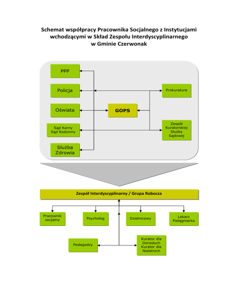 Schemat współpracy Pracownika Socjalnego z Instytucjami wchodzącymi w Skład Zespołu Interdyscyplinarnego w Gminie Czerwonak PPP Policja Prokuratura Oświata GOPS Zespół Kuratorskiej SłuŜby Sądowej Sąd Karny Sąd Rodzinny SłuŜba Zdrowia Zespół Interdyscyplinarny / Grupa Robocza Pracownik socjalny Psycholog Pedagodzy Dzielnicowy Kurator dla Dorosłych Kurator dla Nieletnich Lekarz Pielęgniarka