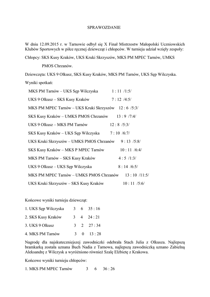 SPRAWOZDANIE W dniu 12.09.2015 r. w Tarnowie odbył się X Finał Mistrzostw Małopolski Uczniowskich Klubów Sportowych w piłce ręcznej dziewcząt i chłopców. W turnieju udział wzięły zespoły: Chłopcy: SKS Kusy Kraków, UKS Kruki Skrzyszów, MKS PM MPEC Tarnów, UMKS PMOS Chrzanów. Dziewczęta: UKS 9 Olkusz, SKS Kusy Kraków, MKS PM Tarnów, UKS Sęp Wilczyska. Wyniki spotkań: MKS PM Tarnów – UKS Sęp Wilczyska 1 : 11 /1:5/ UKS 9 Olkusz – SKS Kusy Kraków 7 : 12 /4:5/ MKS PM MPEC Tarnów – UKS Kruki Skrzyszów SKS Kusy Kraków – UMKS PMOS Chrzanów 12 : 6 /5:3/ 13 : 9 /7:4/ UKS 9 Olkusz – MKS PM Tarnów 12 : 8 /5:3/ SKS Kusy Kraków – UKS Sęp Wilczyska 7 : 10 /6:7/ UKS Kruki Skrzyszów – UMKS PMOS Chrzanów 9 : 13 /5:8/ SKS Kusy Kraków – MKS P MPEC Tarnów 10 : 11 /6:4/ MKS PM Tarnów – SKS Kusy Kraków 4 : 5 /1:3/ UKS 9 Olkusz – UKS Sęp Wilczyska 8 : 14 /6:5/ MKS PM MPEC Tarnów – UMKS PMOS Chrzanów UKS Kruki Skrzyszów – SKS Kusy Kraków 13 : 10 /11:5/ 10 : 11 /5:6/ Końcowe wyniki turnieju dziewcząt: 1. UKS Sęp Wilczyska 3 6 35 : 16 2. SKS Kusy Kraków 3 4 24 : 21 3. UKS 9 Olkusz 3 2 27 : 34 4. MKS PM Tarnów 3 0 13 : 28 Nagrodę dla najskuteczniejszej zawodniczki odebrała Stach Julia z Olkusza. Najlepszą bramkarką została uznana Buch Nadia z Tarnowa, najlepszą zawodniczką uznano Zabielną Aleksandrę z Wilczysk a wyróżniono również Szalę Elżbietę z Krakowa. Końcowe wyniki turnieju chłopców: 1. MKS PM MPEC Tarnów 3 6 36 : 26 2. SKS Kusy Kraków 3 4 34 : 30 3. UMKS PMOS Chrzanów 3 2 32 : 35 4. UKS Kruki Skrzyszów 3 0 25 : 36 Królem strzelców turnieju został Hardzina Marcin z Chrzanowa, najlepszym bramkarzem został Chłopek Mateusz z Tarnowa, najlepszym zawodnikiem Jarosz Filip z Krakowa. Wyróżnienie otrzymał również Sikora Jakub z Tarnowa. Organizatorami Mistrzostw byli: Małopolski Związek Piłki Ręcznej w Krakowie oraz MKS PM Tarnów. Wszyscy uczestnicy turnieju otrzymali pamiątkowe upominki a najlepsze zespoły okolicznościowe medale. Nagrody rzeczowe otrzymały najlepsze zawodniczki i zawodnicy turnieju. Nie zapomniano również o trenerach, którzy za swoją pracę również otrzymali pamiątkowe upominki. Wszystkie nagrody rzeczowe zostały ufundowane przez Marszałka Województwa Małopolskiego, Prezydenta Miasta Tarnowa, Związek Piłki Ręcznej w Polsce, Małopolski Związek Piłki Ręcznej w Krakowie oraz MKS PM Tarnów. Podziękowania należą się sędziom turnieju oraz P. Krzysztofowi Janasowi, który z ramienia MKS PM Tarnów zajął się przygotowaniem i prawidłowym przebiegiem turnieju. Należy również podkreślić bardzo dobrą atmosferę w trakcie mistrzostw oraz wysoki poziom sportowy jaki zaprezentowały poszczególne zespoły. Pomimo wielu zaciętych pojedynków nie zanotowano żadnych kontuzji. Medale oraz nagrody rzeczowe zwycięskim zespołom oraz najlepszym zawodniczkom i zawodnikom wręczyli: Prezes MZPR w Krakowie Zbigniew Gorączko oraz V-ce Prezes MZPR Włodzimierz Łabno. Sędzia Główny Turnieju Włodzimierz Łabno