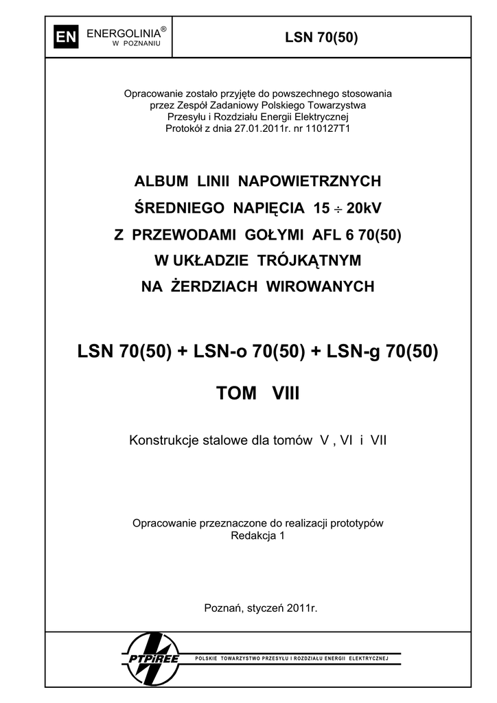 EN ENERGOLINIA® W POZNANIU LSN 70(50) Opracowanie zostaáo przyjĊte do powszechnego stosowania przez Zespóá Zadaniowy Polskiego Towarzystwa Przesyáu i Rozdziaáu Energii Elektrycznej Protokóá z dnia 27.01.2011r. nr 110127T1 ALBUM LINII NAPOWIETRZNYCH ĝREDNIEGO NAPIĉCIA 15 y 20kV Z PRZEWODAMI GOàYMI AFL 6 70(50) W UKàADZIE TRÓJKĄTNYM NA ĩERDZIACH WIROWANYCH LSN 70(50) + LSN-o 70(50) + LSN-g 70(50) TOM VIII Konstrukcje stalowe dla tomów V , VI i VII Opracowanie przeznaczone do realizacji prototypów Redakcja 1 PoznaĔ, styczeĔ 2011r. POLSKIE TOWARZYSTWO PRZESYáU I ROZDZIAáU ENERGII ELEKTRYCZNEJ EN ENERGOLINIA W POZNANIU LSN 70(50) Oferta PTPiREE w zakresie opracowaĔ typizacyjnych 01/1998 - Albumy linii napowietrznych niskiego napiĊcia z przewodami goáymi AL 25-95 mm2 na Īerdziach wirowanych Lnn 02/1999 - Albumy linii napowietrznych wielotorowych niskiego napiĊcia z przewodami izolowanymi samonoĞnymi o przekroju 25-120 mm2 Lnni 03/1999 - Album przyáączy napowietrznych i kablowych niskiego napiĊcia Lnn-pi 04/2000 - Album linii napowietrznych niskiego napiĊcia Lnn + Lnni z przewodami izolowanymi samonoĞnymi AsXS i AsXSn na istniejących liniach niskiego napiĊcia z przewodami goáymi na sáupach z Īerdzi ĩN 05/1998 - Albumy sáupowych stacji transformatorowych typu STSR na Īerdziach wirowanych 21/2007 - Album sáupowych stacji transformatorowych SN/nn STN, STNu z transformatorami o mocy do 630 kVA na Īerdziach wirowanych 06/2001 - Albumy sáupowych stacji transformatorowych typu STSd na Īerdziach drewnianych 07/2002 - Albumy linii napowietrznych Ğredniego napiĊcia 15-20 kV z przewodami goáymi w ukáadzie trójkątnym na Īerdziach wirowanych typu E i ELV LSN 35(50) i 70(50) 24/2011 - Albumy linii napowietrznych Ğredniego napiĊcia 15-20 kV z przewodami goáymi w ukáadzie trójkątnym na Īerdziach wirowanych typu E i ELV LSN 35(50) i 70(50) 08/2000 - Albumy linii napowietrznych Ğredniego napiĊcia 15-20 kV z przewodami goáymi w ukáadzie páaskim na Īerdziach wirowanych LSN 70 (50) 23/2008 - Albumy linii napowietrznych Ğredniego napiĊcia 15-20 kV z przewodami goáymi w ukáadzie páaskim na Īerdziach wirowanych LSN 70 (50) 09/1998 - Albumy linii napowietrznych Ğredniego napiĊcia 15-20 kV z przewodami goáymi na Īerdziach wirowanych LSN 120 (70) - ukáad przewodów páaski i trójkątny 14/2001 - Albumy linii dwutorowych Ğredniego napiĊcia 15-20 kV z przewodami goáymi na Īerdziach wirowanych LSN 12/2000 - Albumy sáupów z rozáącznikami sterowanymi radiowo dla linii Ğredniego napiĊcia 15-20 kV 13/2001 - Album linii napowietrznych Ğredniego napiĊcia 15-20 kV z przewodami goáymi w ukáadzie trójkątnym na Īerdziach drewnianych LSNd 35 (50) 70 22/2008 - Album punktów pomiarowych w liniach napowietrznych Ğredniego napiĊcia 15÷20 kV LSN – PR 10/2003 - Albumy linii napowietrznych Ğredniego napiĊcia 15-20 kV z przewodami niepeánoizolowanymi LSNi 50÷120 na Īerdziach wirowanych – ukáad przewodów páaski i pionowy 11/2005 - Albumy linii napowietrznych dwutorowych Ğredniego napiĊcia 15-20 kV z przewodami niepeánoizolowanymi o przekrojach 2x70÷120 mm2 w ukáadzie pionowym na Īerdziach wirowanych 15/2005 - Albumy linii napowietrznych dwunapiĊciowych Ğredniego napiĊcia z przewodami niepeánoizolowanych i peánoizolowanymi niskiego napiĊcia z przewodami izolowanymi na Īerdziach wirowanych LSNi + LnNi 20/2007 - Albumy linii napowietrznych Ğredniego napiĊcia 15 y 20 kV z przewodami niepeánoizolowanymi w ukáadzie pionowym na Īerdziach drewnianych LSNid 50y120 16/1996 - Albumy linii napowietrznych izolowanych Ğredniego i niskiego napiĊcia LSNi / SAXKA + Lnni 18/1999 - Katalog oĞwietlenia ulicznego 19/1998 - Katalogi sáupów i fundamentów linii 110 kV Peána informacja na temat wydawnictw PTPiREE zamieszczona zostaáa na stronach www PTPiREE o adresie: www.ptpiree.pl w dziale „Oferta” / „Wydawnictwa” Rozpowszechnianie: Polskie Towarzystwo Przemysáu i Rozdziaáu Energii Elektrycznej w Poznaniu ul. WoáyĔska 22, 60 – 637 PoznaĔ tel. +48 61 846-02-33, fax +48 61 846-02-09 Powielanie i rozpowszechnianie powyĪszych opracowaĔ bez zgody Polskiego Towarzystwa Przesyáu i Rozdziaáu Energii Elektrycznej oraz zespoáu autorskiego jest wzbronione. POLSKIE TOWARZYSTWO PRZESYáU I ROZDZIAáU ENERGII ELEKTRYCZNEJ EN ENERGOLINIA® LSN 70(50) W POZNANIU Wydawca opracowania Polskie Towarzystwo Przesyáu i Rozdziaáu Energii Elektrycznej ul. WoáyĔska 22, 60-637 PoznaĔ tel. +48 61 846 02 00, fax. +48 61 846 02 09 www.ptpiree.pl, e-mail: [email protected] Rozpowszechnianie albumów Biuro Polskiego Towarzystwa Przesyáu i Rozdziaáu Energii Elektrycznej ul. WoáyĔska 22, 60-637 PoznaĔ tel. +48 61 846 02 33, fax. +48 61 846 02 09 e-mail: [email protected] Powielanie i rozpowszechnianie opracowania bez zgody Polskiego Towarzystwa Przesyáu i Rozdziaáu Energii Elektrycznej jest wzbronione Autor opracowania EN £ ENERGOLINIA spóáka z o.o. ul. Kramarska 26, 61-765 PoznaĔ tel./fax. +48 61 852 46 63 e-mail: [email protected] NIP 778-01-62-287 REGON 630174554 Zespóá autorski: inĪ. Czesáaw Olejniczak mgr inĪ. Rafaá Nowicki tech. Andrzej Kubiak mgr inĪ. Rafaá Trafny POLSKIE TOWARZYSTWO PRZESYáU I ROZDZIAáU ENERGII ELEKTRYCZNEJ EN ENERGOLINIA W POZNANIU LSN 70(50) Spis tomów Tom I - Album linii napowietrznych Ğredniego napiĊcia 15 y 20kV z przewodami goáymi na Īerdziach wirowanych LSN 35(50) - Przewody AFL-6 35 i 50mm2 - Ukáad trójkątny Tom II - Album sáupów z odáącznikami i rozáącznikami dla linii napowietrznych Ğredniego napiĊcia 15 y 20kV z przewodami goáymi na Īerdziach wirowanych LSN-o 35(50) - Przewody AFL-6 35 i 50mm2 - Ukáad trójkątny Tom III - Album sáupów z gáowicami kablowymi, odáącznikami i rozáącznikami dla linii napowietrznych Ğredniego napiĊcia 15 y 20kV z przewodami goáymi na Īerdziach wirowanych LSN-g 35(50) - Przewody AFL-6 35 i 50mm2 - Ukáad trójkątny Tom IV - Alb