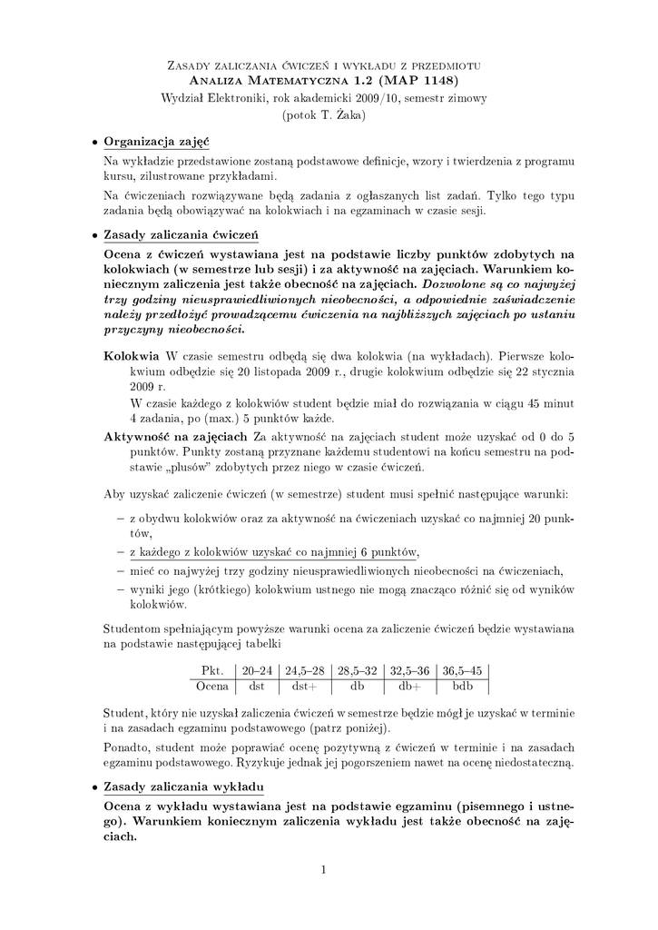 Zasady zaliczania ¢wicze« i wykªadu z przedmiotu Analiza Matematyczna 1.2 (MAP 1148) Wydziaª Elektroniki, rok akademicki 2009/10, semestr zimowy (potok T. aka) • Organizacja zaj¦¢ Na wykªadzie przedstawione zostan¡ podstawowe denicje, wzory i twierdzenia z programu kursu, zilustrowane przykªadami. Na ¢wiczeniach rozwi¡zywane b¦d¡ zadania z ogªaszanych list zada«. Tylko tego typu zadania b¦d¡ obowi¡zywa¢ na kolokwiach i na egzaminach w czasie sesji. • Zasady zaliczania ¢wicze« Ocena z ¢wicze« wystawiana jest na podstawie liczby punktów zdobytych na kolokwiach (w semestrze lub sesji) i za aktywno±¢ na zaj¦ciach. Warunkiem koniecznym zaliczenia jest tak»e obecno±¢ na zaj¦ciach. Dozwolone s¡ co najwy»ej trzy godziny nieusprawiedliwionych nieobecno±ci, a odpowiednie za±wiadczenie nale»y przedªo»y¢ prowadz¡cemu ¢wiczenia na najbli»szych zaj¦ciach po ustaniu przyczyny nieobecno±ci. Kolokwia W czasie semestru odb¦d¡ si¦ dwa kolokwia (na wykªadach). Pierwsze kolokwium odb¦dzie si¦ 20 listopada 2009 r., drugie kolokwium odb¦dzie si¦ 22 stycznia 2009 r. W czasie ka»dego z kolokwiów student b¦dzie miaª do rozwi¡zania w ci¡gu 45 minut 4 zadania, po (max.) 5 punktów ka»de. Aktywno±¢ na zaj¦ciach Za aktywno±¢ na zaj¦ciach student mo»e uzyska¢ od 0 do 5 punktów. Punkty zostan¡ przyznane ka»demu studentowi na ko«cu semestru na podstawie plusów zdobytych przez niego w czasie ¢wicze«. Aby uzyska¢ zaliczenie ¢wicze« (w semestrze) student musi speªni¢ nast¦puj¡ce warunki: z obydwu kolokwiów oraz za aktywno±¢ na ¢wiczeniach uzyska¢ co najmniej 20 punktów, z ka»dego z kolokwiów uzyska¢ co najmniej 6 punktów, mie¢ co najwy»ej trzy godziny nieusprawiedliwionych nieobecno±ci na ¢wiczeniach, wyniki jego (krótkiego) kolokwium ustnego nie mog¡ znacz¡co ró»ni¢ si¦ od wyników kolokwiów. Studentom speªniaj¡cym powy»sze warunki ocena za zaliczenie ¢wicze« b¦dzie wystawiana na podstawie nast¦puj¡cej tabelki Pkt. 2024 24,528 28,532 32,536 36,545 Ocena dst dst+ db db+ bdb Student, który nie uzyskaª zaliczenia ¢wicze« w semestrze b¦dzie mógª je uzyska¢ w terminie i na zasadach egzaminu podstawowego (patrz poni»ej). Ponadto, student mo»e poprawia¢ ocen¦ pozytywn¡ z ¢wicze« w terminie i na zasadach egzaminu podstawowego. Ryzykuje jednak jej pogorszeniem nawet na ocen¦ niedostateczn¡. • Zasady zaliczania wykªadu Ocena z wykªadu wystawiana jest na podstawie egzaminu (pisemnego i ustnego). Warunkiem koniecznym zaliczenia wykªadu jest tak»e obecno±¢ na zaj¦ciach. 1 Termin zerowy Student, który speªniª nast¦puj¡ce warunki: ∗ z obydwu kolokwiów oraz za aktywno±¢ na ¢wiczeniach uzyskaª co najmniej 20 punktów, ∗ ∗ z ka»dego z kolokwiów uzyskaª co najmniej 6 punktów, miaª co najwy»ej trzy godziny nieusprawiedliwionych nieobecno±ci na ¢wiczeniach, ∗ wyniki jego (krótkiego) egzaminu ustnego nie ró»ni¡ si¦ znacz¡co od wyników kolokwiów, b¦dzie zwolniony z egzaminu z nast¦puj¡c¡ ocen¡ Pkt. 2024 24,528 28,532 32,536 36,545 Ocena dst dst+ db db+ bdb Student mo»e poprawia¢ powy»sz¡ ocen¦ pozytywn¡ w terminie i na zasadach egzaminu podstawowego. Ryzykuje jednak jej pogorszeniem nawet na ocen¦ niedostateczn¡. Egzaminy w sesji W czasie sesji zorganizowane zostan¡ dwa egzaminy: 28 stycznia 2010 r. i 9 lutego 2010 r. W czasie ka»dego z nich, w ci¡gu 120 minut student b¦dzie miaª do rozwi¡zania 6 zada«, po (max.) 5 punktów ka»de. Do wyniku z egzaminu doliczane b¦dzie 50% wszystkich punktów zdobytych w semestrze, nie wi¦cej jednak ni» 10 punktów. Ocena cz¦±ci pisemnej wystawiana b¦dzie na podstawie nast¦puj¡cej tabeli Pkt. 019,5 2025 25,530,5 3134 34,536,5 3740 Ocena ndst dst dst+ db db+ bdb Ocena ta stanowi wraz z egzaminem ustnym podstaw¦ do wystawienia oceny z egzaminu. • Uwagi Na kolokwiach i egzaminach trzeba mie¢ przy sobie dokument potwierdzaj¡cy to»- samo±¢. Kolokwia i egzaminy musz¡ by¢ pisane samodzielnie. W ka»dym wypadku prowadz¡cy ma prawo do werykacji oceny za pomoc¡ egzaminu ustnego. Student, który dopu±ci sie oszustwa (podrzucenie pracy, korzystanie z telefonu komórkowego, podstawienie innej osoby, itp.) otrzymuje ocen¦ niedostateczn¡ i traci prawo do pisania kolejnych kolokwiów (egzaminów). W przypadku usprawiedliwionej nieobecno±ci na kolokwium czy egzaminie, przy czym odpowiednie za±wiadczenie przedªo»one zostaªo prowadz¡cemu ¢wiczenia lub wykªadowcy na pierwszych zaj¦ciach lub konsultacjach po zako«czeniu zwolnienia, studentowi przysªuguje dodatkowy termin. 2