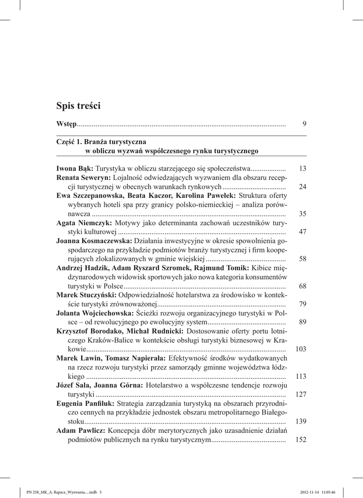 Spis treści Wstęp................................................................................................................. 9 Część 1. Branża turystyczna w obliczu wyzwań współczesnego rynku turystycznego Iwona Bąk: Turystyka w obliczu starzejącego się społeczeństwa.................... Renata Seweryn: Lojalność odwiedzających wyzwaniem dla obszaru recepcji turystycznej w obecnych warunkach rynkowych................................... Ewa Szczepanowska, Beata Kaczor, Karolina Pawełek: Struktura oferty wybranych hoteli spa przy granicy polsko-niemieckiej – analiza porównawcza......................................................................................................... Agata Niemczyk: Motywy jako determinanta zachowań uczestników turystyki kulturowej........................................................................................... Joanna Kosmaczewska: Działania inwestycyjne w okresie spowolnienia gospodarczego na przykładzie podmiotów branży turystycznej i firm kooperujących zlokalizowanych w gminie wiejskiej............................................ Andrzej Hadzik, Adam Ryszard Szromek, Rajmund Tomik: Kibice międzynarodowych widowisk sportowych jako nowa kategoria konsumentów turystyki w Polsce........................................................................................ Marek Stuczyński: Odpowiedzialność hotelarstwa za środowisko w kontekście turystyki zrównoważonej...................................................................... Jolanta Wojciechowska: Ścieżki rozwoju organizacyjnego turystyki w Polsce – od rewolucyjnego po ewolucyjny system........................................... Krzysztof Borodako, Michał Rudnicki: Dostosowanie oferty portu lotniczego Kraków-Balice w kontekście obsługi turystyki biznesowej w Krakowie............................................................................................................ Marek Lawin, Tomasz Napierała: Efektywność środków wydatkowanych na rzecz rozwoju turystyki przez samorządy gminne województwa łódzkiego............................................................................................................ Józef Sala, Joanna Górna: Hotelarstwo a współczesne tendencje rozwoju turystyki....................................................................................................... Eugenia Panfiluk: Strategia zarządzania turystyką na obszarach przyrodniczo cennych na przykładzie jednostek obszaru metropolitarnego Białegostoku............................................................................................................. Adam Pawlicz: Koncepcja dóbr merytorycznych jako uzasadnienie działań podmiotów publicznych na rynku turystycznym......................................... PN 258_MK_A. Rapacz_Wyzwania.....indb 5 13 24 35 47 58 68 79 89 103 113 127 139 152 2012-11-14 11:05:46 6 Spis treści Dawid Milewski: Postulaty przewozowe jako cechy jakości przewozów turystycznych..................................................................................................... 161 Marlena Prochorowicz, Bogusław Stankiewicz: Zachowania koksumentów na rynku usług agroturystycznych............................................................... 172 Część 2. Współpraca sektorowa warunkiem realizacji celów i zadań polityki turystycznej na poziomie lokalnym i regionalnym Arkadiusz Niedziółka: Stan i uwarunkowania rozwoju agroturystyki w powiecie nowotarskim z wyszczególnieniem gminy Czorsztyn..................... Joanna Kizielewicz: Partnerstwo na rzecz rozwoju polityki turystycznej w województwach nadmorskich w Polsce.................................................. Michał Żemła, Anna Staszewska: Rola interesariuszy w budowie konkurencyjnych produktów turystycznych na podstawie Szlaku Zabytków Techniki Województwa Śląskiego.......................................................................... Włodzimierz Banasik, Dagmara Fiszer: Turystka w rozwoju społeczno-gospodarczym miasta Żyrardowa.................................................................... Maciej Dębski: Architektura marki jako narzędzie budowania konkurencyjności destynacji turystycznych.................................................................... Romuald Ziółkowski: Turystyczna Sieć Współpracy – doświadczenia w zakresie budowy klastrów turystycznych........................................................ Agata Balińska, Weronika Cieśluk: Marka w tworzeniu turystycznego wizerunku miasta Ełk...................................................................................... Teresa Żabińska: Turystyka kreatywna. Koncepcja i możliwości rozwoju w Polsce....................................................................................................... Stefan Bosiacki, Agata Basińska-Zych: Rola samorządu lokalnego w rozwoju turystyki w warunkach kryzysu ekonomicznego – na przykładzie województwa wielkopolskiego.................................................................... 187 196 209 219 228 240 251 260 271 Summaries Iwona Bąk: Tourism in the face of an aging society........................................ Renata Seweryn: The loyalty of visitors as a challenge for the tourist destination area in current market conditions......................................................... Ewa Szczepanowska, Beata Kaczor, Karolina Pawełek: The comparison of offers in selected spa centers at the Polish-German border – comparable analysis........................................................................................................ Agata Niemczyk: Motives as a behaviour determinant of participants of culture tourism.................................................................................................. Joanna Kosmaczewska: Investment activities in the economic slowdown period on the example of entities operating in the tourism sector and cooperating companies located in the rur