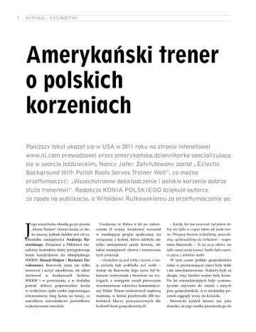 1 HIPIKA – SYLWETKI Amerykaƒski trener o polskich korzeniach Poni˝szy tekst ukaza∏ si´ w USA w 2011 roku na stronie intenetowej www.nj.com prowadzonej przez amerykaƒskà dziennikark´ specjalizujacà si´ w sporcie jeêdzieckim, Nancy Jafer. Zatytu∏owany zosta∏ „Eclectic Background With Polish Roots Serves Trainer Well“, co mo˝na przet∏umaczyç: „Wszechstronne doÊwiadczenie i polskie korzenie dobrze s∏u˝à trenerowi“. Redakcja KONIA POLSKIEGO dzi´kuje autorce za zgod´ na publikacj´, a Witoldowi Rutkowskiemu za przet∏umaczenie go. ego wizytówka okreÊla go po prostu „Horse Trainer“ (trener koni), co du˝o znaczy, jednak dalekie jest od ca∏okszta∏tu umiej´tnoÊci Andrzeja Kurowskiego. Zwiàzany z Pittstown niezale˝ny instruktor, który przygotowuje konie kandydatom do olimpijskiego WKKW: Sinead Halpin i Buckowi Davidsonowi, Kurowski umie nie tylko trenowaç i uczyç uje˝d˝enia, ale tak˝e startowa∏ w konkursach skoków, WKKW i w powo˝eniu, a w dodatku potrafi dobrze poprowadziç konia w wolty˝erce (jako osoba zapewniajàca równomierny bieg konia na lon˝y, co umo˝liwia zawodnikowi prawid∏owe wykonywanie çwiczeƒ). J Urodzony w Polsce 6 lat po zakoƒczeniu II wojny Êwiatowej wzrasta∏ w zanikajàcej grupie spo∏ecznej, tej zwiàzanej z koƒmi, która zdoby∏a nie tylko umiej´tnoÊç jazdy konnej, ale tak˝e umiej´tnoÊç chowu i trenowania tych zwierzàt. – Urodzi∏em si´ pod torbà z owsem, a mojà pieluchà by∏a podk∏adka pod siod∏o – Êmieje si´ Kurowski. Jego ojciec by∏ lekarzem weterynarii i trenerem na wyÊcigach, a nast´pnie zosta∏ pierwszym wiceministrem rolnictwa komunistycznej Polski. Potem nadzorowa∏ rzàdowà stadnin´, w której przebywa∏o 200 trakeƒskich klaczy przeznaczonych dla hodowli koni goràcokrwistych1. – Ka˝dy, kto tam pracowa∏, by∏ potem dobry nie tylko w czymÊ takim jak jazda konna. Wszyscy bowiem jeêdziliÊmy, powoziliÊmy, opiekowaliÊmy si´ êrebi´tami – wspomina Kurowski. – To ci´ uczy ca∏oÊci, nie tylko samej jazdy konnej, hipika by∏a czymÊ, co pijesz z mlekiem matki. W tym czasie polskie gospodarstwa rolne w przewa˝ajàcej cz´Êci by∏y ma∏e i nie zmechanizowane. Traktory by∏y za drogie, wi´c bardzo wa˝ne by∏y konie. Do lat osiemdziesiàtych by∏y systematycznie u˝ywane do orania i innych prac gospodarskich. A w niedzielny poranek ciàgn´∏y wozy do koÊcio∏a. Kurowski jeêdzi∏ konno ju˝ jako dziecko, a˝ jego matka przenios∏a go do 2 DoÊwiadczenie nabyte w Polsce uczyni∏o Andrzeja Kurowskiego wszechstronnym specjalistà od koni, który jest wra˝liwym nauczycielem i trenerem. Na zdj´ciu Andrzej Kurowski, a za nim Sinead Halpin na koniu Manoir de Carneville Warszawy w nadziei, ˝e lepiej b´dzie dla niego jak zacznie robiç coÊ innego. Gdy mia∏em 16 lat, poszed∏em na tor wyÊcigowy, gdzie mój ojciec by∏ szefem i tam zaczà∏em jeêdziç w rannych galopach przed lekcjami w szkole, braç udzia∏ w steeplach – mówi. To przywiàza∏o go do koni na ca∏e ˝ycie. Jego pierwszy trener w dyscyplinie uje˝d˝ania pracowa∏ z Georgem Theodorescu, który raz pe∏ni∏ funkcj´ szefa dru˝yny USA w uje˝d˝eniu. Kurowski spotka∏ tego trenera w swojej dalszej karierze, kiedy kierowa∏ polskà dru˝ynà jeêdzieckà. Jako cz∏onek kadry narodowej, który znalaz∏ si´ na d∏ugiej liÊcie na olimpiad´ w 1980 r., Kurowski zosta∏ zdruzgotany przez osobistà tragedi´, kiedy jego ˝ona zmar∏a po wypadku w stajni w 1979 roku. By∏em jakby ju˝ zniszczony – powiedzia∏ Kurowski. Jego konie by∏y w∏asnoÊcià totalitarnego rzàdu, a on, co zrozumia∏e, czu∏ si´ nieswojo, kiedy wymagano od niego informacji na temat post´powania innych cz∏onków dru˝yny. W koƒcu rzàd pominà∏ jego konie i nie znalaz∏ si´ na krótkiej liÊcie olimpijskiej. W swojej dalszej dzia∏alnoÊci kupi∏ gospodarstwo rolno-hodowlane w Polsce, ale jego wizyta u jednej z jego sióstr, które wyemigrowa∏y wczeÊniej do Kalifornii, odmieni∏a jego ˝ycie. Przyjació∏ka jednej z jego sióstr powiedzia∏a jej o „pewnej kobiecie, która mia∏a trudnoÊci z wprowadzeniem konia do przyczepy.“ Siostra Kurowskiego zasugerowa∏a jej, ˝e on w∏aÊnie mo˝e w tym pomóc. Kiedy wszed∏ do stajni, natychmiast rozpozna∏ konia. – To jest polski koƒ z czterokonnego zaprz´gu, czasami siedzia∏em na wozie przez ten zaprz´g ciàgni´tym – powiedzia∏. Znam tego konia, to Dorog. Wezm´ go, wprowadz´ do przyczepy i mam prac´ – pomyÊla∏. I tak si´ sta∏o. Kurowski zosta∏ zatrudniony przez „pewnà panià“, którà okaza∏a si´ Phoebe Hearst ze znanej rodziny prasowej. Najpierw pracowa∏ w jej jeêdzieckim programie terapeutycznym i mia∏ problem, poniewa˝ nie zna∏ 3 HIPIKA – SYLWETKI angielskiego. Ale mia∏ w lewej kieszeni waç indywidualne doskonalenie ka˝dego karteczk´, na której by∏o napisane go left z nich. Poniewa˝ konie reagowa∏y na jego (w lewo), a w swojej prawej kieszeni starannie zaplanowane çwiczenia, ich zaufakarteczk´ go right (w prawo). Kiedy wi´c nie i poziom uje˝d˝enia znacznie si´ poprachcia∏, aby osoba, z którà w∏aÊnie wspó∏wi∏y, a z tym powróci∏a moja wiara w siebie. pracowa∏, pojecha∏a w lewo, wyciàga∏ – powiedzia∏a Furlong, która teraz z poz w∏aÊciwej kieszeni karteczk´ i na g∏os wodzeniem uczestniczy w czwartym jà odczytywa∏. poziomie konkursów uje˝d˝enia2 na Hearst mia∏a tak˝e program zwiàzany jednym ze swoich koni. z wolty˝erkà, w którym on tak˝e On otworzy∏ mi oczy na zupe∏nie inny pouczestniczy∏. Tam spotka∏, dzieckiem ziom jazdy konnej,...kiedy patrz´ jak on dojeszcze b´dàcego, Devona Maitozo, któsiada moich koni, one zawsze wydajà si´ spory kontynuowa∏ çwiczenia w tej dyscykojne i szcz´Êliwe, ˝e pod nim pracujà. On plinie a˝ do zdobywania z∏otych medajest geniuszem. li olimpijskich dla Stanów 