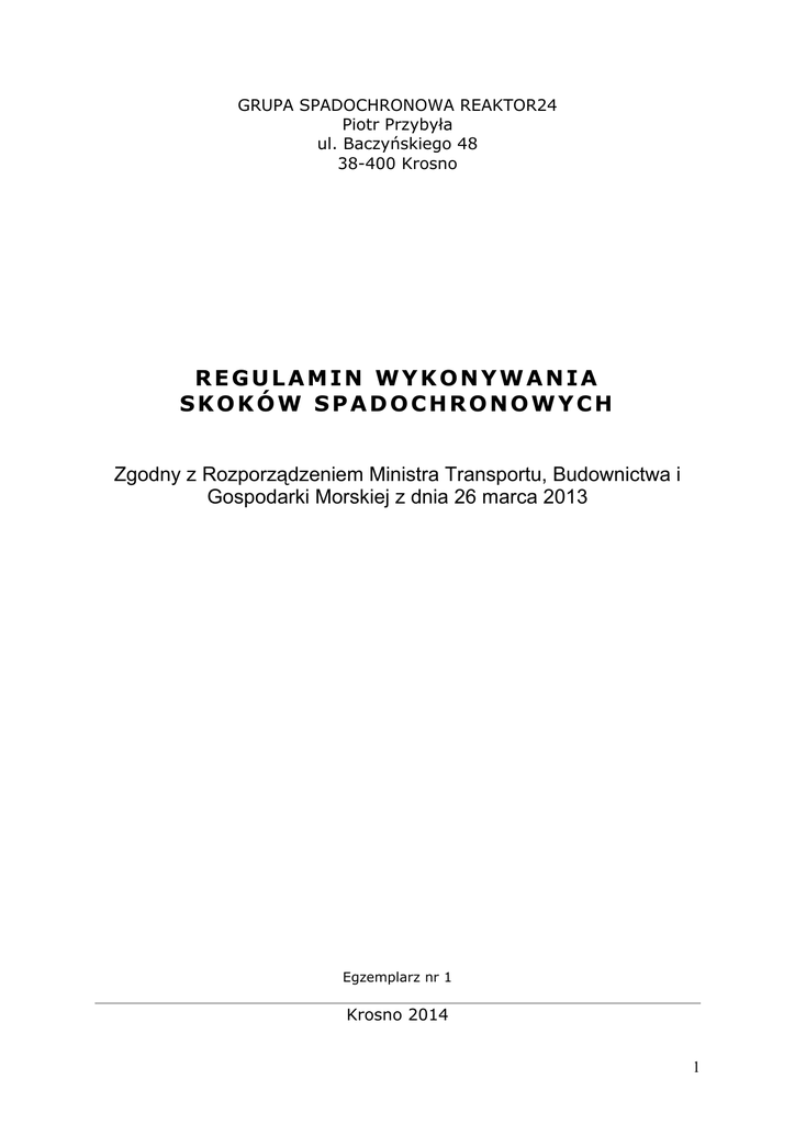 GRUPA SPADOCHRONOWA REAKTOR24 Piotr Przybyła ul. Baczyńskiego 48 38-400 Krosno REGULAMIN WYKONYWANIA SKOKÓW SPADOCHRONOWYCH Zgodny z Rozporządzeniem Ministra Transportu, Budownictwa i Gospodarki Morskiej z dnia 26 marca 2013 Egzemplarz nr 1 Krosno 2014 1 POŚWIADCZENIE ZATWIERDZENIA REGULAMINU WYKONYWANIA SKOKÓW ZATWIERDZAM ...................................................................... Właściciel Grupy Spadochronowej REAKTOR24 Piotr Przybyła Krosno 04.04.2014 r. 2 REGULAMIN OBOWIĄZUJĄCY NA STREFIE REAKTOR24 Osoby funkcyjne na Strefie Grupy Spadochronowej Reaktor24 WłaścicielStrefy/Kierownik Szkolenia Piotr Przybyła Szkolenie SL Łukasz Jarosz, Grzegorz Zajchowski Szkolenie AFF Technika Spadochronowa Marketing, organizacja Kierownik skoków Stanisław Blezień Jacek Zych , Grzegorz Zajchowski Anna Dzwolak Piotr Przybyła , Grzegorz Zajchowski , Łukasz Jarosz Lista instruktorów: Piotr Przybyła Grzegorz Zajchowski Łukasz Jarosz Stanisław Bezień instruktor ,SL, tandem ,KS Instruktor, SL, tandem, rigger, KS Instruktor, SL, kamera, KS Instruktor, SL, AFF, kamera, KS 2. Rodzaj skoków wykonywanych na Strefie skoki szkolne metodą SL wg. zad SL- I/1 do SL-II/9 skoki szkolne metodą AFF wg .zad. AFF-1 do AFF-5 skoki szkolne do Świadectwa Kwalifikacji Skoczka Spadochronowego PJ "B", nadzorowane przez instruktorów, po ukończeniu podstawowego Szkolenia spadochronowego, wg Programu Szkolenia Spadochronowego, skoki podnoszące poziom kwalifikacji do Świadectwa Kwalifikacji PJ "C" (wyrzucający i udział w pokazach lotniczych) skoki podnoszące poziom kwalifikacji do Świadectwa Kwalifikacji PJ "D" (organizator skoków); skoki treningowe dla osób posiadających Świadectwa Kwalifikacji Skoczka Spadochronowego PJ wszystkich kategorii skoki metodyczne na kursach i seminariach instruktorskich do uprawnień na instruktora INS, instruktora AFF, TANDEM pilota i instruktora TANDEMOWEGO skoki z pasażerami - skoki tandemowe 3. Ruch kołowy i pieszy w rejonie wykonywania skoków ruch kołowy jest zabroniony, zakaz nie dotyczy samochodów służbowych przeznaczonych do zwożenia daleko lądujących skoczków, wjazdu samochodów ratowniczych typu karetka zdrowia lub straż pożarna ruch pieszy odbywa się w wyznaczonych miejscach (od linii ustawienia wylotu do samolotu na stojance), a skoczkowie wracający z lotniska po lądowaniu muszą zwrócić szczególną uwagę na przekraczanie pasów startu i lądowania statków powietrznych (na kierunkach 110-290 i 160-340, a informacja o aktualnie używanym pasie jest podawana tuż przed wylotem, w miejscu ustawienia wylotu), a także na lądujących skoczków obowiązuje całkowity ZAKAZ WSTĘPU, na obszar lądowania skoczków i kołowania statków powietrznych, osób nie związanych z działalnością spadochronową 4. Obecność na pokładzie statku powietrznego (poza załogą samolotu) Na pokład statku powietrznego mogą wejść TYLKO osoby wpisane na listę załadowczą: samodzielni skoczkowie posiadający Świadectwo Kwalifikacji PJ uczniowie skoczkowie po wpisaniu ich na listę załadowczą przez instruktora nadzorującego 3 - tandem piloci pasażerowie tandemowi po wpisaniu ich na listę załadowczą przez nadzorującego skok tandem pilota 5. Przygotowanie statku powietrznego do skoków - samolot C185F Statek powietrzny przystosowany do wywożenia skoczków posiada: przeszklone drzwi zabezpieczającą skoczków podczas naboru wysokości uzgodniony system sygnałów manualnych i głosowych, poprzez który załoga informuje skoczków o kursie, wysokości i miejscu wykonania skoków sygnały do opuszczenia pokładu samolotu podawane przez pilota głosowoimanualnie za gotowość samolotu do lotów ze skoczkami odpowiada załoga samolotu za przygotowanie samolotu do wykonywania skoków odpowiada Organizator skoków we współpracy ze służbami technicznymi właściciela samolotu 6. Przygotowanie statku powietrznego do skoków - samolot AN-2 i inne Statek powietrzny przystosowany do wywożenia skoczków posiada: żaluzję/drzwi/inne systemy zabezpieczające skoczków podczas naboru wysokości uzgodniony system sygnałów manualnych i głosowych, poprzez który załoga informuje skoczków o kursie, wysokości i miejscu wykonania skoków sygnały do opuszczenia pokładu samolotu podawane przez pilota poprzez sygnalizację świetlną i dźwiękową (o ile taka jest na wyposażeniu statku powietrznego) za gotowość samolotu do lotów ze skoczkami odpowiada załoga samolotu za przygotowanie samolotu do wykonywania skoków odpowiada Organizator skoków we współpracy ze służbami technicznymi właściciela samolotu 7. Kolejność wykonywania skoków Standardowa kolejność wyjścia z samolotu na strefie Grupy Spadochronowej Reaktor24 jest następująca (przy wyrzutach „pod wiatr”): celność static Line formacje płaskie, od grup największych do najmniejszych FF, od grup największych do najmniejszych skoczkowie wysoko otwierający się AFF tandemy Skoczkowie latający w “wingsuit” i "tracki" CRW ustalana jest indywidualnie a informacja o takiej formacji musi dotrzeć do załogi samolotu (wysokie otwarcia). Kolejność przy innych kierunkach wyrzutu ustala osoba wyznaczona przez Organizatora skoków 8. Planowany rejon skoków 4 Schemat lotniska Krosno(EPKR) 9. Minimalna planowana wysokość zawiśnięcia na otwartym spadochronie w zależności od rodzaju skoku skoki szkolne w procesie szkolenia wg zad. AFF-1 do AFF-5 - 1500 m - 1800 m skoki szkolne w procesie szkolenia wg zad. SL-1 do SL-9 - 800 m - 1500 m skoki szkolne w procesie szkolenia do Świadectwa Kwalifikacji - 800 m – 1 500 m skoki tandemowe - 1500 m skoki skoczków samodzielnych posiadających Świadectwo Kwalifikacji - 700 m 10. Strefy opadania, miejsce lądowania, kierunki podejść, lądowanie poza strefą Swobodne spadanie: zawsze pracuj na kierunku 90o od kierunku zrzutu. track’i powinny być wykonywane o 90o od kierunku zrzutu (chyba, że przed wylotem ustali