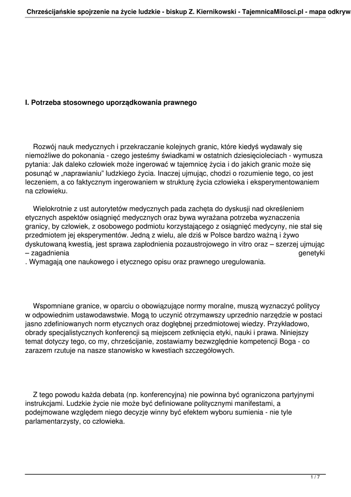 Chrześcijańskie spojrzenie na życie ludzkie - biskup Z. Kiernikowski - TajemnicaMilosci.pl - mapa odkrywa I. Potrzeba stosownego uporządkowania prawnego Rozwój nauk medycznych i przekraczanie kolejnych granic, które kiedyś wydawały się niemożliwe do pokonania - czego jesteśmy świadkami w ostatnich dziesięcioleciach - wymusza pytania: Jak daleko człowiek może ingerować w tajemnicę życia i do jakich granic może się posunąć w „naprawianiu” ludzkiego życia. Inaczej ujmując, chodzi o rozumienie tego, co jest leczeniem, a co faktycznym ingerowaniem w strukturę życia człowieka i eksperymentowaniem na człowieku. Wielokrotnie z ust autorytetów medycznych pada zachęta do dyskusji nad określeniem etycznych aspektów osiągnięć medycznych oraz bywa wyrażana potrzeba wyznaczenia granicy, by człowiek, z osobowego podmiotu korzystającego z osiągnięć medycyny, nie stał się przedmiotem jej eksperymentów. Jedną z wielu, ale dziś w Polsce bardzo ważną i żywo dyskutowaną kwestią, jest sprawa zapłodnienia pozaustrojowego in vitro oraz – szerzej ujmując – zagadnienia genetyki . Wymagają one naukowego i etycznego opisu oraz prawnego uregulowania. Wspomniane granice, w oparciu o obowiązujące normy moralne, muszą wyznaczyć politycy w odpowiednim ustawodawstwie. Mogą to uczynić otrzymawszy uprzednio narzędzie w postaci jasno zdefiniowanych norm etycznych oraz dogłębnej przedmiotowej wiedzy. Przykładowo, obrady specjalistycznych konferencji są miejscem zetknięcia etyki, nauki i prawa. Niniejszy temat dotyczy tego, co my, chrześcijanie, zostawiamy bezwzględnie kompetencji Boga - co zarazem rzutuje na nasze stanowisko w kwestiach szczegółowych. Z tego powodu każda debata (np. konferencyjna) nie powinna być ograniczona partyjnymi instrukcjami. Ludzkie życie nie może być definiowane politycznymi manifestami, a podejmowane względem niego decyzje winny być efektem wyboru sumienia - nie tyle parlamentarzysty, co człowieka. 1/7 Chrześcijańskie spojrzenie na życie ludzkie - biskup Z. Kiernikowski - TajemnicaMilosci.pl - mapa odkrywa Każdy zatem Parlamentarzysta w naszym kraju (i na całym świecie) powinien zadać sobie trud zdobycia jak najszerszej wiedzy dotyczącej omawianych kwestii, a liderzy polityczni winni umożliwić podjęcie członkom swych ugrupowań decyzji zgodnych z sumieniem. Życie ludzkie to wartość uniwersalna i niepodlegająca dyskusji. O jego ochronę i godność od poczęcia aż do naturalnej śmierci Kościół, ze zrozumiałych względów, zabiega. Nie może ono być rozpatrywane w kategoriach politycznych racji tego czy innego ugrupowania, a postawa wobec niego nie może być kalkulowana wynikami chwilowej popularności w sondażach. II. Chrześcijańskie spojrzenie na problematykę Biskup, który jest autorem niniejszego artykułu, nie uważa się ani za fachowca z dziedziny bioetyki, ani za eksperta w materii prawnego regulowania zapłodnienia pozaustrojowego in vitro. Podziela on pogląd, że nawet najdoskonalsze prawo stanowione przez człowieka, nie daje absolutnej gwarancji zabezpieczenia dobra i uniknięcia zła. Niemniej prawa i ustawy są konieczne. Chodzi o to, by one były jak najbardziej zbliżone do egzystencjalnej prawdy człowieka. Wtedy też prawa będą wspomagały ludzkie sumienia. Ostatecznie zaś właściwie uformowane sumienie daje gwarancję poszanowania drugiego człowieka – jego życia i jego godności. Jako Pasterz biskup ten patrzy na ludzkie problemy z perspektywy wiary i w świetle biblijnego, czyli Bożego, obrazu człowieka. 1. Problemu niepłodności jako krzyż Bezpłodność - i w konsekwencji bezdzietność - są równie ważnym, co i bolesnym doświadczeniem osób pragnących potomstwa, dlatego nie można tych spraw ani bagatelizować, ani szukać ich uproszczonych rozwiązań lub wykorzystywać je dla doraźnego czy to materialnego, czy politycznego interesu. Niepłodność i bezdzietność dla małżonków to niewątpliwy problem, ból - czasem łączący się z poczuciem bezsensowności życia. Wierzący 2/7 Chrześcijańskie spojrzenie na życie ludzkie - biskup Z. Kiernikowski - TajemnicaMilosci.pl - mapa odkrywa małżonkowie, dotknięci tym problemem, przyjmują go jako krzyż. Można powiedzieć dobitniej: mają taką szansę właśnie dzięki światłu Ewangelii. To z Ewangelii jawi się bowiem nowe Światło na wszystko, co ogranicza i doświadcza człowieka. To Światło pozwala więc inaczej spojrzeć na ten problem. Dla wierzącego bowiem krzyż to nie tylko coś, co krzyżuje i przekreśla, ale to także narzędzie zbawienia, innego pojmowania życia i odkrywania jego sensu. To otwieranie nowej, innej drogi, poszukiwanie zamysłu Bożego na drodze swego życia. Najważniejsze w tym jest otwarcie się na nadzieję, że przez krzyż Bóg mówi do człowieka. Każdy człowiek ma jakiś swój krzyż. Takim krzyżem może być dla kogoś również niepłodność. Dla wierzących zatem nie jest ona tragedią życiową, lecz stanowi wyzwanie, by odkrywając sens tego krzyża i dobrze ten krzyż przeżywając, wykorzystać go zarówno dla dobra własnego, jak i dla dobra innych. 2. Potrzeba niesienia odpowiedniej pomocy Doświadczonym w ten sposób małżeństwom konieczne jest niesienie pomocy, co Kościół ma na uwadze i taką pomoc chce ofiarowywać. Nie jest ona tego samego rodzaju, o jakim zazwyczaj się myśli w kontekście proponowanych czasem dzisiaj rozwiązań. Mimo rozpowszechnianych – i w pewnym sensie przez wielu bezkrytycznie przyjmowanych – opinii, że stosowanie zapłodnienia in vitro jest niby „najlepszym sposobem” niesienia pomocy w takich sytuacjach, istnieją racje zdecydowanie temu przeciwne. W ocenie Kościoła, kierującego się nauką Jezusa Chrystusa i uwzględniającego prawo naturalne, stosowanie tego rodzaju metody nie jest ani godziwe, ani nie prowadzi do właściwego zaradzenia istniejącemu problemowi. Jestem świadom, że takie
