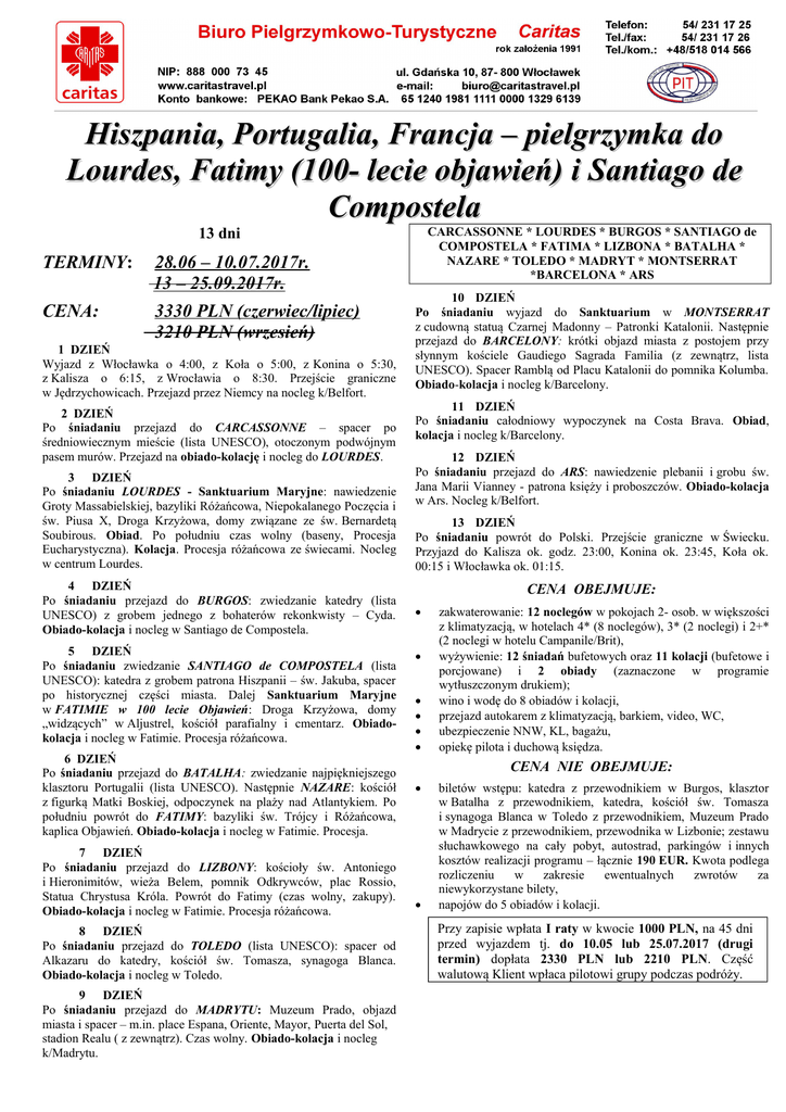 Hiszpania, Portugalia, Francja – pielgrzymka do Lourdes, Fatimy (100- lecie objawień) i Santiago de Compostela 13 dni TERMINY: CENA: 28.06 – 10.07.2017r. 13 – 25.09.2017r. 3330 PLN (czerwiec/lipiec) 3210 PLN (wrzesień) 1 DZIEŃ Wyjazd z Włocławka o 4:00, z Koła o 5:00, z Konina o 5:30, z Kalisza o 6:15, z Wrocławia o 8:30. Przejście graniczne w Jędrzychowicach. Przejazd przez Niemcy na nocleg k/Belfort. 2 DZIEŃ Po śniadaniu przejazd do CARCASSONNE – spacer po średniowiecznym mieście (lista UNESCO), otoczonym podwójnym pasem murów. Przejazd na obiado-kolację i nocleg do LOURDES. 3 DZIEŃ Po śniadaniu LOURDES - Sanktuarium Maryjne: nawiedzenie Groty Massabielskiej, bazyliki Różańcowa, Niepokalanego Poczęcia i św. Piusa X, Droga Krzyżowa, domy związane ze św. Bernardetą Soubirous. Obiad. Po południu czas wolny (baseny, Procesja Eucharystyczna). Kolacja. Procesja różańcowa ze świecami. Nocleg w centrum Lourdes. 4 DZIEŃ Po śniadaniu przejazd do BURGOS: zwiedzanie katedry (lista UNESCO) z grobem jednego z bohaterów rekonkwisty – Cyda. Obiado-kolacja i nocleg w Santiago de Compostela. 5 DZIEŃ Po śniadaniu zwiedzanie SANTIAGO de COMPOSTELA (lista UNESCO): katedra z grobem patrona Hiszpanii – św. Jakuba, spacer po historycznej części miasta. Dalej Sanktuarium Maryjne w FATIMIE w 100 lecie Objawień: Droga Krzyżowa, domy „widzących” w Aljustrel, kościół parafialny i cmentarz. Obiadokolacja i nocleg w Fatimie. Procesja różańcowa. 6 DZIEŃ Po śniadaniu przejazd do BATALHA: zwiedzanie najpiękniejszego klasztoru Portugalii (lista UNESCO). Następnie NAZARE: kościół z figurką Matki Boskiej, odpoczynek na plaży nad Atlantykiem. Po południu powrót do FATIMY: bazyliki św. Trójcy i Różańcowa, kaplica Objawień. Obiado-kolacja i nocleg w Fatimie. Procesja. 7 DZIEŃ Po śniadaniu przejazd do LIZBONY: kościoły św. Antoniego i Hieronimitów, wieża Belem, pomnik Odkrywców, plac Rossio, Statua Chrystusa Króla. Powrót do Fatimy (czas wolny, zakupy). Obiado-kolacja i nocleg w Fatimie. Procesja różańcowa. 8 DZIEŃ Po śniadaniu przejazd do TOLEDO (lista UNESCO): spacer od Alkazaru do katedry, kościół św. Tomasza, synagoga Blanca. Obiado-kolacja i nocleg w Toledo. 9 DZIEŃ Po śniadaniu przejazd do MADRYTU: Muzeum Prado, objazd miasta i spacer – m.in. place Espana, Oriente, Mayor, Puerta del Sol, stadion Realu ( z zewnątrz). Czas wolny. Obiado-kolacja i nocleg k/Madrytu. CARCASSONNE * LOURDES * BURGOS * SANTIAGO de COMPOSTELA * FATIMA * LIZBONA * BATALHA * NAZARE * TOLEDO * MADRYT * MONTSERRAT *BARCELONA * ARS 10 DZIEŃ Po śniadaniu wyjazd do Sanktuarium w MONTSERRAT z cudowną statuą Czarnej Madonny – Patronki Katalonii. Następnie przejazd do BARCELONY: krótki objazd miasta z postojem przy słynnym kościele Gaudiego Sagrada Familia (z zewnątrz, lista UNESCO). Spacer Ramblą od Placu Katalonii do pomnika Kolumba. Obiado-kolacja i nocleg k/Barcelony. 11 DZIEŃ Po śniadaniu całodniowy wypoczynek na Costa Brava. Obiad, kolacja i nocleg k/Barcelony. 12 DZIEŃ Po śniadaniu przejazd do ARS: nawiedzenie plebanii i grobu św. Jana Marii Vianney - patrona księży i proboszczów. Obiado-kolacja w Ars. Nocleg k/Belfort. 13 DZIEŃ Po śniadaniu powrót do Polski. Przejście graniczne w Świecku. Przyjazd do Kalisza ok. godz. 23:00, Konina ok. 23:45, Koła ok. 00:15 i Włocławka ok. 01:15. CENA OBEJMUJE: zakwaterowanie: 12 noclegów w pokojach 2- osob. w większości z klimatyzacją, w hotelach 4* (8 noclegów), 3* (2 noclegi) i 2+* (2 noclegi w hotelu Campanile/Brit), wyżywienie: 12 śniadań bufetowych oraz 11 kolacji (bufetowe i porcjowane) i 2 obiady (zaznaczone w programie wytłuszczonym drukiem); wino i wodę do 8 obiadów i kolacji, przejazd autokarem z klimatyzacją, barkiem, video, WC, ubezpieczenie NNW, KL, bagażu, opiekę pilota i duchową księdza. CENA NIE OBEJMUJE: biletów wstępu: katedra z przewodnikiem w Burgos, klasztor w Batalha z przewodnikiem, katedra, kościół św. Tomasza i synagoga Blanca w Toledo z przewodnikiem, Muzeum Prado w Madrycie z przewodnikiem, przewodnika w Lizbonie; zestawu słuchawkowego na cały pobyt, autostrad, parkingów i innych kosztów realizacji programu – łącznie 190 EUR. Kwota podlega rozliczeniu w zakresie ewentualnych zwrotów za niewykorzystane bilety, napojów do 5 obiadów i kolacji. Przy zapisie wpłata I raty w kwocie 1000 PLN, na 45 dni przed wyjazdem tj. do 10.05 lub 25.07.2017 (drugi termin) dopłata 2330 PLN lub 2210 PLN. Część walutową Klient wpłaca pilotowi grupy podczas podróży.