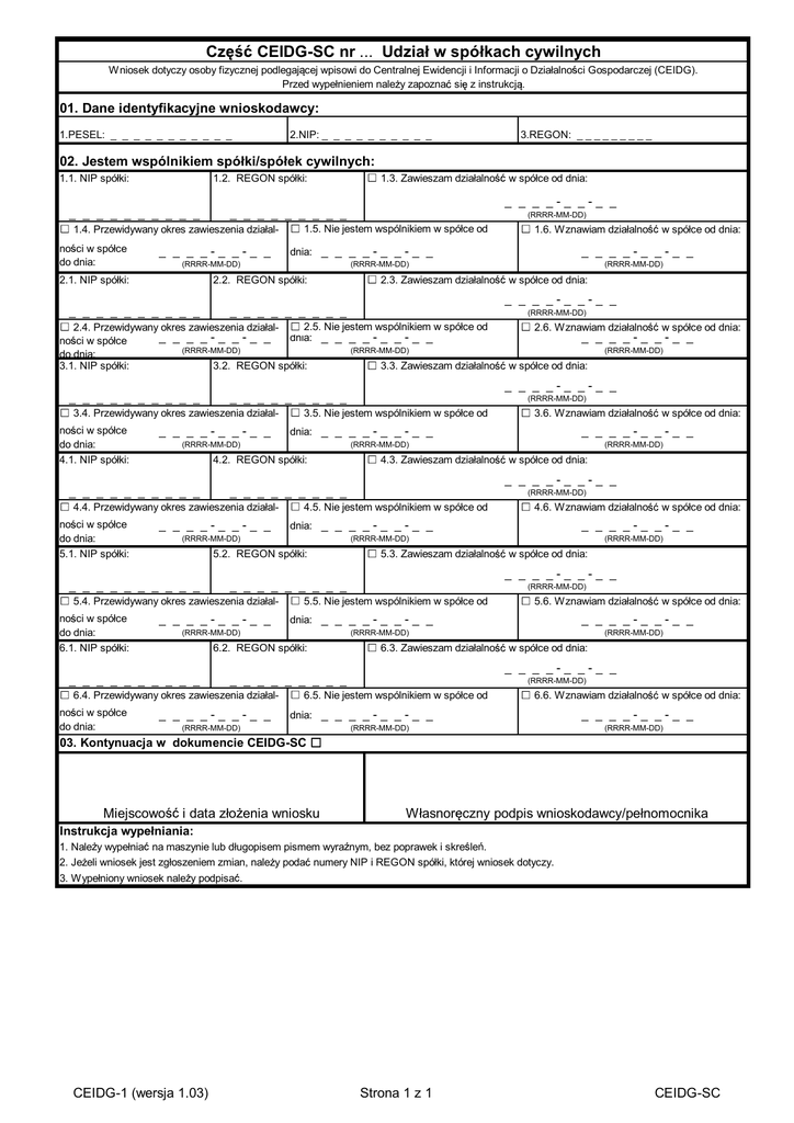 Cz CEIDG-SC nr ... Udział w spółkach cywilnych Wniosek dotyczy osoby fizycznej podlegaj cej wpisowi do Centralnej Ewidencji i Informacji o Działalno ci Gospodarczej (CEIDG). Przed wypełnieniem nale y zapozna si z instrukcj . 01. Dane identyfikacyjne wnioskodawcy: 1.PESEL: _ _ _ _ _ _ _ _ _ _ _ 2.NIP: _ _ _ _ _ _ _ _ _ _ 3.REGON: _ _ _ _ _ _ _ _ _ 02. Jestem wspólnikiem spółki/spółek cywilnych: 1.1. NIP spółki: 1.2. REGON spółki: 1.3. Zawieszam działalno w spółce od dnia: _ _ _ _-_ _-_ _ _ _ _ _ _ _ _ _ _ _ _ _ _ _ _ _ _ _ _ 1.4. Przewidywany okres zawieszenia działalno ci w spółce do dnia: _ _ _ _-_ _-_ _ 1.6. Wznawiam działalno dnia: _ _ _ _ - _ _ - _ _ (RRRR-MM-DD) 2.1. NIP spółki: (RRRR-MM-DD) 1.5. Nie jestem wspólnikiem w spółce od _ _ _ _-_ _-_ _ (RRRR-MM-DD) 2.2. REGON spółki: 2.3. Zawieszam działalno w spółce od dnia: (RRRR-MM-DD) w spółce od dnia: _ _ _ _-_ _-_ _ _ _ _ _ _ _ _ _ _ _ _ _ _ _ _ _ _ _ _ (RRRR-MM-DD) 2.5. Nie jestem wspólnikiem w spółce od 2.4. Przewidywany okres zawieszenia działal_ _ _ _-_ _-_ _ dnia: _ _ _ _ - _ _ - _ _ no ci w spółce (RRRR-MM-DD) (RRRR-MM-DD) do dnia: 3.1. NIP spółki: 3.2. REGON spółki: 3.3. Zawieszam działalno 2.6. Wznawiam działalno w spółce od dnia: _ _ _ _-_ _-_ _ (RRRR-MM-DD) w spółce od dnia: _ _ _ _-_ _-_ _ _ _ _ _ _ _ _ _ _ _ _ _ _ _ _ _ _ _ _ 3.4. Przewidywany okres zawieszenia działalno ci w spółce do dnia: 4.1. NIP spółki: _ _ _ _-_ _-_ _ (RRRR-MM-DD) 3.5. Nie jestem wspólnikiem w spółce od 3.6. Wznawiam działalno dnia: _ _ _ _ - _ _ - _ _ (RRRR-MM-DD) (RRRR-MM-DD) 4.2. REGON spółki: 4.3. Zawieszam działalno w spółce od dnia: _ _ _ _-_ _-_ _ (RRRR-MM-DD) w spółce od dnia: _ _ _ _-_ _-_ _ _ _ _ _ _ _ _ _ _ _ _ _ _ _ _ _ _ _ _ 4.4. Przewidywany okres zawieszenia działalno ci w spółce do dnia: 5.1. NIP spółki: _ _ _ _-_ _-_ _ (RRRR-MM-DD) 4.5. Nie jestem wspólnikiem w spółce od 4.6. Wznawiam działalno dnia: _ _ _ _ - _ _ - _ _ (RRRR-MM-DD) _ _ _ _-_ _-_ _ (RRRR-MM-DD) 5.2. REGON spółki: 5.3. Zawieszam działalno w spółce od dnia: (RRRR-MM-DD) w spółce od dnia: _ _ _ _-_ _-_ _ _ _ _ _ _ _ _ _ _ _ _ _ _ _ _ _ _ _ _ 5.4. Przewidywany okres zawieszenia działalno ci w spółce do dnia: 6.1. NIP spółki: _ _ _ _-_ _-_ _ (RRRR-MM-DD) 5.5. Nie jestem wspólnikiem w spółce od 5.6. Wznawiam działalno dnia: _ _ _ _ - _ _ - _ _ (RRRR-MM-DD) (RRRR-MM-DD) 6.2. REGON spółki: 6.3. Zawieszam działalno w spółce od dnia: _ _ _ _-_ _-_ _ (RRRR-MM-DD) w spółce od dnia: _ _ _ _-_ _-_ _ _ _ _ _ _ _ _ _ _ _ _ _ _ _ _ _ _ _ _ 6.4. Przewidywany okres zawieszenia działalno ci w spółce do dnia: _ _ _ _-_ _-_ _ (RRRR-MM-DD) 6.5. Nie jestem wspólnikiem w spółce od 6.6. Wznawiam działalno dnia: _ _ _ _ - _ _ - _ _ (RRRR-MM-DD) (RRRR-MM-DD) w spółce od dnia: _ _ _ _-_ _-_ _ (RRRR-MM-DD) 03. Kontynuacja w dokumencie CEIDG-SC Miejscowo i data zło enia wniosku Własnor czny podpis wnioskodawcy/pełnomocnika Instrukcja wypełniania: 1. Nale y wypełnia na maszynie lub długopisem pismem wyra nym, bez poprawek i skre le . 2. Je eli wniosek jest zgłoszeniem zmian, nale y poda numery NIP i REGON spółki, której wniosek dotyczy. 3. Wypełniony wniosek nale y podpisa . CEIDG-1 (wersja 1.03) Strona 1 z 1 CEIDG-SC