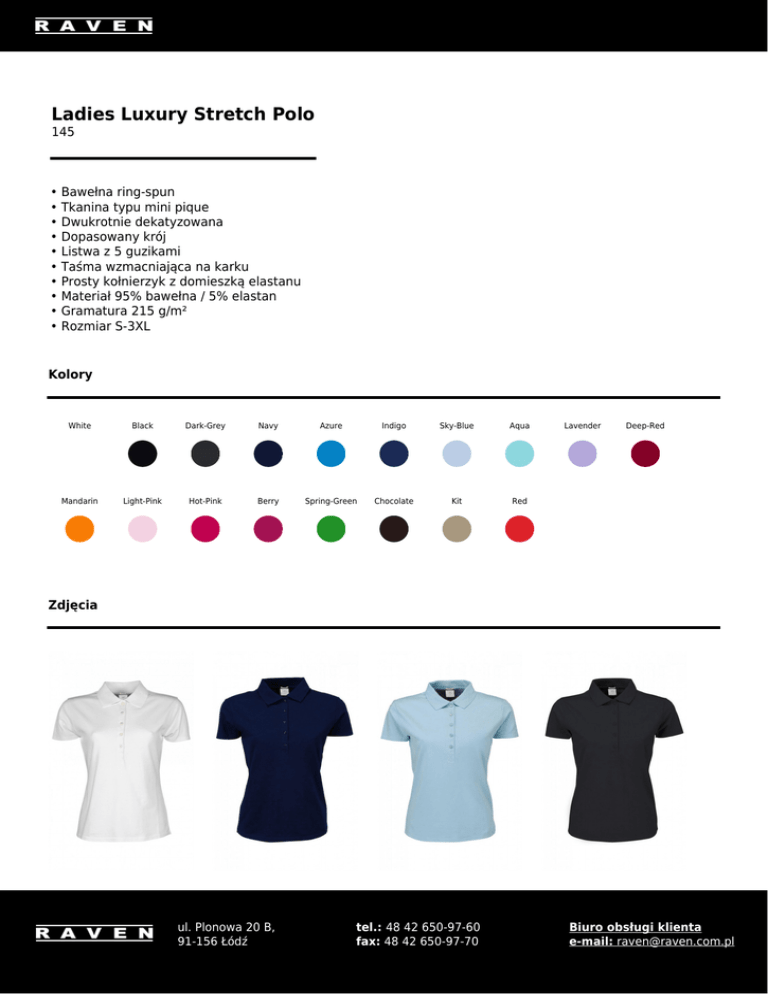 Ladies Luxury Stretch Polo 145 • Bawełna ring-spun • Tkanina typu mini pique • Dwukrotnie dekatyzowana • Dopasowany krój • Listwa z 5 guzikami • Taśma wzmacniająca na karku • Prosty kołnierzyk z domieszką elastanu • Materiał 95% bawełna / 5% elastan • Gramatura 215 g/m² • Rozmiar S-3XL Kolory White Black Dark-Grey Navy Azure Indigo Sky-Blue Aqua Mandarin Light-Pink Hot-Pink Berry Spring-Green Chocolate Kit Red Lavender Deep-Red Zdjęcia ul. Plonowa 20 B, 91-156 Łódź tel.: 48 42 650-97-60 fax: 48 42 650-97-70 Biuro obsługi klienta e-mail: [email protected] ul. Plonowa 20 B, 91-156 Łódź tel.: 48 42 650-97-60 fax: 48 42 650-97-70 Biuro obsługi klienta e-mail: [email protected] ul. Plonowa 20 B, 91-156 Łódź tel.: 48 42 650-97-60 fax: 48 42 650-97-70 Biuro obsługi klienta e-mail: [email protected]