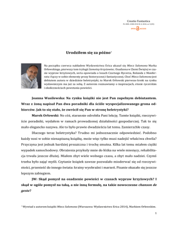 Creatio Fantastica PL ISSN: 2300-2514 R. X, 2014, nr 3 (45) Urodziłem się za późno Na początku czerwca nakładem Wydawnictwa Erica ukazał się Miecz Salomona Marka Orłowskiego, pierwszy tom trylogii Samotny krzyżowiec. Osadzona w Ziemi Świętej w czasie wypraw krzyżowych, seria opowiada o losach Czarnego Rycerza, Rolanda z Monferratu i łączy w sobie elementy prozy historycznej i fantastycznej. Choć Miecz Salomona jest debiutem autora w dziedzinie beletrystyki, to Marek Orłowski pierwsze kroki na rynku wydawniczym ma już za sobą. Z autorem rozmawiamy o inspiracjach, etosie rycerskim i okolicznościach powstania powieści. Joanna Wasilewska: Na rynku książki nie jest Pan zupełnym debiutantem. Wraz z żoną napisał Pan dwa poradniki dla ściśle wyspecjalizowanego grona odbiorców. Jak to się stało, że zwrócił się Pan w stronę beletrystyki? Marek Orłowski: No cóż, starannie odrobiła Pani lekcję. Tamte książki, rzeczywiście poradniki, wydałem w ramach prowadzonej działalności gospodarczej. Tak to się mało elegancko nazywa. Ale to było prawie dwadzieścia lat temu. Zamierzchłe czasy. Dlaczego teraz beletrystyka? Trudno mi jednoznacznie odpowiedzieć. Podobno każdy nosi w sobie nienapisaną książkę, może więc tylko musi nadejść właściwa chwila? Przyczyna jest jednak bardziej prozaiczna i trochę smutna. Kilka lat temu miałem ciężki wypadek samochodowy. Obrażenia przykuły mnie do łóżka na wiele miesięcy, rehabilitacja trwała jeszcze dłużej. Miałem zbyt wiele wolnego czasu, a zbyt mało nadziei. Czymś trzeba było zająć myśli. Czytanie książek zawsze pozwalało mioderwać się od rzeczywistości, przenieść do innego świata: krainy wyobraźni i marzeń. Pisanie okazało się jeszcze lepszym zabiegiem. JW: Skąd pomysł na osadzenie powieści w czasach wypraw krzyżowych? I skąd w ogóle pomysł na taką, a nie inną formułę, na takie nowoczesne chanson de geste? Wywiad z autorem książki Miecz Salomona (Warszawa: Wydawnictwo Erica 2014), Markiem Orłowskim. 1 MO: Krucjaty były w dziejach Europy i Bliskiego Wschodu niesamowitą przygodą, jedynym w swoim rodzaju zderzeniem dwóch kultur, co wywarło większy wpływ na dalszą historię regionu, niż się powszechnie sądzi. I – jak to zwykle bywa –chrześcijańskim rycerzom nie zawsze chodziło o obronę Grobu Chrystusa, chociaż hasło to było powszechnie używane i nadużywane.Krótko mówiąc, to bardzo ciekawe czasy i wydarzenia, skompresowane do okresu ledwie dwóch wieków. Trudno znaleźć barwniejszą kanwę dla powieści, której bohaterem jest średniowieczny rycerz. A temat rycerstwa, a może jeszcze bardziej: rycerskości, pociągał mnie od dzieciństwa, czyli od zawsze. Legendy o Św. Graalu, król Artur, Pieśń o Rolandzie (no właśnie, stąd pomysł na magiczny miecz i imię głównego bohatera), także nasi rodzimi rycerze w lśniących zbrojach… To były czasy z perspektywy wieków o wiele mniej skomplikowane niż obecne. Sądy boże zamiast rejonowych, damy serca, miłosne canzony, spory rozstrzygane na udeptanej ziemi. Proste rozwiązania –tak proste, jak cięcie mieczem. Ale przede wszystkim czasy, gdy tworzył się jedyny w swoim rodzaju sposób myślenia i postępowania – rycerski etos. Jeśli pomysł na formułę, o którą Pani pyta, w ogóle miał jakieś konkretne źródło, to chyba właśnie tam należy go szukać.W głęboko utajonej tęsknocie za prostymi wartościami, takimi jak honor, odwaga, prawość. Kiedyś rycerz zsiadał z konia, jeśli przeciwnik stracił wierzchowca. Dziś uważalibyśmy to za głupotę. Skoro nie dane mi było żyć w tamtych czasach, które tak mnie fascynują, to przeniosłem tamgłównego bohatera powieści. Chociaż tyle…Proszę Pani, ja się po prostu za późno urodziłem! JW: Czyli jest Pan romantykiem? MO: Przyznaję, że jestem. Wiem, że to obecnie dość niemodne i raczej niepraktyczne, ale nie sądzę, bym mógł i chciał się zmienić. JW: Ktoś kiedyś powiedział, że w literaturze są tak naprawdę tylko dwa tematy: miłość i śmierć. MO: Zgadzam się, tak naprawdę wszystko tu się zaczyna i kończy. W średniowieczu do śmierci podchodzono niezwykle poważnie, więc jej wszechobecność w powieści osadzonej w klimacie tamtych czasów ma chyba swoją rację bytu. A miłość? Jak by wyglądałby świat bez kobiet? Smutno, szaro, beznadziejnie nudno... Wracając do tego wątku w literaturze, proszę sobie przypomnieć jedną z najstarszych książek świata, czyli Biblię, 2 i Pieśń nad pieśniami. I te wspaniałe strofy: „Miłość jest mocna jak śmierć..” Czy może być coś piękniejszego? JW: W książce fantastyka splata się z wydarzeniami historycznymi, które zostały zresztą bardzo szczegółowo opisane. Research nastręczył sporo trudności? MO: Odtworzenie tak skomplikowanego okresu historycznego bez fachowych źródeł byłoby bardzo trudne, wręcz niemożliwe. Przynajmniej dla mnie. Tak, podczas pisania dwóch pierwszych tomów starannie studiowałem dostępne opracowania traktujące o czasach krucjat, a także o kulturze Europy i Bliskiego Wschodu w okresie średniowiecza. Było to oczywiście niezbędne, ale stanowiło też wielką przyjemność. Poszerzyło i zweryfikowało moją wcześniejszą wiedzę na ten temat. Ale prawdziwie rozległą wiedzę na temat średniowiecza posiadam nie ja, a Pan Artur Szrejter, który podjął się redakcji Samotnego krzyżowca. Koran i Biblia są z kolei niewyczerpanym źródłem pomysłów, jeśli chodzi o świat magii, demonów i zjawisk nadprzyrodzonych. Z konieczności obie księgi stały się na jakiś czas moją codzienną lekturą. Oto źródła inspiracji, mojej zasługi w tym niewiele. JW: Na książce widnieje imię i nazwisko Marek Orłowski, ale naprawdę nazywa się Pan Marko Szapkarow-Orłowski. MO: Jestem półkrwi Macedończykiem. Ale urodziłem się w Polsce i tu jest moja ojczyzna. Nie odżegnuję s