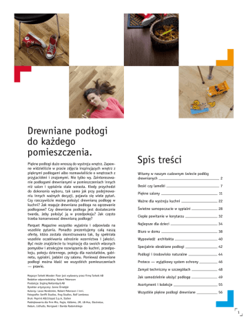 Drewniane podłogi do każdego pomieszczenia. Piękne podłogi dużo wnoszą do wystroju wnętrz. Zapewne widzieliście w prasie zdjęcia inspirujących wnętrz z pięknymi podłogami albo rozmawialiście o wnętrzach z przyjaciółmi i znajomymi. Nie tylko wy. Zainteresowanie podłogami drewnianymi w pomieszczeniach innych niż salon i sypialnia stale wzrasta. Kiedy przychodzi do dokonania wyboru, tak samo jak przy podejmowaniu innych ważnych decyzji, pojawia się wiele pytań. Czy rzeczywiście można położyć drewnianą podłogę w kuchni? Jak reaguje drewniana podłoga na ogrzewanie podłogowe? Czy drewniana podłoga jest dostatecznie twarda, żeby położyć ją w przedpokoju? Jak często trzeba konserwować drewnianą podłogę? Parquet Magazine wszystko wyjaśnia i odpowiada na wszelkie pytania. Ponadto prezentujemy całą naszą ofertę, która została skonstruowana tak, by spełniała wszelkie oczekiwania odnośnie wzornictwa i jakości. Być może znajdziecie tu inspirację dla swoich własnych pomysłów i atrakcyjne rozwiązania do kuchni, przedpokoju, pokoju dziennego, pokoju dla nastolatków, gabinetu, sypialni, jadalni czy salonu. Ponieważ drewniane podłogi można kłaść we wszystkich pomieszczeniach — prawie. Magazyn Tarkett Wooden Floor jest wydawany przez firmę Tarkett AB Redaktor odpowiedzialny: Robert Petersson Produkcja: Ingång Reklambyrå AB Dyrektor artystyczny: Janne Örnebjär Autorzy: Lasse Nordström, Robert Petersson i inni. Fotografie: Senfft Studios, Frog Studios, Rolf Lembreus Druk: Peprint AB/Litopat S.p.A, Italien Podziękowania dla firm Mio, Fogia, Källemo, JM, LB-Hus, Electrolux, Vedum, Lidhults, Norrgavel i Davida Radomskiego Spis treści Witamy w naszym cudownym świecie podłóg drewnianych 2 Deski czy lamelki 7 Piękne salony 11 Ważne dla wystroju kuchni 22 Świetne samopoczucie w sypialni 28 Ciepłe powitanie w korytarzu 32 Najlepsze dla dzieci 34 Biuro w domu 38 Wypowiedź architekta 40 Specjalnie obrabiane podłogi 42 Podłogi i środowisko naturalne 44 Proteco — wyjątkowy system ochrony 46 Zamysł techniczny w szczegółach 48 Jak samodzielnie ułożyć podłogę 49 Asortyment i kolekcje 55 Wszystkie piękne podłogi drewniane 56 1 Salsa Jesion Cognac, podłoga 3-lamelowa Viva Jesion Design Biały, podłoga 2-lamelowa Wybierz podłogę pasującą do Twojej kanapy... 2 Epoque Dąb Czarny Szczotkowany, deska Nie ma jak w domu! Często tęsknimy za domem, będąc od niego daleko. Większość osób uważa dom za swoją bezpieczną przystań. Z zasady czujemy się bezpiecznie w swoich czterech ścianach. Ponieważ dom znaczy dla Ciebie tak wiele, chcesz, by Twoje otoczenie i meble odzwierciedlały Twój osobisty styl. Z pewnością niczyjej uwadze nie umknęło rosnące zainteresowanie, jakim zaczęły się cieszyć dekorowanie wnętrz i wzornictwo. Epoque Dąb Antique Szczotkowany, deska Jaką kanapę kupić? Czy zasłony pasują do nowego stołu? Czy nowa półka na książki odpowiada stylem fotelowi i lampie? Jest wiele pytań, ale brak prostych odpowiedzi. Zabawmy się podłogami i meblami. Powyżej widać ten sam zestaw mebli w połączeniu z czterema różnymi podłogami. Efekt końcowy to cztery różne otoczenia, z których każde ma własne, wyjątkowe cechy. To naprawdę zdumiewające, jak bardzo można zmienić styl i atmosferę, zmieniając podłogę drewnianą. Może nie przyszło Ci to do tej pory do głowy, jednak podłoga odgrywa podstawową rolę w tworzeniu ogólnego wrażenia podczas meblowania domu. Chcesz stworzyć kontrast czy zachować harmonię, dobierając podłogę i meble? Które podłogi drewniane najlepiej pasują do Twojego stylu i osobowości? Mamy nadzieję, że znajdziesz odpowiedź na powyższe pytania w tym wydaniu magazynu. 3 Zróżnicowanie to dopiero początek... Z firmą Tarkett masz nieskończone możliwości. To dlatego, że nasza gama produktów obejmuje ponad 250 różnych rodzajów podłóg drewnianych. Wybieraj spośród klasycznych i ekscytujących nowych gatunków drewna w różnych kolorach, kształtach, o różnym wykończeniu i właściwościach. Wybieraj spośród klas podłóg o dużym zróżnicowaniu. Albo wybieraj między różnymi liczbami lameli na deskach, by tworzyć spokojne lub żywe wzory. Wybierz chroniący drewno lakier lub olej, pozwalające uzyskać efekt matowy lub z połyskiem. Wybierz drewnianą podłogę spośród różnych grubości, dających różne możliwości w zakresie układania i cyklinowania. Nie zapomnij także o listwach przypodłogowych, profilach sztukatorskich i innych akcesoriach, które często stanowią wykończenie podłóg. Doświadczenie, na którym możesz polegać. Firma Tarkett produkuje podłogi drewniane od roku; można je spotkać na całym świecie. Na początku było to rzemiosło jak wiele innych. Dziś jest to nowoczesny proces produkcji, mający swe korzenie w prawdziwym kunszcie, który uwzględnia środowisko naturalne i ludzi. 3-warstwowa deska została opatentowana i wprowadzona w latach 40. Po przeliczeniu powierzchni, na jakiej położono podłogi Tarkett od tego czasu, otrzymuje się wynik w milionach pomieszczeń na całym świecie. Wybierając podłogi Tarkett, nie kupuje się jedynie podłogi. Kupuje się także specjalistyczną wiedzę, która daje pewność, że podłoga jest wysokiej jakości. Ta specjalistyczna wiedza ewoluowała na przestrzeni pokoleń; dziś nazywamy ją zamysłem technicznym. Koncepcja ta obejmuje 3-warstwową konstrukcję, która zapewnia wyjątkową stabilność (ponieważ drewno to materiał naturalny), system obróbki powierzchni Proteco, który chroni powierzchnię przed mikrozarysowaniami, oraz proces produkcji wykorzystujący lamele i deski, które zwiększają zróżnicowanie wzornictwa. Witamy w naszym cudownym świecie podłóg drewnianych! 4 5 Aura i charakter drewnianych podłóg. Epoque Deski lub lamelki Drewniane podłogi charakteryzują się różnymi rozmiarami lameli, co wpływa na 