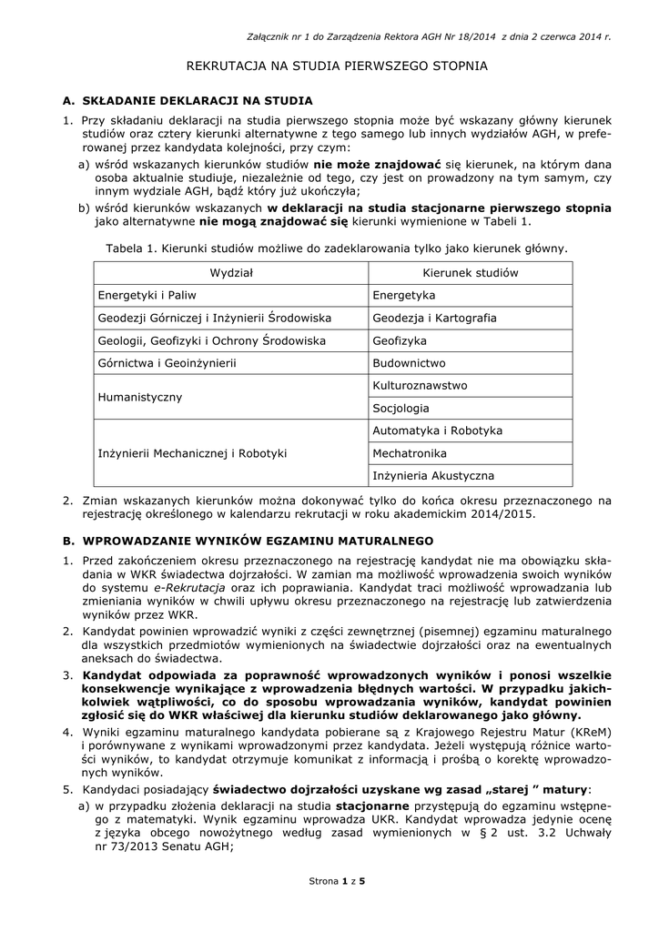 Załącznik nr 1 do Zarządzenia Rektora AGH Nr 18/2014 z dnia 2 czerwca 2014 r. REKRUTACJA NA STUDIA PIERWSZEGO STOPNIA A. SKŁADANIE DEKLARACJI NA STUDIA 1. Przy składaniu deklaracji na studia pierwszego stopnia może być wskazany główny kierunek studiów oraz cztery kierunki alternatywne z tego samego lub innych wydziałów AGH, w preferowanej przez kandydata kolejności, przy czym: a) wśród wskazanych kierunków studiów nie może znajdować się kierunek, na którym dana osoba aktualnie studiuje, niezależnie od tego, czy jest on prowadzony na tym samym, czy innym wydziale AGH, bądź który już ukończyła; b) wśród kierunków wskazanych w deklaracji na studia stacjonarne pierwszego stopnia jako alternatywne nie mogą znajdować się kierunki wymienione w Tabeli 1. Tabela 1. Kierunki studiów możliwe do zadeklarowania tylko jako kierunek główny. Wydział Kierunek studiów Energetyki i Paliw Energetyka Geodezji Górniczej i Inżynierii Środowiska Geodezja i Kartografia Geologii, Geofizyki i Ochrony Środowiska Geofizyka Górnictwa i Geoinżynierii Budownictwo Kulturoznawstwo Humanistyczny Socjologia Automatyka i Robotyka Inżynierii Mechanicznej i Robotyki Mechatronika Inżynieria Akustyczna 2. Zmian wskazanych kierunków można dokonywać tylko do końca okresu przeznaczonego na rejestrację określonego w kalendarzu rekrutacji w roku akademickim 2014/2015. B. WPROWADZANIE WYNIKÓW EGZAMINU MATURALNEGO 1. Przed zakończeniem okresu przeznaczonego na rejestrację kandydat nie ma obowiązku składania w WKR świadectwa dojrzałości. W zamian ma możliwość wprowadzenia swoich wyników do systemu e-Rekrutacja oraz ich poprawiania. Kandydat traci możliwość wprowadzania lub zmieniania wyników w chwili upływu okresu przeznaczonego na rejestrację lub zatwierdzenia wyników przez WKR. 2. Kandydat powinien wprowadzić wyniki z części zewnętrznej (pisemnej) egzaminu maturalnego dla wszystkich przedmiotów wymienionych na świadectwie dojrzałości oraz na ewentualnych aneksach do świadectwa. 3. Kandydat odpowiada za poprawność wprowadzonych wyników i ponosi wszelkie konsekwencje wynikające z wprowadzenia błędnych wartości. W przypadku jakichkolwiek wątpliwości, co do sposobu wprowadzania wyników, kandydat powinien zgłosić się do WKR właściwej dla kierunku studiów deklarowanego jako główny. 4. Wyniki egzaminu maturalnego kandydata pobierane są z Krajowego Rejestru Matur (KReM) i porównywane z wynikami wprowadzonymi przez kandydata. Jeżeli występują różnice wartości wyników, to kandydat otrzymuje komunikat z informacją i prośbą o korektę wprowadzonych wyników. 5. Kandydaci posiadający świadectwo dojrzałości uzyskane wg zasad „starej ” matury: a) w przypadku złożenia deklaracji na studia stacjonarne przystępują do egzaminu wstępnego z matematyki. Wynik egzaminu wprowadza UKR. Kandydat wprowadza jedynie ocenę z języka obcego nowożytnego według zasad wymienionych w § 2 ust. 3.2 Uchwały nr 73/2013 Senatu AGH; Strona 1 z 5 Załącznik nr 1 do Zarządzenia Rektora AGH Nr 18/2014 z dnia 2 czerwca 2014 r. b) w przypadku studiów niestacjonarnych kandydat może wprowadzić oceny ze świadectwa dojrzałości lub przystąpić do egzaminu wstępnego na zasadzie dobrowolności zaznaczając odpowiednią pozycję formularza w systemie e-Rekrutacja. Przed rozpoczęciem egzaminu kandydat taki zobowiązany jest do podpisania oświadczenia, że rezygnuje z wyznaczenia wartości składnika G we wzorze na obliczenie wskaźnika rekrutacji na podstawie świadectwa dojrzałości. Wyniki egzaminu oraz oświadczenie, o którym mowa powyżej, są wiążące dla rekrutacji na studia w roku akademickim 2014/2015 zarówno w rekrutacji zasadniczej (lipiec), jak i w ewentualnej rekrutacji uzupełniającej (wrzesień) niezależnie od wybranego kierunku głównego i kierunków alternatywnych. 6. W przypadku kandydatów na studia (obywateli polskich albo cudzoziemców ubiegających się o przyjęcie na zasadach obowiązujących obywateli polskich) posiadających wykształcenie uzyskane za granicą: a) przeliczenia ocen na skalę ocen obowiązującą w Polsce proporcjonalnie do skali ocen stosowanej na przedłożonym świadectwie dokonuje Centrum Studentów Zagranicznych AGH (CSZ), które następnie wprowadza wyniki do systemu e-Rekrutacja; b) w uzasadnionych przypadkach UKR, na wniosek kandydata, może wyrazić zgodę na przystąpienie do egzaminu wstępnego z matematyki i poddaniu się kwalifikacji na podstawie uzyskanego wyniku w terminach podanych w kalendarzu rekrutacji; c) w celu przeliczenia ocen kandydat zobowiązany jest, przed upływem okresu przeznaczonego na rejestrację, wraz z tłumaczeniami na język polski sporządzonymi lub poświadczonymi przez tłumacza przysięgłego wpisanego na listę tłumaczy prowadzoną przez Ministra Sprawiedliwości albo konsula Rzeczypospolitej Polskiej urzędującego w państwie, w którym został wydany dokument, złożyć za pośrednictwem systemu e-Rekrutacja w formie elektronicznej: ‒ zalegalizowane lub opatrzone apostille świadectwo dojrzałości lub inny dokument uzyskany za granicą, uprawniający do ubiegania się o przyjęcie na studia w uczelniach każdego typu w państwie, w którego systemie działała instytucja wydająca świadectwo, ‒ suplement bądź inny oficjalny dokument obejmujący przedmioty, jeżeli nie są wskazane w świadectwie lub innym dokumencie uzyskanym za granicą, zaliczone przez kandydata w szkole średniej wraz z uzyskanymi ocenami, ‒ dokument przedstawiający obowiązującą skalę ocen, jeżeli nie jest ona wskazana w świadectwie lub innym dokumencie uzyskanym za granicą, potwierdzony przez szkołę średnią, którą ukończył kandydat; d) cudzoziemcy ubiegający się o przyjęcie na studia na zasadach obowiązujących obywateli polskich, oprócz dokumentów określonych w lit. c, zobowiązani są także przed upływem okresu przeznaczonego na rejestrację, zło