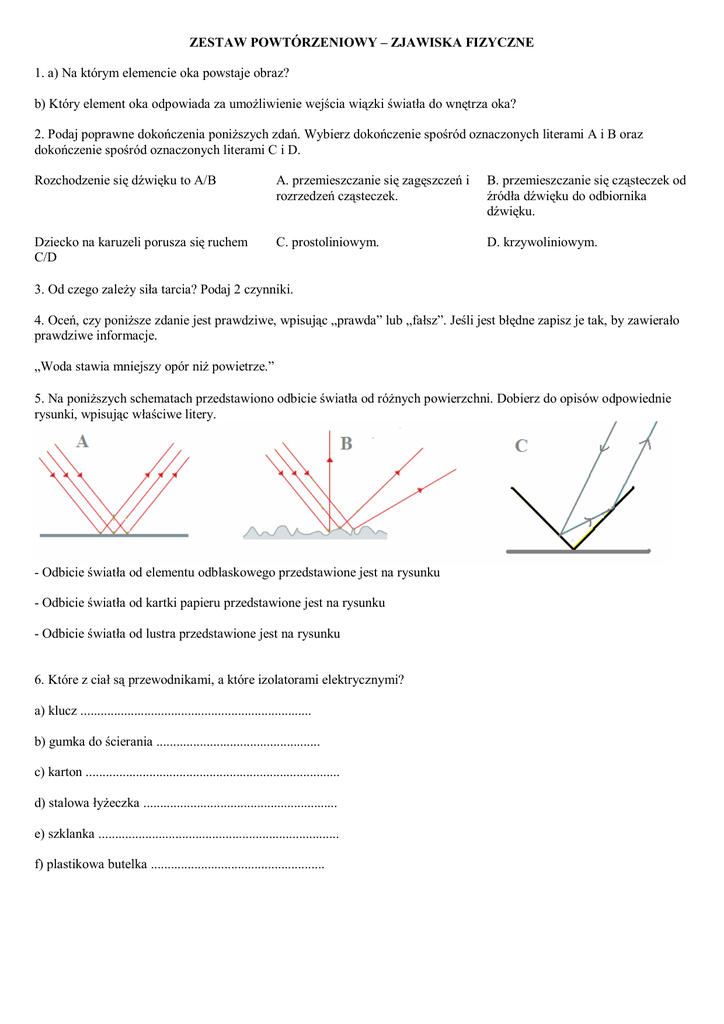 ZESTAW POWTÓRZENIOWY – ZJAWISKA FIZYCZNE 1. a) Na którym elemencie oka powstaje obraz? b) Który element oka odpowiada za umożliwienie wejścia wiązki światła do wnętrza oka? 2. Podaj poprawne dokończenia poniższych zdań. Wybierz dokończenie spośród oznaczonych literami A i B oraz dokończenie spośród oznaczonych literami C i D. Rozchodzenie się dźwięku to A/B A. przemieszczanie się zagęszczeń i rozrzedzeń cząsteczek. B. przemieszczanie się cząsteczek od źródła dźwięku do odbiornika dźwięku. Dziecko na karuzeli porusza się ruchem C/D C. prostoliniowym. D. krzywoliniowym. 3. Od czego zależy siła tarcia? Podaj 2 czynniki. 4. Oceń, czy poniższe zdanie jest prawdziwe, wpisując „prawda” lub „fałsz”. Jeśli jest błędne zapisz je tak, by zawierało prawdziwe informacje. „Woda stawia mniejszy opór niż powietrze.” 5. Na poniższych schematach przedstawiono odbicie światła od różnych powierzchni. Dobierz do opisów odpowiednie rysunki, wpisując właściwe litery. - Odbicie światła od elementu odblaskowego przedstawione jest na rysunku - Odbicie światła od kartki papieru przedstawione jest na rysunku - Odbicie światła od lustra przedstawione jest na rysunku 6. Które z ciał są przewodnikami, a które izolatorami elektrycznymi? a) klucz ..................................................................... b) gumka do ścierania ................................................. c) karton ............................................................................ d) stalowa łyżeczka .......................................................... e) szklanka ........................................................................ f) plastikowa butelka ....................................................