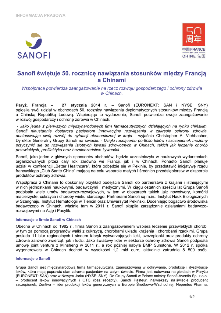 INFORMACJA PRASOWA Sanofi świętuje 50. rocznicę nawiązania stosunków między Francją a Chinami Współpraca potwierdza zaangażowanie na rzecz rozwoju gospodarczego i ochrony zdrowia w Chinach. Paryż, Francja – 27 stycznia 2014 r. – Sanofi (EURONEXT: SAN i NYSE: SNY) ogłosiła swój udział w obchodach 50. rocznicy nawiązania dyplomatycznych stosunków między Francją a Chińską Republiką Ludową. Wspierając to wydarzenie, Sanofi potwierdza swoje zaangażowanie w rozwój gospodarczy i ochronę zdrowia w Chinach. - Jako jedna z pierwszych międzynarodowych firm farmaceutycznych działających na rynku chińskim, Sanofi nieustannie dostarcza pacjentom innowacyjne rozwiązania w zakresie ochrony zdrowia, dostosowując swój rozwój do sytuacji ekonomicznej w kraju - wyjaśnia Christopher A. Viehbacher, Dyrektor Generalny Grupy Sanofi na świecie. - Dzięki rosnącemu portfolio leków i szczepionek możemy przyczynić się do rozwiązania istotnych kwestii zdrowotnych w Chinach, takich jak leczenie chorób przewlekłych, profilaktyka oraz bezpieczeństwo żywności. Sanofi, jako jeden z głównych sponsorów obchodów, będzie uczestniczyła w naukowych wydarzeniach organizowanych przez cały rok zarówno we Francji, jak i w Chinach. Ponadto Sanofi planuje udział w konferencji „Better Healthcare”, która odbędzie się w Pekinie, by przedstawić inicjatywę rządu francuskiego „Club Santé Chine” mającą na celu wsparcie małych i średnich przedsiębiorstw w eksporcie produktów ochrony zdrowia. Współpraca z Chinami to doskonały przykład podejścia Sanofi do partnerstwa z krajami i istniejącymi w nich jednostkami naukowymi, badawczymi i medycznymi. W ciągu ostatnich sześciu lat Grupa Sanofi podpisała wiele umów badawczo-rozwojowych, w tym w obszarach takich jak: nowotwory, komórki macierzyste, cukrzyca i choroby wieku starczego. Partnerami Sanofi są m.in.: Instytut Nauk Biologicznych w Szanghaju, Instytut Hematologii w Tiencin oraz Uniwersytet Pekiński. Doceniając bogactwo środowiska badawczego w Chinach, właśnie tam w 2011 r. Sanofi skupiła zarządzanie działaniami badawczorozwojowymi na Azję i Pacyfik. Informacje o firmie Sanofi w Chinach Obecna w Chinach od 1982 r., firma Sanofi z zaangażowaniem wspiera leczenie przewlekłych chorób, w tym za pomocą programów walki z cukrzycą, chorobami układu krążenia i chorobami rzadkimi. Grupa posiada 11 biur regionalnych i siedem fabryk wytwarzających leki, szczepionki oraz produkty ochrony zdrowia zarówno zwierząt, jak i ludzi. Jako światowy lider w sektorze ochrony zdrowia Sanofi podpisała umowę joint venture z Minsheng w 2011 r., a rok później nabyła BMP Sunstone. W 2012 r. spółka wygenerowała w Chinach dochód w wysokości 1,2 mld euro, aktualnie zatrudnia 8 500 osób. Informacje o Sanofi Grupa Sanofi jest międzynarodową firmą farmaceutyczną, zaangażowaną w odkrywanie, produkcję i dystrybucję leków, które mają poprawić stan zdrowia pacjentów na całym świecie. Firma jest notowana na giełdach w Paryżu (EURONEXT: SAN) oraz w Nowym Jorku (NYSE: SNY). Do Grupy Sanofi w Polsce należą: Sanofi-Aventis Sp. z o.o. – producent leków innowacyjnych i OTC (bez recepty), Sanofi Pasteur, największy na świecie producent szczepionek, Zentiva – lider produkcji leków generycznych w Europie Środkowo-Wschodniej, Nepentes Pharma, 1/2 uznany w branży producent dermokosmetyków, Genzyme, producent leków stosowanych w chorobach rzadkich oraz Merial, światowy lider w branży weterynaryjnej. Jedna z 82 fabryk Grupy Sanofi na świecie, jest zlokalizowana w Rzeszowie. Grupa Sanofi w Polsce zatrudnia blisko 1000 pracowników. Według danych IMS Health Polska, Grupa zajmuje jedno z wiodących miejsc w krajowym rankingu największych firm farmaceutycznych. Więcej informacji znajduje się na stronie www.sanofi.pl Osoby kontaktowe: Monika Chmielewska-Żehaluk Dyrektor Działu Komunikacji Tel. +48 22 280 07 53; kom. +48 695 588 881 [email protected] 2/2