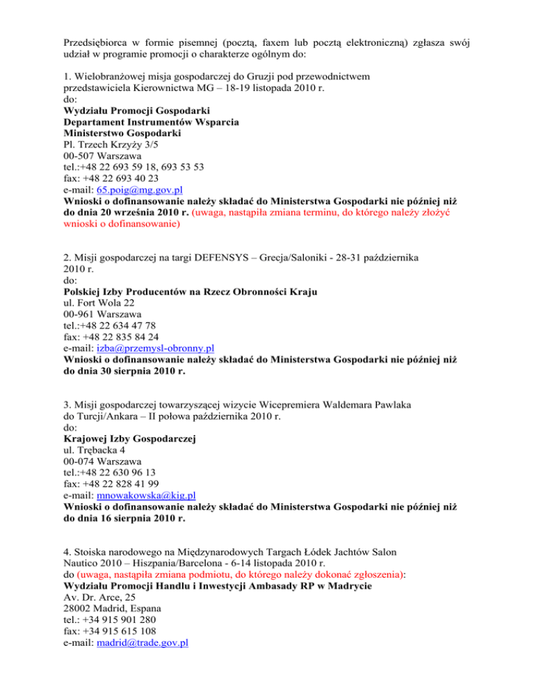 Przedsiębiorca w formie pisemnej (pocztą, faxem lub pocztą elektroniczną) zgłasza swój udział w programie promocji o charakterze ogólnym do: 1. Wielobranżowej misja gospodarczej do Gruzji pod przewodnictwem przedstawiciela Kierownictwa MG – 18-19 listopada 2010 r. do: Wydziału Promocji Gospodarki Departament Instrumentów Wsparcia Ministerstwo Gospodarki Pl. Trzech Krzyży 3/5 00-507 Warszawa tel.:+48 22 693 59 18, 693 53 53 fax: +48 22 693 40 23 e-mail: [email protected] Wnioski o dofinansowanie należy składać do Ministerstwa Gospodarki nie później niż do dnia 20 września 2010 r. (uwaga, nastąpiła zmiana terminu, do którego należy złożyć wnioski o dofinansowanie) 2. Misji gospodarczej na targi DEFENSYS – Grecja/Saloniki - 28-31 października 2010 r. do: Polskiej Izby Producentów na Rzecz Obronności Kraju ul. Fort Wola 22 00-961 Warszawa tel.:+48 22 634 47 78 fax: +48 22 835 84 24 e-mail: [email protected] Wnioski o dofinansowanie należy składać do Ministerstwa Gospodarki nie później niż do dnia 30 sierpnia 2010 r. 3. Misji gospodarczej towarzyszącej wizycie Wicepremiera Waldemara Pawlaka do Turcji/Ankara – II połowa października 2010 r. do: Krajowej Izby Gospodarczej ul. Trębacka 4 00-074 Warszawa tel.:+48 22 630 96 13 fax: +48 22 828 41 99 e-mail: [email protected] Wnioski o dofinansowanie należy składać do Ministerstwa Gospodarki nie później niż do dnia 16 sierpnia 2010 r. 4. Stoiska narodowego na Międzynarodowych Targach Łódek Jachtów Salon Nautico 2010 – Hiszpania/Barcelona - 6-14 listopada 2010 r. do (uwaga, nastąpiła zmiana podmiotu, do którego należy dokonać zgłoszenia): Wydziału Promocji Handlu i Inwestycji Ambasady RP w Madrycie Av. Dr. Arce, 25 28002 Madrid, Espana tel.: +34 915 901 280 fax: +34 915 615 108 e-mail: [email protected] http://madryt.trade.gov.pl Wnioski o dofinansowanie należy składać do Ministerstwa Gospodarki nie później niż do dnia 7 września 2010 r. 5. Misji gospodarczej na targi China Industry Fair - Chiny/Shanghai - 9-13 listopada 2010 r. do: Centrum Informacji Gospodarczej ul. Mokotowska 4/6 p.118 00-641 Warszawa tel.: +48 22 875 09 00 fax: +48 22 875 97 41 e-mail: [email protected] Wnioski o dofinansowanie należy składać do Ministerstwa Gospodarki nie później niż do dnia 10 września 2010 r. 6. Misji gospodarczej na targi Israel Gateway 2010– Izrael/Tel Aviv - 27-30 listopada 2010 r. do: Izby Przemysłowo-Handlowej Polska-Izrael ul. Trębacka 4 00-074 Warszawa tel.:+48 22 630 96 13 fax: +48 22 828 41 99 e-mail: [email protected] Wnioski o dofinansowanie należy składać do Ministerstwa Gospodarki nie później niż do dnia 28 września 2010 r. 7. Misji gospodarczej na targi International Hotel/Motel & Restaurant Show – USA/New York - 13-16 listopada 2010 r. do: Centrum Informacji Gospodarczej ul. Mokotowska 4/6 p.118 00-641 Warszawa tel.: +48 22 875 09 00 fax: +48 22 875 97 41 e-mail: [email protected] Wnioski o dofinansowanie należy składać do Ministerstwa Gospodarki nie później niż do dnia 14 września 2010 r. 8. Stoiska narodowego polskich firm w Azerbejdżanie/Baku - listopad 2010 r. do (uwaga, nastąpiła zmiana podmiotu, do którego należy dokonać zgłoszenia): Polska Agencja Informacji i Inwestycji Zagranicznych S.A. ul. Bagatela 12 00-585 Warszawa tel.:+48 22 334 98 00 fax: +48 22 334 98 01 e-mail: [email protected], [email protected] Wnioski o dofinansowanie należy składać do Ministerstwa Gospodarki nie później niż do dnia 31 sierpnia 2010 r. 9. Misji gospodarczej w związku z wizytą Wicepremiera Waldemara Pawlaka w Zjednoczonych Emiratach Arabskich – 8-9 listopada 2010 r. do: Pracodawców Rzeczypospolitej Polskiej ul. Brukselska 7 03-973 Warszawa tel.:+48 22 518 87 00 fax: +48 22 828 84 31 e-mail: [email protected] Wnioski o dofinansowanie należy składać do Ministerstwa Gospodarki nie później niż do dnia 9 września 2010 r. 10. Misji gospodarczej na Międzynarodową Wystawę Przemysłu Obronnego INDODEFENCE 2010 – Indonezja/Jakarta - 10-13 listopada 2010 r. do: Polskiej Izby Producentów na Rzecz Obronności Kraju ul. Fort Wola 22 00-961 Warszawa tel.:+48 22 634 47 78 fax: +48 22 835 84 24 e-mail: [email protected] Wnioski o dofinansowanie należy składać do Ministerstwa Gospodarki nie później niż do dnia 13 września 2010 r. 11. Stoiska narodowego na Międzynarodowych Targach „Autumn International Fair” – Albania/Tirana - 25-30 listopad 2010 r. do (uwaga, nastąpiła zmiana podmiotu, do którego należy dokonać zgłoszenia): POLEXPO EXHIBITIONS Sp. z o.o. ul. Bohdanowicza 13 02-127 Warszawa tel.:+48 22 658 18 18-19 fax: +48 22 326 63 16 e-mail: [email protected] Wnioski o dofinansowanie należy składać do Ministerstwa Gospodarki nie później niż do dnia 27 września 2010 r. Jednocześnie informujemy, że szczegółowe dane odnośnie organizacji wystąpień narodowych można uzyskać pod adresem e-mail [email protected].