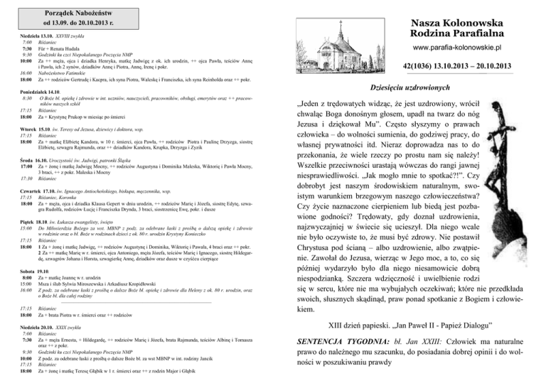 Porządek Nabożeństw od 13.09. do 20.10.2013 r. Niedziela 13.10. XXVIII zwykła 7:00 Różaniec 7:30 Für + Renata Hudala 9:30 Godzinki ku czci Niepokalanego Poczęcia NMP 10:00 Za ++ męża, ojca i dziadka Henryka, matkę Jadwigę z ok. ich urodzin, ++ ojca Pawła, teściów Annę i Pawła, ich 2 synów, dziadków Annę i Piotra, Annę, Irenę i pokr. 16:00 Nabożeństwo Fatimskie 18:00 Za ++ rodziców Gertrudę i Kacpra, ich syna Piotra, Waleskę i Franciszka, ich syna Reinholda oraz ++ pokr. Poniedziałek 14.10. 8:30 O Boże bł. opiekę i zdrowie w int. uczniów, nauczycieli, pracowników, obsługi, emerytów oraz ++ pracowników naszych szkół 17:15 Różaniec 18:00 Za + Krystynę Prukop w miesiąc po śmierci Wtorek 15.10. św. Teresy od Jezusa, dziewicy i doktora, wsp. 17:15 Różaniec 18:00 Za + matkę Elżbietę Kandora, w 10 r. śmierci, ojca Pawła, ++ rodziców Piotra i Paulinę Drzyzga, siostrę Elżbietę, szwagra Rajmunda, oraz ++ dziadków Kandora, Krupka, Drzyzga i Zyzik Środa 16.10. Uroczystość św. Jadwigi, patronki Śląska 17:00 Za + żonę i matkę Jadwigę Mocny, ++ rodziców Augustyna i Dominika Maleska, Wiktorię i Pawła Mocny, 3 braci, ++ z pokr. Maleska i Mocny 17:30 Różaniec Czwartek 17.10. św. Ignacego Antiocheńskiego, biskupa, męczennika, wsp. 17:15 Różaniec, Koronka 18:00 Za + męża, ojca i dziadka Klausa Gepert w dniu urodzin, ++ rodziców Marię i Józefa, siostrę Edytę, szwagra Rudolfa, rodziców Łucję i Franciszka Drynda, 3 braci, siostrzenicę Ewę, pokr. i dusze Piątek 18.10. św. Łukasza ewangelisty, święto 15:00 Do Miłosierdzia Bożego za wst. MBNP z podz. za odebrane łaski z prośbą o dalszą opiekę i zdrowie w rodzinie oraz o bł. Boże w rodzinach dzieci z ok. 80 r. urodzin Krystyny Konieczko 17:15 Różaniec 18:00 1 Za + żonę i matkę Jadwigę, ++ rodziców Augustynę i Dominika, Wiktorię i Pawała, 4 braci oraz ++ pokr. 2 Za ++ matkę Marię w r. śmierci, ojca Antoniego, męża Józefa, teściów Marię i Ignacego, siostrę Hildegardę, szwagrów Johana i Horsta, szwagierkę Annę, dziadków oraz dusze w czyśćcu cierpiące Sobota 8:00 15:00 16:00 17:15 18:00 19.10. Za + matkę Joannę w r. urodzin Msza i ślub Sylwia Miroszewska i Arkadiusz Kropidłowski Z podz. za odebrane łaski z prośbą o dalsze Boże bł. opiekę i zdrowie dla Heleny z ok. 80 r. urodzin, oraz o Boże bł. dla całej rodziny —–————–——————–—————–—————————–––—— Różaniec Za + brata Piotra w r. śmierci oraz ++ rodziców Niedziela 20.10. XXIX zwykła 7:00 Różaniec 7:30 Za + męża Ernesta, + Hildegardę, ++ rodziców Marię i Józefa, brata Rajmunda, teściów Albinę i Tomasza oraz ++ z pokr. 9:30 Godzinki ku czci Niepokalanego Poczęcia NMP 10:00 Z podz. za odebrane łaski z prośbą o dalsze Boże bł. za wst MBNP w int. rodziny Jancik 17:15 Różaniec 18:00 Za + żonę i matkę Teresę Głąbik w 1 r. śmierci oraz ++ z rodzin Major i Głąbik Nasza Kolonowska Rodzina Parafialna www.parafia-kolonowskie.pl 42(1036) 13.10.2013 – 20.10.2013 Dziesięciu uzdrowionych „Jeden z trędowatych widząc, że jest uzdrowiony, wrócił chwaląc Boga donośnym głosem, upadł na twarz do nóg Jezusa i dziękował Mu”. Często słyszymy o prawach człowieka – do wolności sumienia, do godziwej pracy, do własnej prywatności itd. Nieraz doprowadza nas to do przekonania, że wiele rzeczy po prostu nam się należy! Wszelkie przeciwności urastają wówczas do rangi jawnej niesprawiedliwości. „Jak mogło mnie to spotkać?!”. Czy dobrobyt jest naszym środowiskiem naturalnym, swoistym warunkiem brzegowym naszego człowieczeństwa? Czy życie naznaczone cierpieniem lub biedą jest pozbawione godności? Trędowaty, gdy doznał uzdrowienia, najzwyczajniej w świecie się ucieszył. Dla niego wcale nie było oczywiste to, że musi być zdrowy. Nie postawił Chrystusa pod ścianą – albo uzdrowienie, albo zwątpienie. Zawołał do Jezusa, wierząc w Jego moc, a to, co się później wydarzyło było dla niego niesamowicie dobrą niespodzianką. Szczera wdzięczność i uwielbienie rodzi się w sercu, które nie ma wybujałych oczekiwań; które nie przedkłada swoich, słusznych skądinąd, praw ponad spotkanie z Bogiem i człowiekiem. XIII dzień papieski. „Jan Paweł II - Papież Dialogu” SENTENCJA TYGODNIA: bł. Jan XXIII: Człowiek ma naturalne prawo do należnego mu szacunku, do posiadania dobrej opinii i do wolności w poszukiwaniu prawdy 42/2013 Rok Wiary: Myśli papieża Franciszka: * Pan nigdy nie męczy się przebaczaniem, nigdy! To my męczymy się, kiedy przychodzi nam prosić Go o przebaczenie. * Jezus zatraca się , całjue cię, przytula i mówi jedynie to: „Ja też cię nie potępiam”. W kancelarii parafialnej i zakrystii do nabycia: Atlas Biblijny; Książka - wywiad „Jezuita, papież Franciszek ”; „Kwiatki papieża Franciszka”; „Matka Świętego” - świadectwo mamy ks. Popiełuszki; ks. Piotr Bekierz, „ Camino - szlakiem św. Jakuba”; Biblia - NT; Biblia - ST. i NT; Droga do nieba - mały i duży druk; Film Dvd – „ Droga życia”; Albumy + filmy Dvd pt. „ Zniszczyć Kościół ”, „ Święty. z Asyżu ”, „ Wielcy kapłani ”, „Siostra. Faustyna ”, „Apokalipsa ”, „ Święta. Józefina Bakhita ”; Książka „ Czwarte przykazanie ”, pozycja wspierająca diecezjalny dom matki i dziecka; Kalendarze na 2014 rok. —————————————————————————————— Fatima: Kończy się kolejny rok Wielkiej Nowenny Fatimskiej, przed rokiem 2017, kiedy to przypada100 lecie objawień. Tematem tego roku były słowa „ Eucharystyczny klucz. Cud nad cudami, który zmienia wszystko”. Obchody stulecia objawień fatimskich upamiętniają wydarzenie bardzo znaczące dla życia religijnego. Orędzie fatimskie niesie w sobie dynamikę, która lokuje je w teraźniejszości i przyszłoś