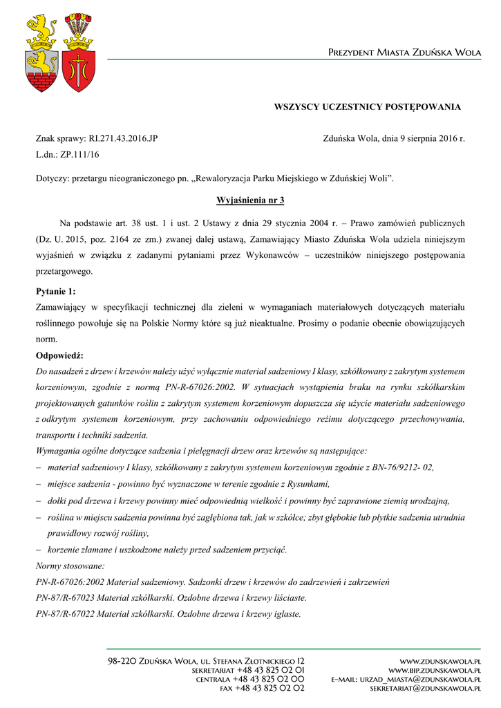 WSZYSCY UCZESTNICY POSTĘPOWANIA Zduńska Wola, dnia 9 sierpnia 2016 r. Znak sprawy: RI.271.43.2016.JP L.dn.: ZP.111/16 Dotyczy: przetargu nieograniczonego pn. „Rewaloryzacja Parku Miejskiego w Zduńskiej Woli”. Wyjaśnienia nr 3 Na podstawie art. 38 ust. 1 i ust. 2 Ustawy z dnia 29 stycznia 2004 r. – Prawo zamówień publicznych (Dz. U. 2015, poz. 2164 ze zm.) zwanej dalej ustawą, Zamawiający Miasto Zduńska Wola udziela niniejszym wyjaśnień w związku z zadanymi pytaniami przez Wykonawców – uczestników niniejszego postępowania przetargowego. Pytanie 1: Zamawiający w specyfikacji technicznej dla zieleni w wymaganiach materiałowych dotyczących materiału roślinnego powołuje się na Polskie Normy które są już nieaktualne. Prosimy o podanie obecnie obowiązujących norm. Odpowiedź: Do nasadzeń z drzew i krzewów należy użyć wyłącznie materiał sadzeniowy I klasy, szkółkowany z zakrytym systemem korzeniowym, zgodnie z normą PN-R-67026:2002. W sytuacjach wystąpienia braku na rynku szkółkarskim projektowanych gatunków roślin z zakrytym systemem korzeniowym dopuszcza się użycie materiału sadzeniowego z odkrytym systemem korzeniowym, przy zachowaniu odpowiedniego reżimu dotyczącego przechowywania, transportu i techniki sadzenia. Wymagania ogólne dotyczące sadzenia i pielęgnacji drzew oraz krzewów są następujące: materiał sadzeniowy I klasy, szkółkowany z zakrytym systemem korzeniowym zgodnie z BN-76/9212- 02, miejsce sadzenia - powinno być wyznaczone w terenie zgodnie z Rysunkami, dołki pod drzewa i krzewy powinny mieć odpowiednią wielkość i powinny być zaprawione ziemią urodzajną, roślina w miejscu sadzenia powinna być zagłębiona tak, jak w szkółce; zbyt głębokie lub płytkie sadzenia utrudnia prawidłowy rozwój rośliny, korzenie złamane i uszkodzone należy przed sadzeniem przyciąć. Normy stosowane: PN-R-67026:2002 Materiał sadzeniowy. Sadzonki drzew i krzewów do zadrzewień i zakrzewień PN-87/R-67023 Materiał szkółkarski. Ozdobne drzewa i krzewy liściaste. PN-87/R-67022 Materiał szkółkarski. Ozdobne drzewa i krzewy iglaste. Pytanie 2: W wymaganiach materiałowych dla krzewów podano zakres wysokości min. od 1,5 do 0,2 m. Jak należy rozumieć ten zapis ? Odpowiedź: W wymaganiach materiałowych podano przybliżony zakres. W przypadku poszczególnych gatunków o zróżnicowanym pokroju, formie itp. należy przyjąć, że rośliny muszą być prawidłowo uformowane z zachowaniem charakterystycznych dla gatunku i odmiany: pokroju, długości pędów, równomiernego rozkrzewienia i wybarwienia w przypadku roślin barwnolistnych, system korzeniowy musi być dobrze wykształcony, bryła korzeniowa przerośnięta i odpowiednio duża w zależności od gatunku i wieku rośliny. Krzewy muszą posiadać min. dwa pędy z typowymi dla odmian rozgałęzieniami. Krzewy okrywowe muszą być odpowiednio dla gatunku rozkrzewione. Podstawa określenia jakości materiału roślinnego: „Zalecenia jakościowe dla ozdobnego materiału szkółkarskiego” - Związek Szkółkarzy Polskich 2008. Pytanie 3: Moje pytanie jest jakie przewidziano oprawy oświetleniowe nowoczesne czy stylowe w technologii LED znacząco wpływa na kosztorys. Odpowiedź: W części Parku objętej ochroną konserwatorską zaprojektowano stylizowane oprawy oświetleniowe ze źródłami światła typu LED, a w części Parku nie objętej ochroną konserwatorską zaprojektowano współczesne oprawy oświetleniowe ze źródłami światła typu LED, Szczegółowy opis zawarto w dokumentacji projektowej. Granice terenu Parku objętej ochroną konserwatorską zawarto w Projekcie Zagospodarowania Terenu. Wszystkie pozostałe zapisy Specyfikacji istotnych warunków zamówienia pozostają bez zmian. Zamawiający informuje, że w związku z wprowadzonymi zmianami nie przedłuża terminu składania ofert. Środki ochrony prawnej Zgodnie z art. 179-198g ustawy Prawa zamówień publicznych (Dz. U. 2015, poz. 2164 ze zm.) przysługują Państwu środki ochrony prawnej. Zamawiający informuje, że w przedmiotowym postępowaniu, zgodnie z art 180 ust 2 ustawy przysługują środki ochrony prawnej w ograniczonym zakresie. PREZYDENT MIASTA Piotr Niedźwiecki
