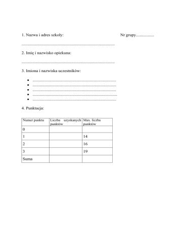 1. Nazwa i adres szkoły: Nr grupy................. ....................................................................................... 2. Imię i nazwisko opiekuna: ....................................................................................... 3. Imiona i nazwiska uczestników: • • • • • .............................................................................. .............................................................................. .............................................................................. ............................................................................... .............................................................................. 4. Punktacja: Numer punktu Liczba uzyskanych Max. liczba punktów punktów 0 1 14 2 16 3 19 Suma