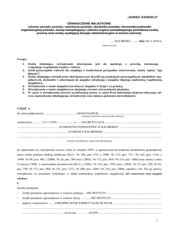 „KONIEC KADENCJI” OŚWIADCZENIE MAJĄTKOWE członka zarządu powiatu, sekretarza powiatu, skarbnika powiatu, kierownika jednostki organizacyjnej powiatu, osoby zarządzającej i członka organu zarządzającego powiatową osobą prawną oraz osoby wydającej decyzje administracyjne w imieniu starosty ......RACIBÓRZ.........., dnia 30.11.2010 r. (miejscowość) Uwaga: 1. 2. 3. 4. 5. 6. Osoba składająca oświadczenie obowiązana jest do zgodnego z prawdą, starannego i zupełnego wypełnienia każdej z rubryk. Jeżeli poszczególne rubryki nie znajdują w konkretnym przypadku zastosowania, należy wpisać “nie dotyczy”. Osoba składająca oświadczenie obowiązana jest określić przynależność poszczególnych składników majątkowych, dochodów i zobowiązań do majątku odrębnego i majątku objętego małżeńską wspólnością majątkową. Oświadczenie o stanie majątkowym dotyczy majątku w kraju i za granicą. Oświadczenie o stanie majątkowym obejmuje również wierzytelności pieniężne. W części A oświadczenia zawarte są informacje jawne, w części B zaś informacje niejawne dotyczące adresu zamieszkania składającego oświadczenie oraz miejsca położenia nieruchomości. CZĘŚĆ A Ja, niżej podpisany(a), .........................................ADAM HAJDUK.................................................................................... (imiona i nazwisko oraz nazwisko rodowe).. urodzony(a) .............13.11.1955r...................... w ..... GŁUBCZYCACH............................................................................ ....................................................... STAROSTWO POWIATOWE W RACIBORZU ........................................................ ....................................................................STAROSTA RACIBORSKI ............................................................................ ................................................................................................................................................................................................ (miejsce zatrudnienia, stanowisko lub funkcja) po zapoznaniu się z przepisami ustawy z dnia 21 sierpnia 1997r. o ograniczeniu prowadzenia działalności gospodarczej przez osoby pełniące funkcje publiczne (Dz.U. Nr 106, poz. 679, z 1998r. Nr 113, poz. 715 i Nr 162, poz. 1126, z 1999r. Nr 49, poz. 483, z 2000r. Nr 26, poz. 306 oraz z 2002r. Nr 113, poz. 984 i Nr 214, poz. 1806) oraz ustawy z dnia 5 czerwca 1998r. o samorządzie powiatowym (Dz.U. z 2001r. Nr 142, poz. 1592 oraz z 2002r. Nr 23, poz. 220, Nr 62, poz. 558, Nr 113, poz. 984, Nr 153, poz. 1271, Nr 200, poz. 1688 i Nr 214, poz. 1806), zgodnie z art. 25c tej ustawy oświadczam, że posiadam wchodzące w skład małżeńskiej wspólności majątkowej lub stanowiące mój majątek odrębny: I. Zasoby pieniężne: − środki pieniężne zgromadzone w walucie polskiej:....NIE DOTYCZY......................................................................... − środki pieniężne zgromadzone w walucie obcej: .............NIE DOTYCZY................................................................... − papiery wartościowe: ........UBEZPIECZENIE EMERTYALNE III FILAR ................................................................ ......................................................................................................................................................................................... ....................................................... na kwotę: …………65.659,-.................................................................................. 1 II. 1. Dom o powierzchni: 106 m2......, o wartości: 350.000,-......tytuł prawny: WSPÓŁWŁASNOŚĆ MAŁŻEŃSKA ....... 2. Mieszkanie o powierzchni: NIE DOTYCZY m2, o wartości: ............. tytuł prawny: ................................................. 3. Gospodarstwo rolne: NIE DOTYCZY rodzaj gospodarstwa:..........................................................., powierzchnia: ............................................................... o wartości:.................................................................................................................................................................... rodzaj zabudowy: ............................. .......................................................................................................................... tytuł prawny: ............................................................................................................................................................... Z tego tytułu osiągnąłem(ęłam) w roku ubiegłym przychód i dochód w wysokości: ................................................ 4. Inne nieruchomości: powierzchnia: ......... DZIAŁKA BUDOWLANA ZABUDOWANA DOMEM ......................................................... ................................... Z POZ II.1. O POW. 0,0770 ha .................................................................................................. o wartości:......... JAK W POZ.II.1 (ŁĄCZNIE Z DOMEM) ......................................................................................... tytuł prawny: ........ WSPÓŁWŁASNOŚĆ MAŁŻEŃSKA ........................................................................................... III. Posiadam udziały w spółkach handlowych — należy podać liczbę i emitenta udziałów: .................NIE DOTYCZY.............................................................................................................................................. ....... .................................................................................................................................................................................... ... ...................................................................................................................................................................