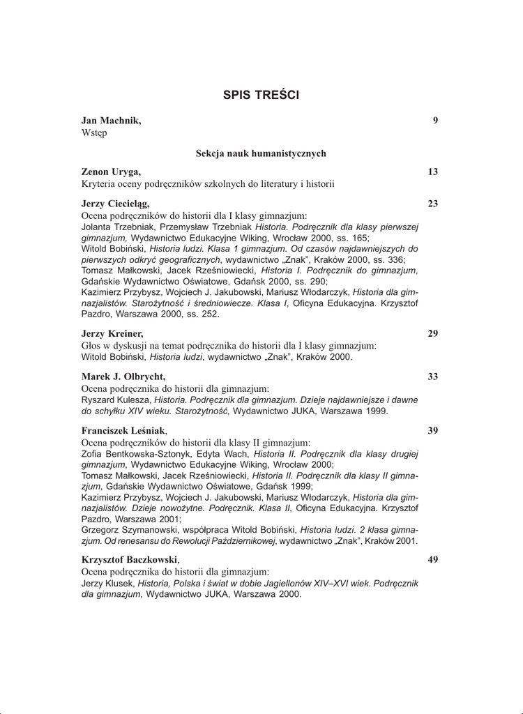 5 SPIS TRECI Jan Machnik, Wstêp 9 Sekcja nauk humanistycznych Zenon Uryga, Kryteria oceny podrêczników szkolnych do literatury i historii 13 Jerzy Cieciel¹g, Ocena podrêczników do historii dla I klasy gimnazjum: 23 Jerzy Kreiner, G³os w dyskusji na temat podrêcznika do historii dla I klasy gimnazjum: 29 Marek J. Olbrycht, Ocena podrêcznika do historii dla gimnazjum: 33 Franciszek Leniak, Ocena podrêczników do historii dla klasy II gimnazjum: 39 Krzysztof Baczkowski, Ocena podrêcznika do historii dla gimnazjum: 49 Jolanta Trzebniak, Przemys³aw Trzebniak Historia. Podrêcznik dla klasy pierwszej gimnazjum, Wydawnictwo Edukacyjne Wiking, Wroc³aw 2000, ss. 165; Witold Bobiñski, Historia ludzi. Klasa 1 gimnazjum. Od czasów najdawniejszych do pierwszych odkryæ geograficznych, wydawnictwo Znak, Kraków 2000, ss. 336; Tomasz Ma³kowski, Jacek Rzeniowiecki, Historia I. Podrêcznik do gimnazjum, Gdañskie Wydawnictwo Owiatowe, Gdañsk 2000, ss. 290; Kazimierz Przybysz, Wojciech J. Jakubowski, Mariusz W³odarczyk, Historia dla gimnazjalistów. Staro¿ytnoæ i redniowiecze. Klasa I, Oficyna Edukacyjna. Krzysztof Pazdro, Warszawa 2000, ss. 252. Witold Bobiñski, Historia ludzi, wydawnictwo Znak, Kraków 2000. Ryszard Kulesza, Historia. Podrêcznik dla gimnazjum. Dzieje najdawniejsze i dawne do schy³ku XIV wieku. Staro¿ytnoæ, Wydawnictwo JUKA, Warszawa 1999. Zofia Bentkowska-Sztonyk, Edyta Wach, Historia II. Podrêcznik dla klasy drugiej gimnazjum, Wydawnictwo Edukacyjne Wiking, Wroc³aw 2000; Tomasz Ma³kowski, Jacek Rzeniowiecki, Historia II. Podrêcznik dla klasy II gimnazjum, Gdañskie Wydawnictwo Owiatowe, Gdañsk 1999; Kazimierz Przybysz, Wojciech J. Jakubowski, Mariusz W³odarczyk, Historia dla gimnazjalistów. Dzieje nowo¿ytne. Podrêcznik. Klasa II, Oficyna Edukacyjna. Krzysztof Pazdro, Warszawa 2001; Grzegorz Szymanowski, wspó³praca Witold Bobiñski, Historia ludzi. 2 klasa gimnazjum. Od renesansu do Rewolucji Padziernikowej, wydawnictwo Znak, Kraków 2001. Jerzy Klusek, Historia, Polska i wiat w dobie Jagiellonów XIVXVI wiek. Podrêcznik dla gimnazjum, Wydawnictwo JUKA, Warszawa 2000. 6 Spis treci Andrzej Essen, Ocena podrêczników do historii dla III klasy gimnazjum: 53 Irena Trzcieniecka-Schneider, Uwagi na temat podrêczników do historii dla III klasy gimnazjum: 75 Ma³gorzata Jastrzêbska, Jaros³aw ¯urawski, Historia III. Podrêcznik dla klasy trzeciej gimnazjum, Wydawnictwo Edukacyjne Wiking, Wroc³aw 2001; W³odzimierz Mêdrzecki, Robert Szuchta, U róde³ wspó³czesnoci. Dzieje nowo¿ytne i najnowsze. Podrêcznik. Historia klasa III, WSiP, Warszawa 2001; Grzegorz Wojciechowski, Historia. Podrêcznik do gimnazjum, Wydawnictwo ARKA Roma Koper, Poznañ 2001. Ma³gorzata Jastrzêbska, Jaros³aw ¯urawski, Historia III. Podrêcznik dla klasy trzeciej gimnazjum, Wydawnictwo Edukacyjne Wiking, Wroc³aw 2001; Grzegorz Wojciechowski, Historia. Podrêcznik do gimnazjum, Wydawnictwo ARKA Roma Koper, Poznañ 2001; W³odzimierz Mêdrzecki, Robert Szuchta, U róde³ wspó³czesnoci. Dzieje nowo¿ytne i najnowsze. Historia. Podrêcznik, WSiP, Warszawa 2001. Ewa Og³oza, 81 Opinia o podrêcznikach To lubiê! do kszta³cenia literackiego i kulturalnego w gimnazjum: Maria Jêdrychowska, Zofia Agnieszka K³akówna, Podrêcznik do jêzyka polskiego. To lubiê! Teksty i zadania. Klasa 1 gimnazjum, Wydawnictwo Edukacyjne, Kraków 1999; Maria Jêdrychowska, Zofia Agnieszka K³akówna, Podrêcznik do jêzyka polskiego. To lubiê! Teksty i zadania. Klasa 2 gimnazjum, Wydawnictwo Edukacyjne, Kraków 2000; Maria Jêdrychowska, Zofia Agnieszka K³akówna, Podrêcznik do jêzyka polskiego. To lubiê! Teksty i zadania. Klasa 3 gimnazjum, Wydawnictwo Edukacyjne, Kraków 2001. Krystyna Kowalik, Ocena podrêcznika 89 Haliny i Tadeusza Zgó³ków Mówiê, wiêc jestem. Podrêcznik jêzyka polskiego dla licealistów, Spó³ka Wydawnicza Od nowa, Kraków 2001, s. 320. Tadeusz Borucki, 99 Najnowsze podrêczniki do jêzyka rosyjskiego (szko³a podstawowa, liceum, technikum): Natalia Kowalska, Danuta Samek, Âîëøåáíàÿ àçáóêà. Jêzyk rosyjski dla uczniów szko³y podstawowej, 1, Wydawnictwo REA, Warszawa 1999; Natalia Kowalska, Danuta Samek, Âîëøåáíàÿ àçáóêà. Jêzyk rosyjski dla uczniów szko³y podstawowej, 2, Wydawnictwo REA, Warszawa 2000; Natalia Kowalska, Danuta Samek, Âîëøåáíàÿ àçáóêà. Jêzyk rosyjski dla uczniów szko³y podstawowej, 3, Wydawnictwo REA, Warszawa 2001; Rozalia Skiba, Ma³gorzata Szczepaniak, Äåëîâàÿ ðå÷ü, Wydawnictwo REA, Warszawa 1998. Tadeusz Szczerbowski, Jêzyk rosyjski po nowemu najnowsze podrêczniki dla gimnazjalistów: W. Gorczyca, B. Lipska-Gorczyca, Ðóññêèé ÿçûê ïî-íîâîìó, Wydawnictwo REA, Warszawa 20002001 109 Spis treci 7 Sekcja nauk matematyczno-przyrodniczych Krzysztof Fia³kowski, 117 Sprawozdanie z prac sekcji nauk matematyczno-przyrodniczych nad recenzjami podrêczników fizyki do gimnazjum: Gra¿yna Francuz-Ornat, Teresa Kulawik, Maria Nowotny-Ró¿añska, Fizyka i astronomia dla gimnazjum, wydawnictwo Nowa Era, Warszawa 1999; Antonina Wies³awa Noweta, Jolanta Swiryd, Fizyka wokó³ nas, Wydawnictwo Edukacyjne Res Polona; Krystyna Tryl, Jerzy Wójciak, Ireneusz cierski, Fizyka 1, 2. Podrêcznik dla gimnazjum, Wydawnictwo Edukacyjne Wiking, Wroc³aw 2000; Maria Rozenbajgier, Ryszard Rozenbajgier, Jerzy M. Kreiner, Fizyka dla gimnazjum, czêæ 1, wydawnictwo Zamiast Korepetycji, Kraków 1999; Maria Rozenbajgier, Ryszard Rozenbajgier, Fizyka dla gimnazjum, czêæ 2, wydawnictwo Zamiast Korepetycji, Kraków 2000; Maria Rozenbajgier, Ryszard Rozenbajgier, Fizyka dla gimnazjum, czêæ 3, wydawnictwo Zamiast Korepetycji, Kraków 2002. Danuta Ciesielska, 129 Opinia o podrêcznikach do matematyki dla gimnazjum wydanych przez Gdañskie Wydawnictwo Owiatowe: Z. Bola³ek, M. Dobrowolska, M. Jucewicz,M. Karpiñski, J. Lech, A. Mysior, Matematyka 1. Podrêcznik dla klasy pierwszej gimnazjum, Gd