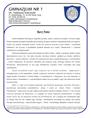 GIMNAZJUM NR 1 im. Tadeusza Kościuszki Pl. Słowackiego 14; 34-400 Nowy Targ tel. (018) 26-659-44 e-mail: [email protected] http://wap.gim1.mom.pl http://www.gimnazjum1.nowytarg.pl Harry Potter Joanne Kathleen Rowling to angielska pisarka, znana z autorstwa książek o świecie magii. Pomysł opisania przygód nastolatka przyszedł jej do głowy podczas 4-godzinnej jazdy pociągiem. Zanim jej podróż dobiegła końca, miała już gotową znaczną część fabuły i wszystkich bohaterów. Do tej pory w przekładzie polskim ukazało się 6 części. Tłumaczenie 7 i zarazem ostatniej jest w przygotowaniu.1 Głównym bohaterem całej serii książek jest Harry Potter - młody czarodziej, bardzo ciężko doświadczony przez los. Już jako niczemu niewinne dziecko spotkało go bardzo dotkliwe przeżycie - utracił rodziców. Zostali oni zamordowani przez najokrutniejszego z czarodziejów - Lorda Voldemorta. W powieści określany jest mianem Tego, Którego Imienia Nie Wolno Wymawiać. Spowodowane to jest jego haniebnymi czynami, które oczerniają całą nację czarodziejów. Akcja wszystkich części sagi rozgrywa się w dwóch światach - magicznym i niemagicznym, czyli mugolskim. Jednak większość istotnych wydarzeń ma miejsce w świecie magii, przede wszystkim w Szkole Magii i Czarodziejstwa w Hogwarcie. Jest ona miejscem, w którym dzieci i nastolatkowi z czarodziejskich rodzin uczą się zaklęć i tego, jak skutecznie bronić się przed złem. Harry w całej serii książek pokazuje, jak burzliwą przemianę (zarówno fizyczną i psychiczną) przechodzą nastolatkowie. Akcja I części pt. „Harry Potter i Kamień Filozoficzny" rozpoczyna się, gdy oddany pod opiekę wujostwa chłopiec kończy 11 lat. Zostaje wówczas przyjęty do Hogwartu, ze względu na swoje magiczne pochodzenie. Z jednej strony cieszy się, bo nareszcie uwolni się od Dursleyów, ale z drugiej ma świadomość tego, że nikogo tam nie zna. Jednak jego odwaga i niezłomność pozwalają mu podjąć tam naukę. Poznaje tam Hermionę - córkę dwójki mugoli - i Rona - nieśmiałego chłopaka o rudych włosach, 1 W maju 2007 roku w prasie ukazała się informacja, że autorka zapowiedziała powstanie kolejnej, ósmej już części książki. Zyski z jej sprzedaży przekaże jednak na cele charytatywne. Natomiast siódma część sagi ma się ukazać na rynku w lipcu 2007 roku. GIMNAZJUM NR 1 im. Tadeusza Kościuszki Pl. Słowackiego 14; 34-400 Nowy Targ tel. (018) 26-659-44 e-mail: [email protected] http://wap.gim1.mom.pl http://www.gimnazjum1.nowytarg.pl pochodzącego z wielodzietnej rodziny Wesleyów. Tak właśnie rozpoczyna się trwała i nierozerwalna przyjaźń trójki uczniów, którzy razem przejdą tyle, że nikomu nawet nie śniłoby się to. Potter miał w sobie pewien urok. Łatwo zjednywał sobie sympatię innych. Nie miał jednak oparcia w swoich rodzicach, którzy zostali mu w okrutny sposób odebrani. Mogłoby się wydawać, że jednak cały czas są z nim i sprawują nad nim pieczę, stawiając na jego drodze wielu dobrych ludzi. Pierwszym z nich jest gajowy w Hogwarcie - Hagrid. To półolbrzym o bardzo miłym usposobieniu. Stopniowo to grono powiększa się i Harry cieszy się sympatią Dumbledora (dyrektora szkoły), prof. McGonagall (opiekunki jego szkolnego domu, Gryffindoru), całej rodziny Wesleyów oraz swojego ojca chrzestnego, który okazuje się być zbiegiem z Azkabanu - najgorszego z więzień w świecie czarodziejów. Jego postać zostaje nam przedstawiona w III części sagi pt. „Harry Potter i Więzień Azkabanu". W szkole i otoczeniu nie brakuje jednak ludzi źle życzących Harry'emu. Są to m.in. Draco Malfoy wraz ze swoim ojcem Lucjuszem, profesor Umbrigde (objęła stanowisko p.o. dyrektora Hogwartu w V części „Harry Potter i Zakon Feniksa") oraz zbuntowana czarownica Bellatrix, która w V części książki zabija najbliższą Harry'emu osobę - Syriusza Blacka. Jedyną postacią, którą bardzo trudno jest wyczuć, jest prof. Severus Snape. To były sługa Lorda Voldemorta, najgorszego z wrogów Pottera. Wielokrotnie pokazuje, że chce bronić nastolatka, a w efekcie okazuje się, że nadal jest wiernym śmierciożercą. Wydaje młodego czarodzieja Czarnemu Panu i bez żadnych skrupułów zabija prof. Dumbledora -jedynego, który mu zaufał. Jak widać, to człowiek bardzo fałszywy, który działa na pograniczu dobra i zła, aby w końcu pokazać swoje prawdziwe, podłe JA. Harry z łatwością uczy się nowych zaklęć. Prawie wszystkie wychodzą mu za pierwszym razem. Te, których nie potrafił opanować, ćwiczył tak długo, aż był usatysfakcjonowany efektami. Tak było z zaklęciem Patronusa, które należało do tych najtrudniejszych. Tylko jego wytrwałość i zawziętość sprawiły, że uczył się go tak długo, aż wreszcie zaczęło mu wychodzić. Dzięki temu zdołał uratować Syriusza od dementorów. Ulubionym przedmiotem nastoletniego czarodzieja była Obrona Przed Czarną Magią. GIMNAZJUM NR 1 im. Tadeusza Kościuszki Pl. Słowackiego 14; 34-400 Nowy Targ tel. (018) 26-659-44 e-mail: [email protected] http://wap.gim1.mom.pl http://www.gimnazjum1.nowytarg.pl Okazywało się jednak, że co roku w szkole pojawiał się nowy nauczyciel. Jak Harry potem zauważył, każdy z nich był sługą Lorda Voldemorta i miał doprowadzić do tego,a by chłopak był jak najbliżej Czarnego Pana. Akcja całej serii książek jest bardzo dynamiczna i potrafi pochłonąć czytelnika w całości. Wiele pasjonujących przygód i niebezpieczeństw, w jakie popadają główni bohaterowie, sprawia, że ze zniecierpliwieniem oczekujemy rozwiązania każdej sytuacji. Myślę, że powieści o małym czarodzieju są warte uwagi wszystkich czytelników, nie tylko tych najmłodszych. Mimo, że Joanne K. Rowling nie spotkała się na początku z aprobatą, to jej książki są bardzo chętnie czytane. Musimy pamiętać, że wielu ludzi oskarżało ją o propagowanie satanizmu 