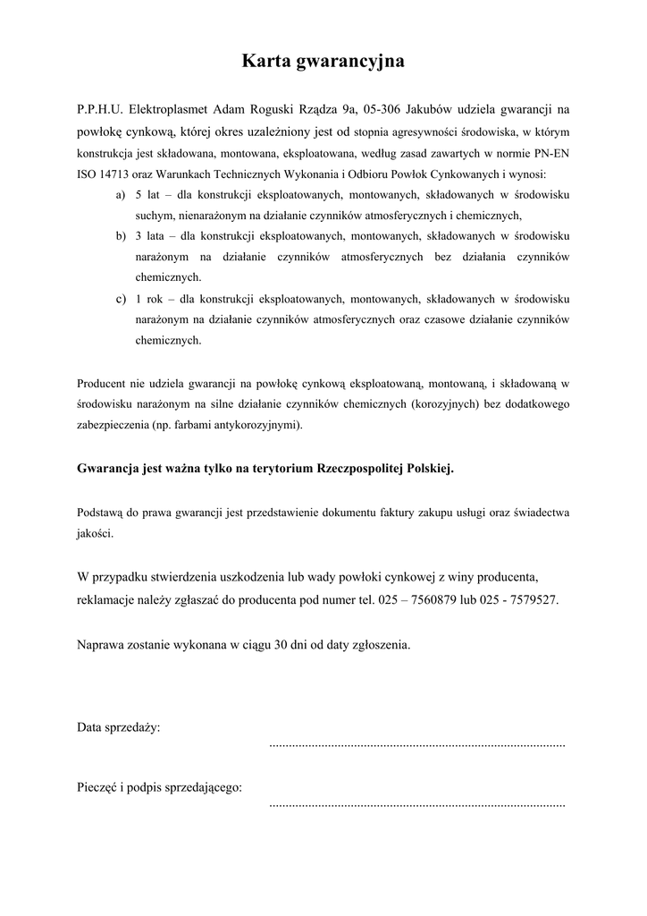 Karta gwarancyjna P.P.H.U. Elektroplasmet Adam Roguski Rządza 9a, 05-306 Jakubów udziela gwarancji na powłokę cynkową, której okres uzależniony jest od stopnia agresywności środowiska, w którym konstrukcja jest składowana, montowana, eksploatowana, według zasad zawartych w normie PN-EN ISO 14713 oraz Warunkach Technicznych Wykonania i Odbioru Powłok Cynkowanych i wynosi: a) 5 lat – dla konstrukcji eksploatowanych, montowanych, składowanych w środowisku suchym, nienarażonym na działanie czynników atmosferycznych i chemicznych, b) 3 lata – dla konstrukcji eksploatowanych, montowanych, składowanych w środowisku narażonym na działanie czynników atmosferycznych bez działania czynników chemicznych. c) 1 rok – dla konstrukcji eksploatowanych, montowanych, składowanych w środowisku narażonym na działanie czynników atmosferycznych oraz czasowe działanie czynników chemicznych. Producent nie udziela gwarancji na powłokę cynkową eksploatowaną, montowaną, i składowaną w środowisku narażonym na silne działanie czynników chemicznych (korozyjnych) bez dodatkowego zabezpieczenia (np. farbami antykorozyjnymi). Gwarancja jest ważna tylko na terytorium Rzeczpospolitej Polskiej. Podstawą do prawa gwarancji jest przedstawienie dokumentu faktury zakupu usługi oraz świadectwa jakości. W przypadku stwierdzenia uszkodzenia lub wady powłoki cynkowej z winy producenta, reklamacje należy zgłaszać do producenta pod numer tel. 025 – 7560879 lub 025 - 7579527. Naprawa zostanie wykonana w ciągu 30 dni od daty zgłoszenia. Data sprzedaży: ........................................................................................... Pieczęć i podpis sprzedającego: ........................................................................................... P.P.H.U „Elektroplasmet“ Adam Roguski Rządza 9a, 09-306 Jakubów Tel./fax 025-7579527, Tel. 025-7579329, Tel. Kom. 0601229753 Cynkowanie ogniowe Świadectwo Jakości Nr ...................... Zleceniodawca: .................................................................................................................... ....................................................................................................................... ....................................................................................................................... Dotyczy następujących konstrukcji: 1. ............................................................................... 2. ............................................................................... 3. ............................................................................... Całkowita waga ...............................................kg Powłoka cynkowa nałożona metodą ogniową na konstrukcjach stalowych wykonana jest zgodnie z normą PN-EN ISO 1461. Okres gwarancji uzależniony jest od stopnia agresywności środowiska, w którym ww. konstrukcja będzie składowana, montowana i eksploatowana według zasad określonych w normie PN-EN ISO 14713 oraz Warunkach Technicznych Wykonania i Odbioru Powłok Cynkowniczych w P.P.H.U. Elektroplasmet. Świadectwo jakości dotyczy wykonanych usług cynkowania według faktur VAT: Lp. Nr faktury Data wystawienia faktury Ilość w kg Razem: Data i podpis osoby wystawiającej …………………………………………………………….. Protokół kontroli grubości powłoki cynkowej Zgodnie z EN ISO 1461 dnia …………………. przeprowadzono pomiary kontrolne grubości powłoki cynkowej. Średnia grubość powłoki wynosi: 1. ……………………….. 2. ……………………….. 3. ……………………….. 4. ……………………….. 5. ……………………….. 6. ……………………….. ………………………………….. podpis