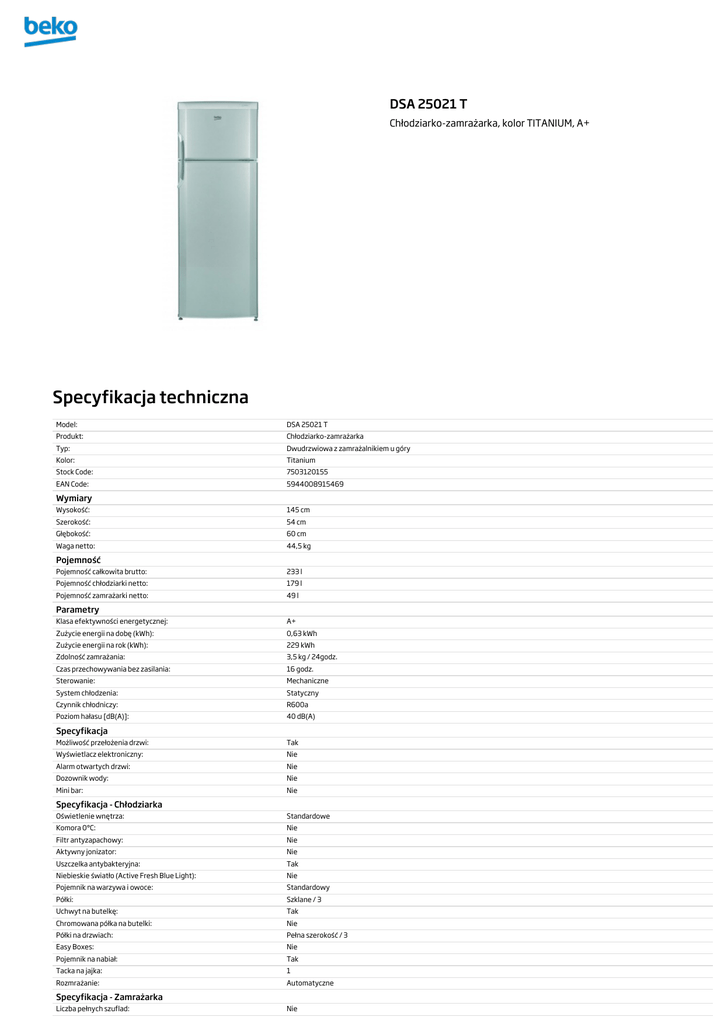 DSA 25021 T Chłodziarko-zamrażarka, kolor TITANIUM, A+ Specyfikacja techniczna Model: DSA 25021 T Produkt: Chłodziarko-zamrażarka Typ: Dwudrzwiowa z zamrażalnikiem u góry Kolor: Titanium Stock Code: 7503120155 EAN Code: 5944008915469 Wymiary Wysokość: 145 cm Szerokość: 54 cm Głębokość: 60 cm Waga netto: 44,5 kg Pojemność Pojemność całkowita brutto: 233 l Pojemność chłodziarki netto: 179 l Pojemność zamrażarki netto: 49 l Parametry Klasa efektywności energetycznej: A+ Zużycie energii na dobę (kWh): 0,63 kWh Zużycie energii na rok (kWh): 229 kWh Zdolność zamrażania: 3,5 kg / 24godz. Czas przechowywania bez zasilania: 16 godz. Sterowanie: Mechaniczne System chłodzenia: Statyczny Czynnik chłodniczy: R600a Poziom hałasu [dB(A)]: 40 dB(A) Specyfikacja Możliwość przełożenia drzwi: Tak Wyświetlacz elektroniczny: Nie Alarm otwartych drzwi: Nie Dozownik wody: Nie Mini bar: Nie Specyfikacja - Chłodziarka Oświetlenie wnętrza: Standardowe Komora 0°C: Nie Filtr antyzapachowy: Nie Aktywny jonizator: Nie Uszczelka antybakteryjna: Tak Niebieskie światło (Active Fresh Blue Light): Nie Pojemnik na warzywa i owoce: Standardowy Półki: Szklane / 3 Uchwyt na butelkę: Tak Chromowana półka na butelki: Nie Półki na drzwiach: Pełna szerokość / 3 Easy Boxes: Nie Pojemnik na nabiał: Tak Tacka na jajka: 1 Rozmrażanie: Automatyczne Specyfikacja - Zamrażarka Liczba pełnych szuflad: Nie Liczba komór: Nie Kostki lodu: - Komora Multi-Zone: Nie Rozmrażanie: Ręczne Komora szybkiego mrożenia: Nie Technologie Klasa energetyczna A+ Produkty Beko posiadające klasę energetyczną A+ nie tylko przyczyniają się do podreperowania rodzinnego budżetu, ale również dbają o środowisko naturalne. Modele z klasą A+ zużywają jeszcze mniej energii niż identyczne modele w klasie A. Uszczelka antybakteryjna - chłodzenie Uszczelki w drzwiach zwykle trudno utrzymać w czystości, co czyni z nich doskonałe środowisko dla rozwoju bakterii. Dzięki dodatkowi substancji antybakteryjnych, uszczelki nie tylko same pozostają wolne od drobnoustrojów, ale tworzą antybakteryjną barierę chroniącą wnętrze chłodziarki przed niepożądanymi mikroorganizmami. Uchwyt na butelki Uchwyt na butelki zawieszony obok szklanych półek jest idealnym rozwiązaniem na wykorzystanie przestrzeni pomiędzy dwiema pólkami. Antybakteryjne rączki Specjalna antybakteryjna powłoka na rączkach w drzwiach sprawia, że są one wolne od bakterii a tym samym zapobiegają przenoszeniu ich na pożywienie wewnątrz lodówki.