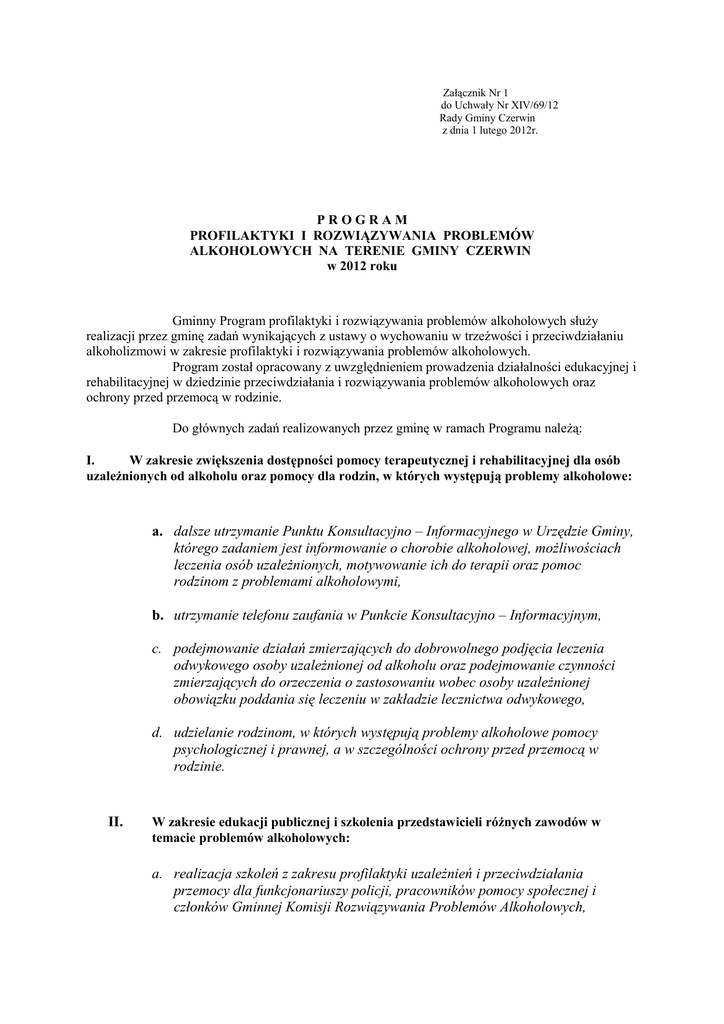 Załącznik Nr 1 do Uchwały Nr XIV/69/12 Rady Gminy Czerwin z dnia 1 lutego 2012r. PROGRAM PROFILAKTYKI I ROZWIĄZYWANIA PROBLEMÓW ALKOHOLOWYCH NA TERENIE GMINY CZERWIN w 2012 roku Gminny Program profilaktyki i rozwiązywania problemów alkoholowych służy realizacji przez gminę zadań wynikających z ustawy o wychowaniu w trzeźwości i przeciwdziałaniu alkoholizmowi w zakresie profilaktyki i rozwiązywania problemów alkoholowych. Program został opracowany z uwzględnieniem prowadzenia działalności edukacyjnej i rehabilitacyjnej w dziedzinie przeciwdziałania i rozwiązywania problemów alkoholowych oraz ochrony przed przemocą w rodzinie. Do głównych zadań realizowanych przez gminę w ramach Programu należą: I. W zakresie zwiększenia dostępności pomocy terapeutycznej i rehabilitacyjnej dla osób uzależnionych od alkoholu oraz pomocy dla rodzin, w których występują problemy alkoholowe: a. dalsze utrzymanie Punktu Konsultacyjno – Informacyjnego w Urzędzie Gminy, którego zadaniem jest informowanie o chorobie alkoholowej, możliwościach leczenia osób uzależnionych, motywowanie ich do terapii oraz pomoc rodzinom z problemami alkoholowymi, b. utrzymanie telefonu zaufania w Punkcie Konsultacyjno – Informacyjnym, c. podejmowanie działań zmierzających do dobrowolnego podjęcia leczenia odwykowego osoby uzależnionej od alkoholu oraz podejmowanie czynności zmierzających do orzeczenia o zastosowaniu wobec osoby uzależnionej obowiązku poddania się leczeniu w zakładzie lecznictwa odwykowego, d. udzielanie rodzinom, w których występują problemy alkoholowe pomocy psychologicznej i prawnej, a w szczególności ochrony przed przemocą w rodzinie. II. W zakresie edukacji publicznej i szkolenia przedstawicieli różnych zawodów w temacie problemów alkoholowych: a. realizacja szkoleń z zakresu profilaktyki uzależnień i przeciwdziałania przemocy dla funkcjonariuszy policji, pracowników pomocy społecznej i członków Gminnej Komisji Rozwiązywania Problemów Alkoholowych, b. dofinansowanie szkoleń, kursów specjalistycznych w zakresie pracy z dziećmi, młodzieżą oraz rozwijanie umiejętności prowadzenia zajęć profilaktycznych dla nauczycieli, którzy deklarują gotowość podjęcia pracy profilaktycznej z dziećmi i młodzieżą, zatrudnionych w placówkach oświatowych na terenie gminy, c. udział w przeprowadzeniu programu profilaktyczno – edukacyjnego zorganizowanego przez Państwową Agencję Rozwiązywania Problemów Alkoholowych lub inne organizacje. III. W zakresie prowadzenia profilaktycznej działalności informacyjnej i edukacyjnej w szczególności dla młodzieży promującej wartościowy i zdrowy styl życia oraz uczącej umiejętności potrzebnych do życia bez alkoholu: a. organizowanie lokalnych imprez profilaktycznych (koncerty, festyny, heppeningi, zawody sportowe) dla dzieci i młodzieży bez udziału alkoholu i w szczególny sposób eksponujących ten fakt poprzez specjalny program lub zaproszonych gości, b. wspieranie programów i przedsięwzięć profilaktycznych opracowanych i realizowanych przez młodzież, skierowanych do grup rówieśniczych (pogłębiające wiedzę i umiejętności z zakresu profilaktyki uzależnień i promocji zdrowia), c. udział w finansowaniu powstających miejsc, w których młodzi ludzie mogą spędzać czas bez alkoholu jak kluby, świetlice wiejskie i młodzieżowe, siłownie itp., d. współpraca z kuratorami prowadzącymi osoby poddane leczeniu, e. zakup sprzętu RTV (oraz innego sprzętu ) dla szkół podstawowych i gimnazjum do realizacji programów związanych z problematyką uzależnień wśród młodzieży, f. realizowanie w szkołach programów edukacyjno – profilaktycznych z zakresu profilaktyki, uzależnień i przeciwdziałania przemocy, g. kontynuowanie przez dyrektorów szkół podstawowych i gimnazjum działań na rzecz wychowania w trzeźwości poprzez organizowanie zajęć pozalekcyjnych (kół zainteresowań, dyskotek, konkursów, zawodów sportowych, itp.), h. zorganizowanie przez Gminną Bibliotekę lub Placówki Oświatowe konkursu plastycznego o problematyce przeciwalkoholowej, i. dofinansowanie wypoczynku letniego (obozy, wycieczki itp.) połączonego z realizacją programów profilaktycznych dla dzieci z rodzin, w których występuje problem alkoholowy, j. zorganizowanie dydaktycznych spektakli teatralnych dla dzieci i młodzieży lub innych inicjatyw kulturalno – rozrywkowych służących profilaktyce alkoholowej, IV. W zakresie pomocy osobom uzależnionym: a. organizacja leczenia i rehabilitacji osób uzależnionych od alkoholu, b. motywowanie do leczenia osób uzależnionych, c. pomoc finansowa na pokrycie kosztów dojazdu dla osób podejmujących leczenie odwykowe w ośrodkach lecznictwa odwykowego, V. W zakresie wspomagania (finansowego) działalności instytucji, stowarzyszeń i osób fizycznych realizujących zadania z zakresu rozwiązywania problemów alkoholowych a. dofinansowanie ośrodków terapii i lecznictwa odwykowego, b. dofinansowanie organizacji młodzieżowych i innych instytucji na terenie naszej gminy realizujących zdania z zakresu przeciwdziałania alkoholizmowi, c. zabezpieczenie środków finansowych na wynagrodzenia za udział w posiedzeniach i szkolenia członków Komisji RPA, d. finansowanie powstających inicjatyw społecznych w zakresie krzewienia trzeźwości wśród lokalnej społeczności jak również w szkołach i organizacjach społecznych i młodzieżowych np. koncerty, heppeningi, zawody sportowe dla dzieci i młodzieży, e. współpraca z Ośrodkiem Pomocy Społecznej, f. współdziałanie z Komisariatem Policji w związku z interwencjami domowymi i zjawiskami przemocy. VI. Kontrolowanie przestrzegania zasad obrotu alkoholami określonymi w uchwałach Rady Gminy i ustawie o wychowaniu w trzeźwości i przeciwdziałaniu alkoholizmowi: a. przeprowadzanie bieżących kontroli w punktach sprzedaży napojów alkoholowych w zakresie przestrz