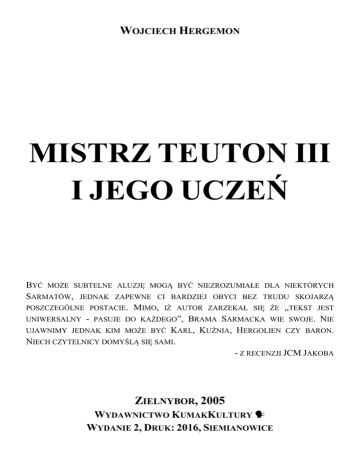 WOJCIECH HERGEMON MISTRZ TEUTON III I JEGO UCZEŃ BYĆ MOŻE SUBTELNE ALUZJĘ MOGĄ BYĆ NIEZROZUMIAŁE DLA NIEKTÓRYCH SARMATÓW, JEDNAK ZAPEWNE CI BARDZIEJ OBYCI BEZ TRUDU SKOJARZĄ POSZCZEGÓLNE POSTACIE. MIMO, IŻ AUTOR ZARZEKAŁ SIĘ ŻE „TEKST JEST UNIWERSALNY - PASUJE DO KAŻDEGO”, BRAMA SARMACKA WIE SWOJE. NIE UJAWNIMY JEDNAK KIM MOŻE BYĆ KARL, KUŹNIA, HERGOLIEN CZY BARON. NIECH CZYTELNICY DOMYŚLĄ SIĘ SAMI. - Z RECENZJI JCM JAKOBA ZIELNYBOR, 2005 WYDAWNICTWO KUMAKKULTURY WYDANIE 2, DRUK: 2016, SIEMIANOWICE 2|Strona Wstęp Pragnę na początku zaznaczyć, że wydarzenia opisane w tej książce są oczywiście fikcyjne, tak samo jak Mistrz Teuton III oraz jego uczeń, nie mają nic wspólnego z prawdziwą Teutonią, a przekazują jedynie co ciekawsze wypowiedzi niektórych Teutończyków, ich poglądy. Mam nadzieję, że ci co przeczytają te „dzieło” przemyślą swoje postępowanie i się poprawią. Autor 3|Strona I Razu pewnego w Teutonii zebrało się dwóch najbystrzejszych ludzi - mistrz Teuton III i jego uczeń. Mistrz dzień i noc poświęcał, aby wpoić w swego ucznia wszelkie prawidłowe zasady, jednak uczeń zawsze wiedział swoje – w kolejnych rozdziałach opowiem więc co ciekawsze wydarzenia z ich życia. 4|Strona II Pewnego razu kiedy mistrz szedł razem ze swoim uczniem, i kiedy siedli razem w karczmie spotkali dwóch ludzi, którzy zawzięcie się kłócili o jakieś sprawy, wynikało z tego, że jeden z nich jest przełożonym drugiego, który to zdecydowanie nie zgadzał się z argumentami tego pierwszego, aby Gwardię Cesarską wyposażyć w łuki... - Mam wrażenie, że Pan źle rozumie pewne przepisy – ryknął dowódca – przypominam, że jestem najwyższym zwierzchnikiem i naczelnym dowódcą Gwardii! - Tak jest – odparł drugi – więc, jeśli Pan będzie chciał zrobić z Gwardii wojsko to ja złożę rezygnację! Ale dowódca, który pobierał nauki polityczne odparł: – Proszę mnie tu nie szantażować i rozmawiać sobie z kanclerzem! - Ja nie szantażuje – odparł podwładny – po za tym, doskonale Pan wie że Kanclerz wyjechał! - Wiec proszę rozmawiać z podkanclerzem. - Podkanclerz gdzieś zniknął! - Zawsze jak jest potrzebny to go nie ma... Podwładny wybiegł wtedy z karczmy poszukując barona Zielnyboru, który obecnie był podkanclerzem i jak zawsze kiedy był potrzebny to go nie było... Wrócił po dłuższej chwili zdyszany. - Podkanclerz przedstawił Ci nasze stanowisko? – spytał dowódca – To jest stanowisko Senatu Marchii. - Przedstawił. 5|Strona - Więc mam nadzieje, że się z tymże stanowiskiem już zgadzasz? - Którym? – zaironizował podwładny – Tym co zniszczy Teutonię?! - Nic nie zniszczy Teutonii! Teutonia jest najbardziej rozwiniętym krajem, o najwspanialszej kulturze i tradycji, jest też najluźniej związana z innymi państwami! – ryknął dowódca – Każdy z nas ma swoją hierarchię wartości, u Ciebie na pierwszym miejscu jest polityka zagraniczna, później Teutonia, u mnie jest na odwrót. - Nie! Nieprawda, Teutonia dała mi wszystko! - I na zawsze dobro Teutonii pozostanie dla mnie najwyższym prawem i przykazaniem! A więc...? - Ale czy to jest dobrem Teutonii? - Nie mnie o tym decydować – odparł przełożony. - Ty i jeszcze paru, jesteście niewidoczną ręką, która kieruje Teutonią! - A czego się spodziewasz po najwyższych urzędnikach? Wiesz co by powiedział baron Zielnyboru? Że nie jesteś przyzwyczajony do polityki. - Jak sobie żywnie chcecie. - Spokojnie... – powiedział wyćwiczonym tonem dowódca – nie przejmuj się aż tak tym. - Powinniśmy żyć w cywilizowanym nurcie oświecenia! - Duch oświecenia nigdy nie dotarł na Teutony. – powiedział dobitnie dowódca – Było już na to za późno, u nas panuje Teutonizm i do tej pory jesteś pierwszym, który tego nie akceptuje. 6|Strona - Teutonia, nie jest taka wspaniała jaką mnie się wydawała. I w tym momencie wyszli... Patrz i ucz się – powiedział mistrz – to był sam Cesarz Hergolien Wielki i dowódca Gwardii Cesarskiej... 7|Strona III Innym razem kiedy to szli razem mistrz i uczeń, młodszy spytał pokazując na człowieka siedzącego w cieniu: - Cóż to za człowiek, czemu jako jedyny nic nie robi? - To jest Karl, Czyściciel toalet miejskich stworzonych przez Cesarza. – odparł mistrz – Nie robi nic bo nikt z tych kibli nie korzysta. - Któż chciałby taką pracę? - Tu się mylisz, jest to najbardziej prestiżowy zawód, a ten Slavianczyk bierze drugą pensję po baronie Zielnyboru. I tak zakończyła się jedna z bardziej znanych nauk mistrza... 8|Strona IV I znowu spotkali mistrz i uczeń idących Cesarza i Dowódcę Gwardii: - I jak nowe stopnie? – spytał Cesarz Hergolien. - Proszę, tu jest ostatni pagon – Marszałka Teutonii. Pewnikiem nikt tego stopnia nie dostanie, ale... Po to właśnie jest. W dowód najwyższego uznania – odparł dowódca Gwardii Cesarskiej. Wnioski uczeń wysnuł sam... 9|Strona V Innym razem Mistrz zwierzył się swemu uczniowi z swego pomysłu – Teutonizmu: - Teutonizm jest nowym nurtem – powiedział mistrz – on odświeży Teutonię! Po czym opowiedział uczniowi o założeniach Teutonizmu. - Mistrzu! – krzyknął uczeń – To doprowadzi do Ruiny! - Kanclerz jest ogarnięty Teutonizmem – spokojnie odparł Mistrz – baron Zielnyboru, cały rząd też. Nawet Hergolien przyznaje mi rację! - Ale co ja mam teraz zrobić? - spytał zaskoczony uczeń. - Jeśli nie umiesz pokonać wroga, to się do niego przyłącz, zapraszam. - Jeśli to jest dobre, tak uczynię – odparł uczeń i tak zakończył się spór. - Podoba mi się, ale teraz ogarnia nas błogi Teutonizm – dodał mistrz uśmiechając się szeroko. 10 | S t r o n a VI Kiedy indziej mistrz i uczeń zakradli się pod okna barona Zielnyboru. - On jakiś pazerny jest! - A co? – spytał Baron - On chce wyposażyć Gwardię Cesarską w broń! Cholera! - Tak, o to chodzi pr