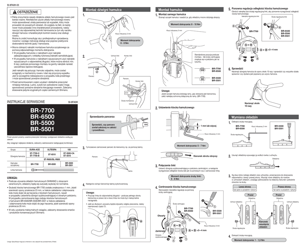 SI-8FA0H-03 Montaż dźwigni hamulca OSTRZEŻENIE • Pełne zrozumienie zasady działania układu hamulcowego roweru jest bardzo ważne. Niewłaściwe użycie układu hamulcowego roweru może spowodować utratę panowania lub wypadek, który może prowadzić do poważnych obrażeń. Ze względu na fakt, że każdy rower może posiadać inne charakterystyki prowadzenia, należy nauczyć się odpowiedniej techniki hamowania (w tym siły nacisku dźwigni hamulca i charakterystyki kontroli roweru) oraz obsługi roweru. Można to zrobić konsultując się z profesjonalnym sprzedawcą rowerów i czytając instrukcję obsługi oraz poprzez praktyczne doskonalenie techniki jazdy i hamowania. • Mocno dokręcić nakrętki montażowe hamulca szczękowego za pomocą odpowiedniego momentu dokręcania. • W przypadku hamulców z nakrętkami użyć nakrętek zabezpieczających z wkładką nylonową (nakrętki samoblokujące). • W przypadku hamulców z nakrętkami wpuszczanymi użyć nakrętek wpuszczanych o odpowiedniej długości, które można obrócić min. 6 razy; podczas ponownego montażu na gwinty nakrętek nanieść uszczelniacz (spoiwo blokujące). Jeśli nakrętki się poluzują i hamulec odpadnie, może zostać wciągnięty w mechanizmy roweru i stać się przyczyną wypadku. Jest to szczególnie niebezpieczne w przypadku koła przedniego i może spowodować poważne obrażenia. regulacja odległości klocka hamulcowego 5. Ponowna Obrócić nakrętkę (lub śrubę) regulacyjną linki, aby ponownie wyregulować odległość Montaż hamulca Montaż samego hamulca 1. Ścisnąć szczęki hamulca i osadzić je, gdy okładziny mocno dotykają obręczy 1. klocka hamulcowego. mulc Naakrętka regulacyjna linki Śruba regulacyyjna linki Moment dokręcania: 8 - 10 Nm Klucz imbusowy 5 mm Klucz imbusowy 5 mm Moment dokręcania: 6 - 8 Nm =3—4 mm 2. Uchwyt linki Standardowa pozycja podczas montażu - łeb śruby centrującej znajduje się w położeniu jak na rysunku. Koniec linki 6. Sprawdzić Nacisnąć dźwignię hamulca do oporu około 10 razy i sprawdzić czy wszystko działa sprawnie i czy dystans jest poprawny po użyciu hamulca. Pancerz Pancerz Koniec linki • Przed zamontowaniem części uzyskać i dokładnie przeczytać niniejszą instrukcję. Luźne, zużyte lub uszkodzone części mogą spowodować poważne obrażenia kierującego rowerem. Zalecamy stosowanie jedynie oryginalnych części zamiennych Shimano. Uwaga: Jeżeli szczęki hamulca dotykają ramy, gdy obracana jest kierownica, załóż naklejkę ochronną dołączoną do ramy. (BR-7700) INSTRUKCJE SERWISOWE Śruba montażowa SI-8FA0H Nacisnąć około 10 razy Uchwyt linki 2. Ustawienie klocka hamulcowego BR-7700 BR-6500 BR-5500 BR-5501 Sprawdzanie pancerza Wymiana okładzin 1. Odkręcić śrubę mocującą. Sprawdzić, czy pancerz został założony w całości i prawidłowo. 1 mm lub więcej Klucz imbusowy 4 mm Klucz imbusowy 2 mm Śruba regulacyjna Przed użyciem prosimy uważnie przeczytać instrukcję i postępować dokładnie według jej zaleceń. Aby osiągnąć najlepsze działanie, zalecamy zastosowanie następującej kombinacji. Grupa DURA-ACE Dźwignia hamulca ST-7700-C ST-7700-B ULTEGRA 105 ST-6510 ST-5500-CA ST-5510 Moment dokręcania: 5 - 7 Nm ta 3. Tymczasowo zamocować pancerz do kierownicy np. za pomocą taśmy. Kierunek obrotu obręczy Pancerz 2. Usunąć okładzinę wysuwając ją wzdłuż rowka z uchwytu. Okładzina ST-R600/BL-R600 BR-7700 BR-6500 BR-5500 BR-5501 Połączenie linki 3. Ustawić dźwignię szybkozwalniającą w położeniu zamkniętym, a następnie Linka hamulca Taśma wyregulować odległość klocka (tak jak na poniższym rys.) i zamocować linkę. • Podczas używania okładzin hamulcowych SHIMANO z obręczami ceramicznymi, okładziny będą się zużywały szybciej niż normalnie. • Grubość klocka hamulcowego BR-7700 została zwiększona o 1 mm. Jeżeli szerokość opony przekracza 23 mm, w trakcie zakładania i zdejmowania koła może dojść do jej haczenia z klockiem hamulcowym, nawet w przypadku ustawienia dźwigni szybkozwalniającej w otwartym położeniu. W przypadku zamontowania tego rodzaju klocków hamulcowych z hamulcami BR-6500/BR-5500/BR-5501 w trakcie zakładania i zdejmowania koła może dojść do jego haczenia, jeżeli szerokość opony przekracza 26 mm. dwa różne rodzaje okładzin oraz uchwytów, przeznaczone do stosowania 3. Są odpowiednio z lewej i prawej strony. Wsunąć nowe okładziny do rowków Moment dokręcania śruby linki: 6 - 8 Nm UWAGA: 4. Następnie owinąć kierownicę taśmą wykończeniową. Uwaga: w uchwytach okładzin, uważając jednocześnie na właściwy kierunek i położenie otworów na śruby. Centrowanie klocka hamulcowego 4. Wprowadzić niewielkie regulacje za pomocą Lewa strona Prawa strona Tak samo w przednim i tylnym Tak samo w przednim i tylnym śruby centrującej. Przód • Przyciąć linkę do odpowiedniej długości - podczas pełnego obrotu kierownicą w prawo lub w lewo linka nie może być maksymalnie naciągnięta. Okładzina Uchwyt okładziny Uchwyt okładziny Śruba centrująca • Jeśli po dłuższym używaniu będzie słyszalny odgłos piszczenia, należy nasmarować części A. DO PRZODU • W celu uzyskania maksymalnych osiągów, zalecamy stosowanie smarów i produktów konserwacyjnych Shimano. Otwarty Klucz imbusowy 3 mm Śruba regulacyjna Zamknięty tyy Dźwignia szybkozwalniająca Uwaga: Specyfikacje mogą być zmieniane w celu ulepszeń bez powiadomienia. (Polski) Przód Okładzina DO PRZODU Hamulec szczękowy Kierunek wsunięcia okładzin =3—4 mm 4. Dokręcić śrubę mocującą. Moment dokręcenia: 1 - 1,5 Nm Śruba regulacyjna