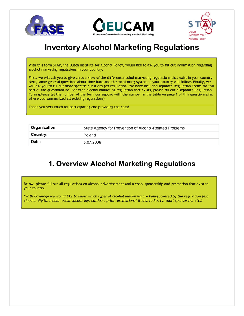 Inventory Alcohol Marketing Regulations With this form STAP, the Dutch Institute for Alcohol Policy, would like to ask you to fill out information regarding alcohol marketing regulations in your country. First, we will ask you to give an overview of the different alcohol marketing regulations that exist in your country. Next, some general questions about time bans and the monitoring system in your country will follow. Finally, we will ask you to fill out more specific questions per regulation. We have included separate Regulation Forms for this part of the questionnaire. For each alcohol marketing regulation that exists, please fill out a separate Regulation Form (please let the number of the form correspond with the number in the table on page 1 of this questionnaire, where you summarized all existing regulations). Thank you very much for participating and providing the data! Organization: State Agency for Prevention of Alcohol-Related Problems Country: Poland Date: 5.07.2009 1. Overview Alcohol Marketing Regulations Below, please fill out all regulations on alcohol advertisement and alcohol sponsorship and promotion that exist in your country. *With Coverage we would like to know which types of alcohol marketing are being covered by the regulation (e.g. cinema, digital media, event sponsoring, outdoor, print, promotional items, radio, tv, sport sponsoring, etc.) Alcohol Marketing Regulations Questionnaire No. 1. Name Regulation (original) Ustawa o wychowaniu w trzeźwości i przeciwdziałaniu alkoholizmowi Name Regulation (English translation) Act on upbringing in sobriety and counteracting alcoholism of October 26th, 1982 Date latest update Link to original text Currently updated http://www.parpa.pl/in dex.php?option=com _content&task=view& id=2&Itemid=6 Type of Regulation Coverage* Statutory/ Legal Tv Radio Cinema Sponsoring Internet / digital media Outdoor Print Prom. Items Other, namely: Non-statutory/ Self regulation Co-regulation All 2. 3. Kodeks Etyki Reklamy- Kodeks Reklamowy Związku Przemysłu Piwowarskiego Browary Polskie (Standardy Reklamy Piwa) Code of Ethics in Advertising - The Advertising Code of the Union of the Brewing Industry Employers in Poland (Standards of Beer Advertising) 4.06.2008 Kodeks Postępowania Marketingowego Przemysłu Spirytusowego Code of Marketing Conduct of the Spirit Industry data not found (published on the web page in 2008) http://www.radarekla my.pl/zalacznik-nr-1standardy-reklamypiwa.htm Statutory/ Legal Non-statutory/ Self regulation Co-regulation Page 2 http://www.pps.waw.p l/pliki/Certyfikaty/KOD EKS.pdf Statutory/ Legal Non-statutory/ Self regulation Co-regulation Tv Radio Cinema Sponsoring Internet / digital media Outdoor Print Prom. Items Other, namely: Tv Radio Cinema Sponsoring Internet / digital media Outdoor Print Prom. Items Other, namely: marketing and promotion in the places selling alcohol, promotion in the place of business, direct marketing, labeling and packaging, communication with clients and consumers, naming products 7/29/2010 Alcohol Marketing Regulations Questionnaire 2. Watersheds / Time bans We would like to know more about time bans or watersheds in your country on alcohol marketing on TV, radio and in the cinema. Also if no alcohol advertising is allowed at all for this type of medium, please indicate. Time ban on TV? Is there a watershed (time ban) for alcohol advertising on TV in 1 your country? 2 In which regulation is the TV time ban embedded? 3 Is sponsorship of TV programmes during this watershed still permitted? (e.g. a movie or soap series sponsored by an alcohol producer) Is sponsorship of events that are televised during this watershed still permitted? (e.g. a football match sponsored by an alcohol producer). Are Corporate Social Responsibility messages of an alcohol producer still permitted on TV during the watershed? (e.g. ‘Drink Responsibly’ campaigns). 4 5 Yes, namely: betwenn 6 a.m. and 8 p.m. No go to question 6 Act on upbringing in sobriety and counteracting alcoholism of October 26th, 1982 Yes No Yes No Yes No Time ban on radio? 6 Is there a watershed (time ban) for alcohol advertising on the radio in your country? Yes, namely: between 6 a.m. and 8 p.m. No go to question 11 7 In which regulation is the radio time ban embedded? Act on upbringing in sobriety and counteracting alcoholism of October 26th, 1982 8 Is sponsorship of radio programmes during this watershed still permitted? (e.g. a radio program sponsored by an alcohol producer) Is sponsorship of events that are broadcast on the radio during this watershed still permitted? (e.g. a football match sponsored by an alcohol producer). Are Corporate Social Responsibility messages of an alcohol producer still permitted on the radio during the watershed? (e.g. ‘Drink Responsibly’ campaigns). 9 10 Yes No Yes No Yes No Time ban in the cinema? 11 Is there a watershed or ban on alcohol advertising in the cinema in your country? Yes, namely: between 6 a.m. and 8 p.m. No go to next part (3) 12 In which regulation is the cinema time ban embedded? Act on upbringing in sobriety and counteracting alcoholism of October 26th, 1982 Page 3 7/29/2010 Alcohol Marketing Regulations Questionnaire 3. Monitoring system We would like to know more about organizations that monitor the adherence to alcohol marketing (regulations) in your country. Please fill out in the table below as many organizations you know in your country that monitor whether (part of) the alcohol marketing regulations are being adhered to by the parties that the regulations concern (e.g. alcohol producers, broadcasters, etc). We are interested in the monitoring of statutory as well as non-statutory regulations or co-regulation. * In the final column you can indicate which types of data are used by the monitoring organization. Where do the data come from? You can select multiple options if necessary. Name organization Which regulation is/are monitored? Independent from commercial interests? Sta