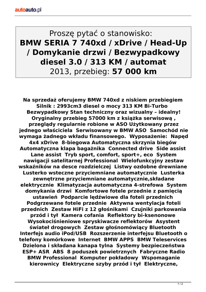 Proszę pytać o stanowisko: BMW SERIA 7 740xd / xDrive / Head-Up / Domykanie drzwi / Bezwypadkowy diesel 3.0 / 313 KM / automat 2013, przebieg: 57 000 km Na sprzedaż oferujemy BMW 740xd z niskiem przebiegiem Silnik : 2993cm3 diesel o mocy 313 KM Bi-Turbo Bezwypadkowy Stan techniczny oraz wizualny – idealny! Oryginalny przebieg 57000 km z książka serwisową , przeglądy regularnie robione w ASO Użytkowany przez jednego właściciela Serwisowany w BMW ASO Samochód nie wymaga żadnego wkładu finansowego. Wyposażenie: Napęd 4x4 xDrive 8-biegowa Automatyczna skrzynia biegów Automatyczna klapa bagażnika Connected drive Side assist Lane assist Tryb sport, comfort, sport+, eco System nawigacji satelitarnej Professional Wielofunkcyjny zestaw wskaźników na desce rozdzielczej Listwy ozdobne drewniane Lusterko wsteczne przyciemniane automatycznie Lusterka zewnętrzne przyciemniane automatycznie,składane elektrycznie Klimatyzacja automatyczna 4-strefowa System domykania drzwi Komfortowe fotele przednie z pamięcią ustawień Podparcie lędźwiowe dla foteli przednich Podgrzewane fotele przednie Aktywna wentylacja foteli przednich Zestaw HiFi z 12 głośnikami Czujniki parkowania przód i tył Kamera cofania Reflektory bi-ksenonowe Wysokociśnieniowe spryskiwacze reflektorów Asystent świateł drogowych Zestaw głośnomówiący Bluetooth Interfejs audio iPod/USB Rozszerzenie interfejsu Bluetooth o telefony komórkowe Internet BMW APPS BMW Teleservices Dzielona i składana kanapa tylna Systemy bezpieczeństwa ESP+ ASR ABS 8 poduszek powietrznych Fabryczne Radio BMW Professional Komputer pokładowy Wspomaganie kierownicy Elektryczne szyby przód i tył Elektryczne, 1/2 podgrzewane lusterka Kierownica skórzana sportowa typu M Kierownica wielofunkcyjna Oświetlenie ambientowe Reflektory przeciwmgielne Centralny zamek z pilota Czujnik deszczu z automatyczną kontrolą Immobilizer fabryczny BMW Alarm BMW Podłokietnik środkowy ZAPRASZAM NA JAZDĘ PRÓBNĄ Możliwość sprawdzenie samochodu w ASO, warsztacie samochodowym, przez rzeczoznawce, na stacji kontroli pojazdów. Wszystkie koszty z tym związane pokrywa zainteresowany. Cena podlega symbolicznej negocjacji po oględzinach i ewentualnym sprawdzeniu samochodu. Stan samochodu oceń sam . Zapraszamy. Możliwość zostawienia samochodu w rozliczeniu, pod warunkiem przyzwoitego stanu. 4x4; ABS; ASR; EDS; ESP; alufelgi; autoalarm; centralny zamek; czujnik deszczu; czujniki cofania; el. lusterka; el.szyby; immobiliser; kierownica wielofunkcyjna; klimatyzacja; komputer; ksenony; podgrzewane fotele; poduszka powietrzna; radio / CD; skórzana tapicerka; nawigacja; tempomat; wspomaganie kierownicy; światła przeciwmgłowe; radio magnetofon; elektryczne fotele; dvd; regulacja wysokości fotela; klimatronik bezwypadkowy; serwisowany w ASO Cena: 230 000 PLN brutto Opiekun: Mikołaj Svorak +48 514 766 687 Al. Krakowska 178, Punkt E 2/2