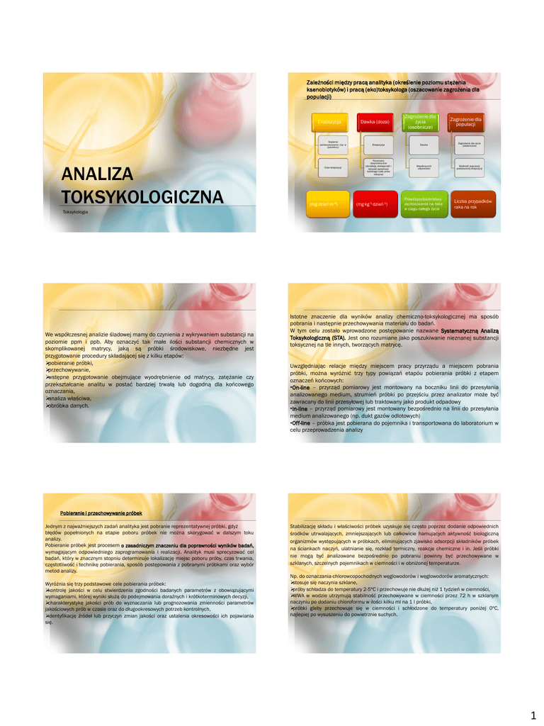 Zależności między pracą analityka (określenie poziomu stężenia ksenobiotyków) i pracą (eko)toksykologa (oszacowanie zagrożenia dla populacji) Ekspozycja ANALIZA TOKSYKOLOGICZNA Toksykologia We współczesnej analizie śladowej mamy do czynienia z wykrywaniem substancji na poziomie ppm i ppb. Aby oznaczyć tak małe ilości substancji chemicznych w skomplikowanej matrycy, jaką są próbki środowiskowe, niezbędne jest przygotowanie procedury składającej się z kilku etapów: pobieranie próbki, przechowywanie, wstępne przygotowanie obejmujące wyodrębnienie od matrycy, zatężanie czy przekształcanie analitu w postać bardziej trwałą lub dogodną dla końcowego oznaczania, analiza właściwa, obróbka danych. Dawka (doza) Zagrożenie dla życia (osobnicze) Zagrożenie dla populacji Stężenie zanieczyszczenia (np. w powietrzu) Ekspozycja Dawka Zagrożenie dla życia (osobniczne) Czas ekspozycji Parametry dozymetryczne (określają dostępność i łatwość penetracji ludzkiego ciała przez toksynę) Współczynnik odpowiedzi Wielkość populacji poddawanej ekspozycji (mg.dzień.m-3) (mg.kg-1.dzień-1) Prawdopodobieństwo zachorowania na raka w ciągu całego życia Liczba przypadków raka na rok Istotne znaczenie dla wyników analizy chemiczno-toksykologicznej ma sposób pobrania i następnie przechowywania materiału do badań. W tym celu zostało wprowadzone postępowanie nazwane Systematyczną Analizą Toksykologiczną (STA). Jest ono rozumiane jako poszukiwanie nieznanej substancji toksycznej na tle innych, tworzących matrycę. Uwzględniając relacje między miejscem pracy przyrządu a miejscem pobrania próbki, można wyróżnić trzy typy powiązań etapóu pobierania próbki z etapem oznaczeń końcowych: •On-line – przyrząd pomiarowy jest montowany na boczniku linii do przesyłania analizowanego medium, strumień próbki po przejściu przez analizator może być zawracany do linii przesyłowej lub traktowany jako produkt odpadowy •In-line – przyrząd pomiarowy jest montowany bezpośrednio na linii do przesyłania medium analizowanego (np. dukt gazów odlotowych) •Off-line – próbka jest pobierana do pojemnika i transportowana do laboratorium w celu przeprowadzenia analizy Pobieranie i przechowywanie próbek Jednym z najważniejszych zadań analityka jest pobranie reprezentatywnej próbki, gdyż błędów popełnionych na etapie poboru próbek nie można skorygować w dalszym toku analizy. Pobieranie próbek jest procesem o zasadniczym znaczeniu dla poprawności wyników badań, wymagającym odpowiedniego zaprogramowania i realizacji. Analityk musi sprecyzować cel badań, który w znacznym stopniu determinuje lokalizację miejsc poboru próby, czas trwania, częstotliwość i technikę pobierania, sposób postępowania z pobranymi próbkami oraz wybór metod analizy. Wyróżnia się trzy podstawowe cele pobierania próbek: kontrolę jakości w celu stwierdzenia zgodności badanych parametrów z obowiązującymi wymaganiami, której wyniki służą do podejmowania doraźnych i krótkoterminowych decyzji, charakterystykę jakości prób do wyznaczania lub prognozowania zmienności parametrów jakościowych prób w czasie oraz do długookresowych potrzeb kontrolnych, identyfikację źródeł lub przyczyn zmian jakości oraz ustalenia okresowości ich pojawiania się. Stabilizację składu i właściwości próbek uzyskuje się często poprzez dodanie odpowiednich środków utrwalających, zmniejszających lub całkowicie hamujących aktywność biologiczną organizmów występujących w próbkach, eliminujących zjawisko adsorpcji składników próbek na ściankach naczyń, ulatnianie się, rozkład termiczny, reakcje chemiczne i in. Jeśli próbki nie mogą być analizowane bezpośrednio po pobraniu powinny być przechowywane w szklanych, szczelnych pojemnikach w ciemności i w obniżonej temperaturze. Np. do oznaczania chlorowcopochodnych węglowodorów i węglowodorów aromatycznych: stosuje się naczynia szklane, próby schładza do temperatury 2-5ºC i przechowuje nie dłużej niż 1 tydzień w ciemności, WWA w wodzie utrzymują stabilność przechowywane w ciemności przez 72 h w szklanym naczyniu po dodaniu chloroformu w ilości kilku ml na 1 l próbki, próbki gleby przechowuje się w ciemności i schłodzone do temperatury poniżej 0ºC, najlepiej po wysuszeniu do powietrznie suchych. 1 WYODRĘBNIANIE TRUCIZN METALICZNYCH Z MATERIAŁU BIOLOGICZNEGO Istotnym elementem w oznaczaniu trucizn w materiale biologicznym jest ich wyodrębnienie. Metody wyodrębniania trucizn z materiału biologicznego (tkanki, narządy, płyny ustrojowe, treść żołądkowa) stanowią integralną część postępowania analitycznego i są zdeterminowane rodzajem trucizny. Metody wyosabniania dobiera się w ten sposób, aby poszukiwana trucizna nie ulegała w toku operacji destrukcji, a jednocześnie, aby można było ją wyodrębnić z dużą wydajnością, co jest szczególnie istotne w badaniach ilościowych. W zależności od charakteru substancji sposoby wyodrębniania trucizn można podzielić na: wyodrębnianie trucizn nieorganicznych z materiału biologicznego; wyodrębnianie trucizn organicznych z materiału biologicznego. Do trucizn metalicznych zalicza się te metale i metaloidy, które w postaci soli, par i połączeń metaloorganicznych wprowadzone do ustroju w małych ilościach, powodować mogą zarówno ostre, jak i przewlekłe zatrucia. W przypadkach śmiertelnych zatruć związkami metali, przedmiotem badań na zawartość składników toksycznych są zwykle wycinki przewodu pokarmowego - głównie żołądka i jelit, a z narządów miąższowych wycinki wątroby i nerki. Przydatnym materiałem są także wymiociny oraz mocz i krew. Mineralizacja Proces ten polega na zniszczeniu substancji organicznych w wyniku utleniania przy jednoczesnym przeprowadzeniu trucizn metalicznych w postać jonową. Mineralizacja na sucho Polega ona na spopieleniu bada