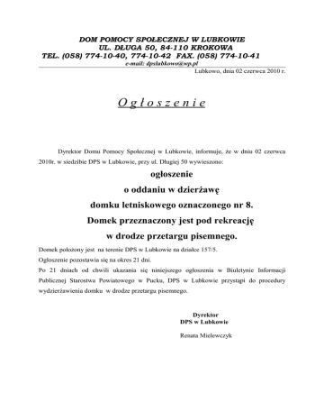 DOM POMOCY SPOŁECZNEJ W LUBKOWIE UL. DŁUGA 50, 84-110 KROKOWA TEL. (058) 774-10-40, 774-10-42 FAX. (058) 774-10-41 e-mail: [email protected] Lubkowo, dnia 02 czerwca 2010 r. Ogłoszenie Dyrektor Domu Pomocy Społecznej w Lubkowie, informuje, że w dniu 02 czerwca 2010r. w siedzibie DPS w Lubkowie, przy ul. Długiej 50 wywieszono: ogłoszenie o oddaniu w dzierżawę domku letniskowego oznaczonego nr 8. Domek przeznaczony jest pod rekreację w drodze przetargu pisemnego. Domek położony jest na terenie DPS w Lubkowie na działce 157/5. Ogłoszenie pozostawia się na okres 21 dni. Po 21 dniach od chwili ukazania się niniejszego ogłoszenia w Biuletynie Informacji Publicznej Starostwa Powiatowego w Pucku, DPS w Lubkowie przystąpi do procedury wydzierżawienia domku w drodze przetargu pisemnego. Dyrektor DPS w Lubkowie Renata Mielewczyk
