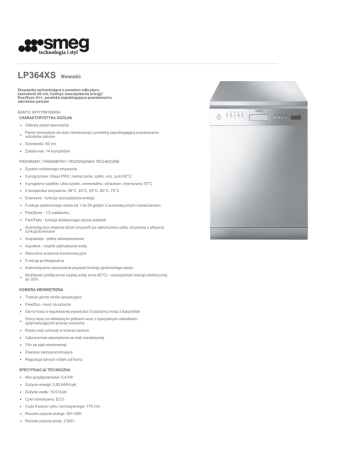 LP364XS Nowość Zmywarka wolnostojąca z panelem odkrytym, szerokość 60 cm, funkcja oszczędzania energii EnerSave A++, powłoka zapobiegająca powstawaniu odcisków palców EAN13: 8017709182434 CHARAKTERYSTYKA OGÓLNA Odkryty panel sterowania Panel sterowania ze stali nierdzewnej z powłoką zapobiegającą powstawaniu odcisków palców Szerokość: 60 cm Załadunek: 14 kompletów PROGRAMY / PARAMETRY / ROZWIĄZANIA TECHNICZNE System orbitalnego zmywania 5 programów: Glass PRO, namaczanie, szkło, eco, auto 60°C 4 programy szybkie: ultra szybki, uniwersalny, ultraclean, intensywny 70°C 5 temperatur zmywania: 38°C, 45°C, 55°C, 65°C, 70°C Enersave - funkcja oszczędzania energii Funkcja opóźnionego startu od 1 do 24 godzin z automatycznym namaczaniem FlexiZone - 1/2 załadunku FlexiTabs - funkcja efektywnego użycia tabletek Automatyczne otwarcie drzwi zmywarki po zakończeniu cyklu zmywania z aktywną funkcją Enersave Acquastop - pełne zabezpieczenie Aquatest - czujnik zabrudzenia wody Naturalne suszenie kondensacyjne Funkcja profesjonalna Automatyczne namaczanie poprzez funkcję opóźnionego startu Możliwość podłączenia ciepłej wody (max 60°C) - oszczędność energii elektrycznej do 35% KOMORA WEWNĘTRZNA Trzecie górne ramie spryskujące FlexiDuo - kosz na sztućce Górny kosz o regulowanej wysokości (3 poziomy) wraz z EasyGlide Dolny kosz ze składanymi półkami wraz z specjalnymi wkładkami, optymalizującymi proces suszenia Kosze oraz uchwyty w kolorze szarym Cała komora wewnętrzna ze stali nierdzewnej Filtr ze stali nierdzewnej Zawiasy samopoziomujące Regulacja tylnych nóżek od frontu SPECYFIKACJA TECHNICZNA Moc przyłączeniowa: 5,4 kW Zużycie energii: 0,92 kWh/cykl Zużycie wody: 10,5 l/cykl Cykl normatywny: ECO Czas trwania cyklu normatywnego: 175 min. Roczne zużycie energii: 261 kWh Roczne zużycie wody: 2 940 l Poziom hałasu: 45 dB(A) Zabezpieczenie: 32 A Napięcie: 220-240 V Częstotliwość: 50 Hz Functions Smeg Polska Sp. z o.o. ul. Cybernetyki 9 02-677 Warszawa Tel. +48 22 276 14 00 LP364XS wolnostojące z panelem odkrytym 60 cm A++: Zmywarki, chłodziarki, pralki w klasie A ++ zużywają do 20% mniej energii w stosunku do urządzeń należących do klasy A. Urządzenia tej klasy gwarantują zmniejszone zużycie energii, maksymalną efektywność energetyczną i poszanowanie dla środowiska naturalnego. MAKSYMALNY ZAŁADUNEK: Załadunek od 7 do 14 kompletów w zależności od modelu. KOSZ FLEXIDUO: Smeg opracował całkowicie nowy trzeci górny kosz na sztućce FlexiDuo, który składa się z dwóch części, które mogą być zdejmowane, wymieniane lub umieszczone jeden na drugim, co zapewnia maksymalny komfort podczas załadunku zmywarki. OPTCJA ENERSAVE: Specjalny system, który zwiększa efektywność energetyczna zmywarki, poprzez automatyczne otwarcie drzwi zmywarki. Część procesu suszenia odbywa się przy otwartych drzwiach. OPÓŹNIONY START: Opóźniony start do 24h. Naczynia, które oczekują na włączenie się zmywarki są automatycznie namaczane. FLEXIZONE ½ ZAŁADUNKU: Ta opcja umożliwia zmywanie połowy załadunku. Niewielką ilość sprzętów i naczyń kuchennych, umieszczamy w dowolnym koszu, co pozwala zaoszczędzić energię, wodę i skraca czas zmywania. OPCJA TABLETEK: Opcja, która maksymalnie ułatwia korzystanie z urządzenia. OPTCJA QUICK TIME: Możliwość skrócenia cyklu zmywania (oprócz płukania). AQUATEST: Czujnik zabrudzenia wody, który sprawdza jej jakość przed każdym zmywaniem. Dzięki temu zmywanie zawsze następuje do czysta i minimalnym zużyciu wody i energii. PEŁEN ACQUASTOP: Pełne zabezpieczenie przed zalaniem, z dodatkowy zaworem, który odcina dopływ wody nawet przy najmniejszym przecieku. EASYGLIDE SYSTEM: System pozwalający na wygodny rozładunek naczyń. ROMPI-GOCCIA: Niektóre modele zmywarek są wyposażone w specjalne polimerowe dysze RompiGoccia, które poprawiają proces suszenia poprzez kierowanie kropli wody wewnątrz urządzenia. PŁUKANIE: Płukanie w zimnej wodzie. PROGRAM DELIKATNY: Program do delikatnych i lekko zabrudzonych naczyń. PROGRAM ECO: Program redukujący zużycie wody i energii, do mniej zabrudzonych naczyń. PROGRAM AUTO 60 °C: Do zmywania bardzo brudnych naczyń o różnej strukturze, w temperaturze 60 °C PROGRAM SZYBKI 27 MIN: Szybki program mycia bez suszenia. Eco Rapid: Program Eco Rapid Program ten przeznaczony jest do zmywania małej ilości naczyń normalnie zabrudzonych , ale w krótkim czasie i zawsze z gwarancją najlepszych wyników w zakresie efektywności energetycznej . PROGRAM DELIKATNY SZYBKI: Szybkie zmywanie delikatnych naczyń. PROGRAM NORMALNY SZYBKI: Do częstego zmywania naczyń o różnej strukturze, w krótkim czasie. IZOLACJA: Zastosowanie specjalnej izolacji oraz podzespołów przeznaczonych do tłumienia głośności pracy silnika, w sposób istotny zmniejsza poziom hałasu powstałego podczas pracy urządzenia. IntensivoProf: Program intensywny, przeznaczony jest do zmywania garnków i patelnie mocno zabrudzonych z zaschniętymi pozostałościami jedzenia , które wymagają mocnego czyszczenia. UniversaleProf: Program uniwersalny , przeznaczony jest do zmywania normalnie zabrudzonych zastaw stołowych. Smeg Polska Sp. z o.o. ul. Cybernetyki 9 02-677 Warszawa Tel. +48 22 276 14 00 LP364XS wolnostojące z panelem odkrytym 60 cm Smeg Polska Sp. z o.o. ul. Cybernetyki 9 02-677 Warszawa Tel. +48 22 276 14 00