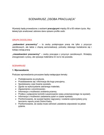 SCENARIUSZ „OSOBA PRACUJĄCA” Wywiady będą prowadzone z osobami pracującymi między 50 a 65 rokiem życia. Aby łatwiej było analizować zebrane dane opisano profile osób: GRUPA DOCELOWA „zadowoleni pracownicy” – to osoby podejmujące pracę nie tylko z przyczyn zarobkowych, ale także z chęcią samorealizacji, potrzeby dalszego kształcenia się i lubiący swoją pracę „niezadowoleni pracownicy” – osoby pracujące z przyczyn zarobkowych. Wolałyby zrezygnować z pracy, ale sytuacja materialna im na to nie pozwala. SCENARIUSZ 1. Wprowadzenie Podczas wprowadzenia poruszane będą następujące tematy: Podziękowanie za przybycie. Przedstawienie się i informacja dla kogo pracujemy. Spodziewany czas trwania wywiadu. Zgoda na wykorzystanie zebranego materiału. Zapewnienie o anonimowości. Informacja o możliwości zrobienia przerwy. Prośba o wyłączenie komórki (uszanowanie czasu przeznaczonego na wywiad). Informacja o możliwości zadawania pytań w czasie wywiadu. Poinformowanie, że wywiad będzie nagrywany i zostanie wykorzystany przy tworzeniu raportu przez Dobre Kadry. Poinformowanie, że osoba może odmówić udzielenia odpowiedzi na jakieś pytanie. Przykładowe wprowadzenie: Witam Panią/Pana bardzo serdecznie. Chciałabym jeszcze raz bardzo podziękować za wyrażenie zgody na udział w dzisiejszym badaniu. Mam na imię…. Jestem pracownicą Dobrych Kadr i współrealizuję badanie na temat rynku pracy. Przewidywany czas naszego dzisiejszego spotkania to ok. 30 minut. Ponieważ istotna jest dla mnie każda Pani/Pana wypowiedź na temat poruszanych dzisiaj kwestii, dlatego uzyskany z wywiadu materiał zostanie poddany analizie, jednak wypowiedzi w badaniu nie będą przypisywane personalnie do żadnej konkretnej osoby. Czy podtrzymuje Pan/Pani swoją zgodę na takie wykorzystanie tekstu naszej rozmowy? Po wyrażeniu zgody kontynuacja wprowadzenia Brak zgody, podziękowanie i zakończenie wywiadu. W celu usprawnienia wywiadu mam przygotowane pytania, ale interesuje mnie wszystko, co Pani/Pan ma do powiedzenia na poruszane tematy. Nie mam żadnych oczekiwań co do Pani/Pana wypowiedzi, ponieważ na pytania, które przygotowałam, nie ma dobrych ani złych odpowiedzi. Oczywiście, w trakcie wywiadu, jeśli zaistnieje taka potrzeba, możliwe jest zrobienie krótkiej przerwy. Nie chciałabym jednak, by Pan/Pani nadużywał/ -a tej możliwości. Proszę Panią/Pana o wyłączenie telefonu komórkowego, dzięki temu nasza rozmowa będzie przebiegać sprawniej i będziemy mogli/ -ły skupić się wyłącznie na interesujących nas kwestiach. Oczywiście, jeśli podczas wywiadu pojawi się coś, co będzie dla Pana/Pani niezrozumiałe to proszę pytać. Czy jest Pan/Pani gotowy/ -a? Czy możemy rozpocząć wywiad? Czy na wstępie chciałaby Pani/Pan o coś zapytać? Czy coś jest niejasne? 2. Rozgrzewka (zadawane jest pytanie neutralne, dlatego rozgrzewka stanowi w tym przypadku także wprowadzenie do tematu) Nawiązanie rozmowy na neutralny temat, w celu zbudowania pozytywnej relacji, zależnej od sytuacji np. o pogodzie, o otoczeniu. Praca Co jest ważne dla Pana/ -i w pracy? Dlaczego to? Czy możemy przez chwilę porozmawiać o Pana/ -i pracy? Odpowiedź: tak, możemy Czy coś Pan/ -i chciałby/ -łaby w niej zmienić? Odpowiedź: nie, nie możemy Gdyby mógł/mogła Pan/ -i coś zmienić na rynku pracy, co by to było? [to pytanie będzie pytaniem otwartym, jednak niektóre osoby będą potrzebowały podpowiedzi i dopytania, stąd wskazane obszary] Jak miałaby wyglądać ta zmiana? - atmosfera w pracy - wynagrodzenie - rodzaj pracy - godziny pracy - miejsce pracy - zakres obowiązków - wymagania (dot. technologii, obsługi komputera, języki obce) Jak wygląda Pana/ -i praca? - atmosfera w pracy - rodzaj pracy - godziny pracy - miejsce pracy - wymagania (dot. technologii, obsługi komputera, języki obce) Proszę spróbować ocenić możliwości Proszę spróbować ocenić możliwości osób po 50. roku życia na rynku pracy? [to pytanie będzie pytaniem otwartym, jednak niektóre osoby będą potrzebowały podpowiedzi i dopytania, stąd wskazane obszary] - w swoim zawodzie - w innych zawodach/ branżach - możliwość nabycia nowych kwalifikacji/ przekwalifikowania się/ umiejętności - rozpoczęcie własnej działalności gospodarczej osób po 50. roku życia na rynku pracy? [to pytanie będzie pytaniem otwartym, jednak niektóre osoby będą potrzebowały podpowiedzi i dopytania, stąd wskazane obszary] - w swoim zawodzie - w innych zawodach/ branżach - możliwość nabycia nowych kwalifikacji/ przekwalifikowania się/ umiejętności - rozpoczęcie własnej działalności gospodarczej Gdyby mógł/mogła Pan/ -i coś zmienić na rynku pracy, co by to było? Jak miałaby wyglądać ta zmiana? Obecna sytuacja Osoba chcąca rozmawiać o pracy: Jakie Pan/ -i ma obowiązki na codzień? Osoba która nie wyraziła zgody na rozmowę o pracy: Czy czuje się Pan/ -i pewnie w dzisiejszym świecie? Czym Pan/ -i się teraz zajmuje? Proszę o opisanie przeciętnego dnia (czy spróbował/ -aby Pan/ -i opisać swój przeciętny dzień?) [dla osób, które nie potrafią odpowiedzieć na pyt 1, technika projekcyjna] [to pytanie będzie pytaniem otwartym, jednak niektóre osoby będą potrzebowały podpowiedzi i dopytania, stąd wskazane obszary] Zatrudnienie/praca czy był/ -a dyskryminowany/ -a gorzej traktowany/ -a nierówno w porównaniu do jakich grup Opieka zdrowotna – dostępność do zabiegów, ocena personelu, ocena pomocy czy był/ -a dyskryminowany/ -a gorzej traktowany/ -a nierówno w porównaniu do jakich grup Usługi finansowe – kredyty, ubezpieczenia czy był/ -a dyskryminowany/ -a gorzej traktowany/ -a nierówno w porównaniu do jakich grup Ubezpieczenia społeczne – renty, emerytury Czy są odpowiednie? Czy są na czas wypłacane? Czy wystarczają na najpotrzebniejsze rzeczy? Dostęp do dóbr i usług – czy ma problemy z obsługą bankomatów, in