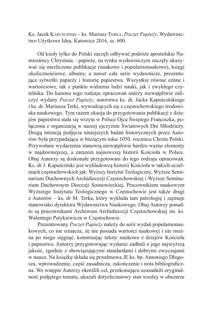 Ks. Jacek Kapuściński – ks. Mariusz Terka, Poczet Papieży, Wydawnictwo Użytkowe Idea, Katowice 2016, ss. 600. Od kiedy tylko do Polski zaczęli odbywać podróże apostolskie Namiestnicy Chrystusa – papieże, na rynku wydawniczym zaczęły ukazywać się niezliczone publikacje (naukowe i popularnonaukowe), księgi okolicznościowe, albumy, a nawet całe serie wydawnicze, prezentujące sylwetki papieży i historię papiestwa. Wszystkie równie cenne i wartościowe, tak z punktu widzenia ludzi nauki, jak i zwykłego czytelnika. Do kanonu tego rodzaju opracowań należy niewątpliwie zaliczyć wydany Poczet Papieży, autorstwa ks. dr. Jacka Kapuścińskiego i ks. dr. Mariusza Terki, wywodzących się z częstochowskiego środowiska naukowego. Tym razem okazją do przygotowania publikacji z dziejów papiestwa stała się wizyta w Polsce Ojca Świętego Franciszka, połączona z organizacją w naszej ojczyźnie Światowych Dni Młodzieży. Drugą intencją podjęcia niniejszych badań historycznych przez Autorów była przypadająca w bieżącym roku 1050. rocznica Chrztu Polski. Przywołane wydarzenia stanowią niewątpliwie bardzo ważne elementy w najdawniejszej, a zarazem najnowszej historii Kościoła w Polsce. Obaj Autorzy są doskonale przygotowani do tego rodzaju opracowań. Ks. dr J. Kapuściński jest wykładowcą historii Kościoła w takich uczelniach częstochowskich jak: Wyższy Instytut Teologiczny, Wyższe Seminarium Duchownych Archidiecezji Częstochowskiej i Wyższe Seminarium Duchownym Diecezji Sosnowieckiej. Pracownikiem naukowym Wyższego Instytutu Teologicznego w Częstochowie jest także drugi z Autorów – ks. dr M. Terka, który wykłada tam patrologię i zajmuje stanowisko dyrektora Wydawnictwa Naukowego. Obaj Autorzy ponadto są pracownikami Archiwum Archidiecezji Częstochowskiej im. ks. Walentego Patykiewicza w Częstochowie. Prezentowany Poczet Papieży należy do serii wydań popularnonaukowych, co nie oznacza, że nie posiada wartości naukowej i nie można po niego sięgnąć, konstruując teksty naukowe z dziejów Kościoła i papiestwa. Autorzy przygotowując wydanie zadbali o jego najwyższą jakość, zgodnie z obowiązującymi standardami i dobrymi zwyczajami w nauce. Na książkę składa się przedmowa JE ks. bp. Antoniego Długosza, wprowadzenie, część zasadnicza, zakończenie i nota bibliograficzna. We wstępie Autorzy określili cel, przekonująco uzasadnili oryginalność podjętego tematu, ukazali dotychczasowy stan wiedzy w obszarze 450 Veritati et Caritati podjętego zagadnienia oraz określili strukturę książki. Uderzające czytelnika są parametry objętościowe książki, bowiem liczy ona aż 600 stron. Nadmienić należy, że taki format książki, a także twarda oprawa, wzbogacona o obwolutę i wysokiej jakości materiał fotograficzny, oddają do rąk czytelników tylko najlepsze wydawnictwa na rynku. Korpus zasadniczy tego opracowania (s. 11-591) stanowi leksykon 264 papieży Kościoła katolickiego, ułożony w kolejności chronologicznej. Zagadnienie historii papiestwa wprawdzie nie jest novum, gdyż, jak zaznaczyli we wstępie Autorzy: „Dzięki wnikliwym badaniom, jakie przeprowadzili historycy w dwóch ostatnich wiekach, udało się ustalić całkowitą liczbę papieży aż po rok 2016”, to jednak oryginalny w prezentowanej książce jest sposób ujęcia poszczególnych biogramów papieży (od św. Piotra do Franciszka) w 10 epok (rozdziałów), w których przyszło żyć Namiestnikom Chrystusa. W ten sposób czytelnik książki szybko zorientuje się, w jakich okolicznościach politycznych, kulturowych i społecznych przyszło sprawować misję poszczególnym papieżom. Noty biograficzne biskupów Rzymu, zaprezentowane w układzie chronologicznym, uzupełnione zostały o najsłynniejsze ich portrety oraz ilustracje związane z historią papiestwa, ujęte w godną wagi piotrowego urzędu ornamentykę. Wysoka jakość i piękna szata graficzna książki nie może jednak przysłonić jej treści, na którą wpływ miało przygotowanie akademickie i doświadczenie naukowe Autorów. Spod pióra ks. dr. Jacka Kapuścińskiego i ks. dr. Mariusza Terki wyszło dotąd bowiem wiele tekstów i publikacji, których tylko najlepsza znajomość może zaświadczyć o erudycji i walorach treściowych prezentowanego dzieła. Czytając Poczet Papieży i poznając historię papiestwa można pokusić się o ocenę poszczególnych pontyfikatów papieży. Taką notę, subiektywną, może wydać każdy czytelnik. Dla recenzującego, z racji zajmowanej profesji historyka i naukowca, najbardziej poruszającą jest misja Biskupów Rzymu, jaką spełniali w okresie największych przemian w Kościele. Do tych należały pontyfikaty papieży pierwszych wieków, określonych przez Autorów mianem Kościoła męczenników, a także papieży z okresu Soboru Trydenckiego (1545 – 1563) oraz odnowy soborowej po Vaticanum II (1962 – 1965). W tej ostatniej grupie znaleźli się papieże współcześni recenzentowi, m.in. św. Jan Paweł II, o którym Autorzy napisali: „Cechą charakterystyczną pontyfikatu Jana Pawła II były liczne pielgrzymki. Odbył on łącznie 104 pielgrzymki, odwiedzając 129 krajów i wygłaszając ok. 2400 przemówień i homilii Recenzje i Sprawozdania 451 […]. Spełniał w ten sposób posługę św. Piotra polegającą na umacnianiu braci w wierze, ale także wychodził na spotkanie wszystkich ludzi. Pielgrzymki te miały znaczenie nie tylko dla pojedynczego osób czy grup, lecz również dla całych rodów […]. Istotnym rysem duszpasterstwa Jana Pawła II była troska o młodzież, która towarzyszyła mu od początku jego pracy kapłańskiej. Zaowocowała ona zorganizowaniem Światowych Dni Młodzieży, które odbyły się w różnych miejscach świata. Jedno z tych spotkań miało miejsce w Częstochowie w 1991 roku – był to pierwszy ŚDM po upadku komunizmu, na które przyjechała młodzież z byłego już Z