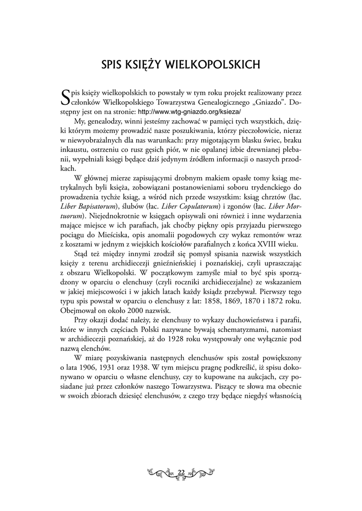 SPIS KSIĘŻY WIELKOPOLSKICH S pis księży wielkopolskich to powstały w tym roku projekt realizowany przez członków Wielkopolskiego Towarzystwa Genealogicznego „Gniazdo”. Dostępny jest on na stronie: http://www.wtg-gniazdo.org/ksieza/ My, genealodzy, winni jesteśmy zachować w pamięci tych wszystkich, dzięki którym możemy prowadzić nasze poszukiwania, którzy pieczołowicie, nieraz w niewyobrażalnych dla nas warunkach: przy migotającym blasku świec, braku inkaustu, ostrzeniu co rusz gęsich piór, w nie opalanej izbie drewnianej plebanii, wypełniali księgi będące dziś jedynym źródłem informacji o naszych przodkach. W głównej mierze zapisującymi drobnym makiem opasłe tomy ksiąg metrykalnych byli księża, zobowiązani postanowieniami soboru trydenckiego do prowadzenia tychże ksiąg, a wśród nich przede wszystkim: ksiąg chrztów (łac. Liber Bapisatorum), ślubów (łac. Liber Copulatorum) i zgonów (łac. Liber Mortuorum). Niejednokrotnie w księgach opisywali oni również i inne wydarzenia mające miejsce w ich parafiach, jak choćby piękny opis przyjazdu pierwszego pociągu do Mieściska, opis anomalii pogodowych czy wykaz remontów wraz z kosztami w jednym z wiejskich kościołów parafialnych z końca XVIII wieku. Stąd też między innymi zrodził się pomysł spisania nazwisk wszystkich księży z terenu archidiecezji gnieźnieńskiej i poznańskiej, czyli upraszczając z obszaru Wielkopolski. W początkowym zamyśle miał to być spis sporządzony w oparciu o elenchusy (czyli roczniki archidiecezjalne) ze wskazaniem w jakiej miejscowości i w jakich latach każdy ksiądz przebywał. Pierwszy tego typu spis powstał w oparciu o elenchusy z lat: 1858, 1869, 1870 i 1872 roku. Obejmował on około 2000 nazwisk. Przy okazji dodać należy, że elenchusy to wykazy duchowieństwa i parafii, które w innych częściach Polski nazywane bywają schematyzmami, natomiast w archidiecezji poznańskiej, aż do 1928 roku występowały one wyłącznie pod nazwą elenchów. W miarę pozyskiwania następnych elenchusów spis został powiększony o lata 1906, 1931 oraz 1938. W tym miejscu pragnę podkreślić, iż spisu dokonywano w oparciu o własne elenchusy, czy to kupowane na aukcjach, czy posiadane już przez członków naszego Towarzystwa. Piszący te słowa ma obecnie w swoich zbiorach dziesięć elenchusów, z czego trzy będące niegdyś własnością 22 ks. Edwarda Likowskiego, późniejszego biskupa i arcybiskupa poznańskiego. Ponadto, swoje elenchusy udostępnili: Jacek Piętka, Bartosz Małecki i Sławomir Łubiński. Dzięki tym materiałom powstała baza wyjściowa do dalszej pracy oraz ustalony został zakres czasowy opracowania. Obejmuje on okres od XVIII wieku do pierwszej połowy XX wieku. W miarę sporządzania list z nazwiskami księży zrodził się pomysł wzbogacenia postaci księży o zdjęcia osobiste, zdjęcia grobów, nekrologi, czy opisy ich działalności. Wszystko po to, aby o życiu księży nie mówiły tylko ich imiona i nazwiska, daty urodzeń, święceń i zgonów. Ponad wszystko nie miały to być tylko suche fakty ale sylwetki duchownych, którym tak wiele zawdzięczamy. W tak szerokie opracowywanie spisu włączyło się wielu członków Towarzystwa, a później i goście z forum WTG „Gniazdo”. W swym obecnym kształcie spis jest dziełem bardzo wielu osób, które fotografują groby na cmentarzach, tablice pamiątkowe w kościołach, a także wyszukują i przesyłają różne informacje, takie jak zdjęcia nekrologów, czy opisy działalności księży zamieszczone w różnych opracowaniach regionalnych i parafialnych. Są i tacy, którzy mając wśród swoich przodków księży przysyłają posiadane o nich informacje. Na koniec września udostępniona baza zawiera ponad 3300 nazwisk księży. Natomiast posiadany już materiał pozwoli na powiększenie udostępnionej bazy o dalsze 1000 nazwisk, jak również na znaczne rozszerzenie zakresu wpisanych już wcześniej informacji. Według szacunkowych obliczeń całość będzie wynosiła ponad 7000 nazwisk, a zatem jak wynika z powyższego, w bazie znajduje się prawie połowa ujętych osób. W chwili obecnej istnieje możliwość wyszukiwania poprzez nazwiska księży. Do końca 2008 roku zostanie uruchomiona możliwość wyszukiwania poprzez nazwę parafii. Pozwoli to zorientować się jacy księża i w jakim okresie w danej parafii przebywali. Wprowadzone zostaną również zdjęcia kościołów przynależących do danej parafii. W bazie roboczej zgromadzonych jest już ponad 100 zdjęć kościołów i kaplic. Zapraszam do pomocy w tym dziele. Każde nadesłane zdjęcie grobu, tablicy pamiątkowej, kościoła, czy choćby krótka informacja o danym księdzu będzie cennym uzupełnieniem całości. Na koniec dziękuję bardzo wszystkim, którzy choćby małą cegiełką wzbogacili to opracowanie. Wojciech Jędraszewski 23