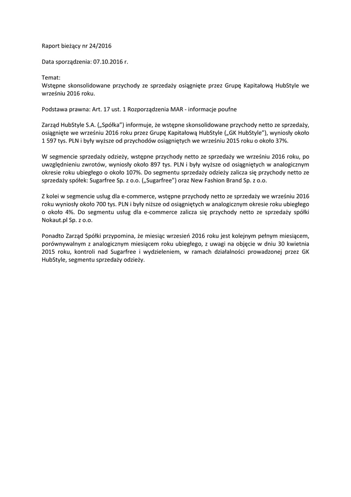 Raport bieżący nr 24/2016 Data sporządzenia: 07.10.2016 r. Temat: Wstępne skonsolidowane przychody ze sprzedaży osiągnięte przez Grupę Kapitałową HubStyle we wrześniu 2016 roku. Podstawa prawna: Art. 17 ust. 1 Rozporządzenia MAR - informacje poufne Zarząd HubStyle S.A. („Spółka”) informuje, że wstępne skonsolidowane przychody netto ze sprzedaży, osiągnięte we wrześniu 2016 roku przez Grupę Kapitałową HubStyle („GK HubStyle”), wyniosły około 1 597 tys. PLN i były wyższe od przychodów osiągniętych we wrześniu 2015 roku o około 37%. W segmencie sprzedaży odzieży, wstępne przychody netto ze sprzedaży we wrześniu 2016 roku, po uwzględnieniu zwrotów, wyniosły około 897 tys. PLN i były wyższe od osiągniętych w analogicznym okresie roku ubiegłego o około 107%. Do segmentu sprzedaży odzieży zalicza się przychody netto ze sprzedaży spółek: Sugarfree Sp. z o.o. („Sugarfree”) oraz New Fashion Brand Sp. z o.o. Z kolei w segmencie usług dla e-commerce, wstępne przychody netto ze sprzedaży we wrześniu 2016 roku wyniosły około 700 tys. PLN i były niższe od osiągniętych w analogicznym okresie roku ubiegłego o około 4%. Do segmentu usług dla e-commerce zalicza się przychody netto ze sprzedaży spółki Nokaut.pl Sp. z o.o. Ponadto Zarząd Spółki przypomina, że miesiąc wrzesień 2016 roku jest kolejnym pełnym miesiącem, porównywalnym z analogicznym miesiącem roku ubiegłego, z uwagi na objęcie w dniu 30 kwietnia 2015 roku, kontroli nad Sugarfree i wydzieleniem, w ramach działalności prowadzonej przez GK HubStyle, segmentu sprzedaży odzieży.