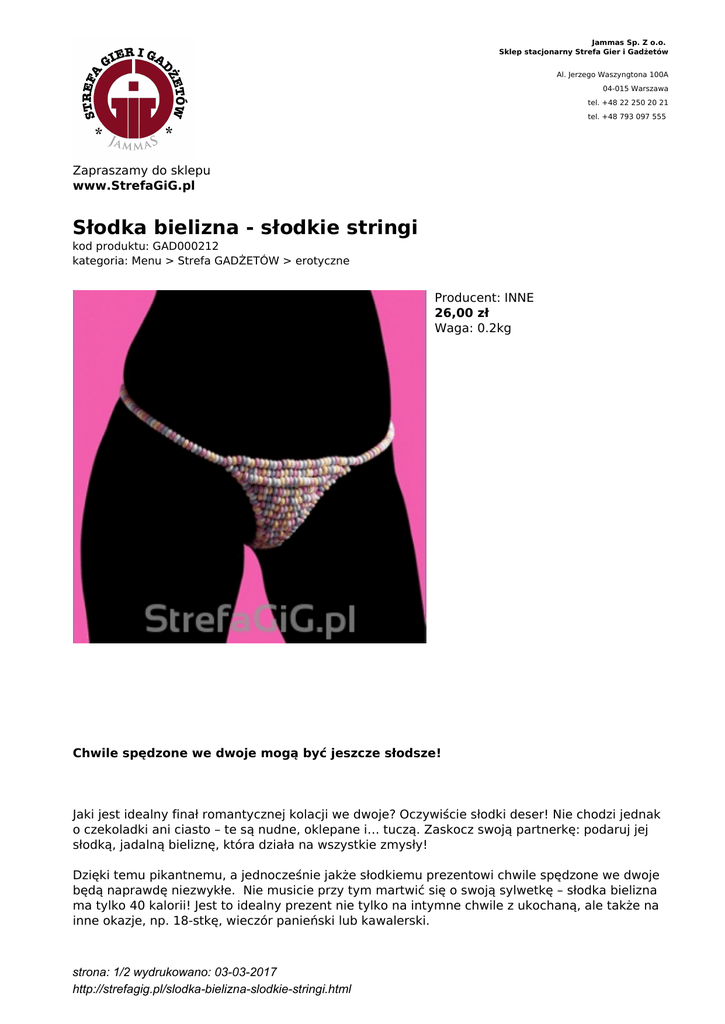 Jammas Sp. Z o.o. Sklep stacjonarny Strefa Gier i Gadżetów Al. Jerzego Waszyngtona 100A 04-015 Warszawa tel. +48 22 250 20 21 tel. +48 793 097 555 Zapraszamy do sklepu www.StrefaGiG.pl Słodka bielizna - słodkie stringi kod produktu: GAD000212 kategoria: Menu > Strefa GADŻETÓW > erotyczne Producent: INNE 26,00 zł Waga: 0.2kg Chwile spędzone we dwoje mogą być jeszcze słodsze! Jaki jest idealny finał romantycznej kolacji we dwoje? Oczywiście słodki deser! Nie chodzi jednak o czekoladki ani ciasto – te są nudne, oklepane i… tuczą. Zaskocz swoją partnerkę: podaruj jej słodką, jadalną bieliznę, która działa na wszystkie zmysły! Dzięki temu pikantnemu, a jednocześnie jakże słodkiemu prezentowi chwile spędzone we dwoje będą naprawdę niezwykłe. Nie musicie przy tym martwić się o swoją sylwetkę – słodka bielizna ma tylko 40 kalorii! Jest to idealny prezent nie tylko na intymne chwile z ukochaną, ale także na inne okazje, np. 18-stkę, wieczór panieński lub kawalerski. strona: 1/2 wydrukowano: 03-03-2017 http://strefagig.pl/slodka-bielizna-slodkie-stringi.html Gadżet w pigułce: - bielizna wykonana z ok. 330 słodkich owocowych cukierków - uatrakcyjni zakochanym każdy wieczór - uniwersalny rozmiar - idealny prezent dla ukochanej, a także na 18-stkę, wieczór panieński i kawalerski - bielizna nie tuczy: zawiera jedynie 40 kalorii, nie zawiera tłuszczu, zawiera tylko 9 g cukru - kolor może być nieco inny niż na zdjęciu - produkt nie podlega zwrotowi - skład: dekstroza, cukier, maltodekstryna, stearynian magnezu, kwas cytrynowy, barwniki: błękit brylantowy (E133), tetrazyna (E102), czerwień allura (E129), substancje smakowe. strona: 2/2 wydrukowano: 03-03-2017 http://strefagig.pl/slodka-bielizna-slodkie-stringi.html