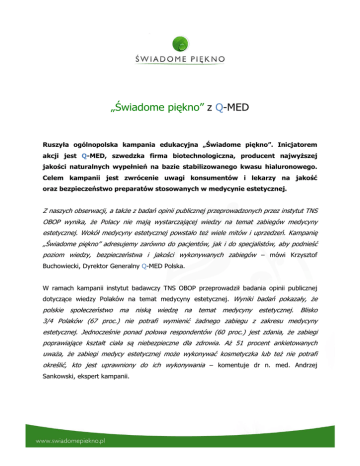 „Świadome piękno” z Q-MED Ruszyła ogólnopolska kampania edukacyjna „Świadome piękno”. Inicjatorem akcji jest Q-MED, szwedzka firma biotechnologiczna, producent najwyŜszej jakości naturalnych wypełnień na bazie stabilizowanego kwasu hialuronowego. Celem kampanii jest zwrócenie uwagi konsumentów i lekarzy na jakość oraz bezpieczeństwo preparatów stosowanych w medycynie estetycznej. Z naszych obserwacji, a takŜe z badań opinii publicznej przeprowadzonych przez instytut TNS OBOP wynika, Ŝe Polacy nie mają wystarczającej wiedzy na temat zabiegów medycyny estetycznej. Wokół medycyny estetycznej powstało teŜ wiele mitów i uprzedzeń. Kampanię „Świadome piękno” adresujemy zarówno do pacjentów, jak i do specjalistów, aby podnieść poziom wiedzy, bezpieczeństwa i jakości wykonywanych zabiegów – mówi Krzysztof Buchowiecki, Dyrektor Generalny Q-MED Polska. W ramach kampanii instytut badawczy TNS OBOP przeprowadził badania opinii publicznej dotyczące wiedzy Polaków na temat medycyny estetycznej. Wyniki badań pokazały, Ŝe polskie społeczeństwo ma niską wiedzę na temat medycyny estetycznej. Blisko 3/4 Polaków (67 proc.) nie potrafi wymienić Ŝadnego zabiegu z zakresu medycyny estetycznej. Jednocześnie ponad połowa respondentów (60 proc.) jest zdania, Ŝe zabiegi poprawiające kształt ciała są niebezpieczne dla zdrowia. AŜ 51 procent ankietowanych uwaŜa, Ŝe zabiegi medycy estetycznej moŜe wykonywać kosmetyczka lub teŜ nie potrafi określić, kto jest uprawniony do ich wykonywania – komentuje dr n. med. Andrzej Sankowski, ekspert kampanii. Na potrzeby kampanii powstała strona internetowa: www.swiadomepiekno.pl, na której zamieszczono praktyczne informacje dotyczące medycyny estetycznej, artykuły o najnowszych trendach i standardach bezpieczeństwa zabiegów oraz listę bezpiecznych gabinetów. Dedykowana aplikacja umieszczona na stronie kampanii umoŜliwia internautom zadawanie pytań ekspertom – znanym specjalistom z zakresu medycyny estetycznej. Patronat nad kampanią objęli: • Prof. dr hab. n. med. Waldemar Placek, Krajowy Konsultant Dermatologii i Wenerologii, • Prof. zw. dr hab. n. med. Julia Kruk-Jeromin, prezes Polskiego Towarzystwa Chirurgii Plastycznej, Rekonstrukcyjnej i Estetycznej • Prof. dr hab. n. med. Andrzej Kaszuba z Kliniki Dermatologii i Dermatologii Dziecięcej UM w Łodzi • Prof. dr hab. n. med. GraŜyna Broniarczyk-Dyła, Klinika Dermatologii Ogólnej, Estetycznej i Dermatochirurgii UM w Łodzi • Dr Barbara Walkiewicz-Cyrańska, Prezes Stowarzyszenia Lekarzy Dermatologów Estetycznych Wsparcia merytorycznego dla kampanii udzielili: dr Iwona Marycz – Langner, dr n. med. Andrzej Sankowski, dr n. med. Lubomir Lembas. Kampanię wspiera dr Andrzej Ignaciuk, dyrektor Podyplomowej Szkoły Medycyny Estetycznej, przewodniczący Sekcji Medycyny Estetycznej Polskiego Towarzystwa Lekarskiego. Q-MED jest światowym liderem w produkcji najwyŜszej jakości naturalnych wypełnień na bazie kwasu hialuronowego stosowanych w poprawie skóry twarzy (rodzina Restylane®), w konturowaniu ciała (rodzina Macrolane™) oraz w przywracaniu młodości skórze (rodzina HYDROBALANS). Preparaty firmy Q-MED oparte są na opatentowanej technologii NASHA™. Unikalną cechą tej technologii jest proces stabilizacji, dający w konsekwencji jedyny na świecie produkt stabilizowany, róŜniący się od naturalnego kwasu hialuronowego poniŜej 1 procenta. Minimalna modyfikacja cząsteczki kwasu hialuronowego zapewnia długotrwały efekt estetyczny oraz najwyŜszy profil bezpieczeństwa, potwierdzony w ponad 65 światowych badaniach klinicznych. Kontakt dla prasy: Sigma International Anna Wanielista-Stołecka Tel. +48 608 538 197, +48 (22) 628 05 93 - 133, [email protected] Aleksandra Siedlikowska Tel. +48 606 824 154, +48 (22) 628 05 93 – 106, [email protected]