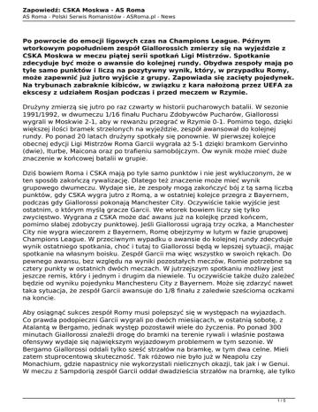 Zapowiedź: CSKA Moskwa - AS Roma AS Roma - Polski Serwis Romanistów - ASRoma.pl - News Po powrocie do emocji ligowych czas na Champions League. Późnym wtorkowym popołudniem zespół Giallorossich zmierzy się na wyjeździe z CSKA Moskwa w meczu piątej serii spotkań Ligi Mistrzów. Spotkanie zdecyduje być może o awansie do kolejnej rundy. Obydwa zespoły mają po tyle samo punktów i liczą na pozytywny wynik, który, w przypadku Romy, może zapewnić już jutro wyjście z grupy. Zapowiada się zacięty pojedynek. Na trybunach zabraknie kibiców, w związku z kara nałożoną przez UEFA za ekscesy z udziałem Rosjan podczas i przed meczem w Rzymie. Drużyny zmierzą się jutro po raz czwarty w historii pucharowych batalii. W sezonie 1991/1992, w dwumeczu 1/16 finału Pucharu Zdobywców Pucharów, Giallorossi wygrali w Moskwie 2-1, aby w rewanżu przegrać w Rzymie 0-1. Pomimo tego, dzięki większej ilości bramek strzelonych na wyjeździe, zespół awansował do kolejnej rundy. Po ponad 20 latach drużyny spotkały się ponownie. W pierwszej kolejce obecnej edycji Ligi Mistrzów Roma Garcii wygrała aż 5-1 dzięki bramkom Gervinho (dwie), Iturbe, Maicona oraz po trafieniu samobójczym. Ów wynik może mieć duże znaczenie w końcowej batalii w grupie. Dziś bowiem Roma i CSKA mają po tyle samo punktów i nie jest wykluczonym, że w ten sposób zakończą rywalizację. Dlatego też znaczenie może mieć wynik grupowego dwumeczu. Wydaje sie, że zespoły mogą zakończyć bój z tą samą liczbą punktów, gdy CSKA wygra jutro z Romą, a w ostatniej kolejce przegra z Bayernem, podczas gdy Giallorossi pokonają Manchester City. Oczywiście takie wyjście jest ostatnim, o którym myślą gracze Garcii. We wtorek bowiem liczy się tylko zwycięstwo. Wygrana z CSKA może dać awans już na kolejkę przed końcem, pomimo słabej zdobyczy punktowej. Jeśli Giallorossi ugrają trzy oczka, a Manchester City nie wygra wieczorem z Bayernem, Romę obejrzymy w lutym w fazie grupowej Champions League. W przeciwnym wypadku o awansie do kolejnej rundy zdecyduje wynik ostatniego spotkania, choć i tutaj to Giallorossi będą w lepszej sytuacji, mając spotkanie na własnym boisku. Zespół Garcii ma więc wszystko w swoich rękach. Do pewnego awansu, bez względu na wyniki pozostałych meczów, Romie potrzebne są cztery punkty w ostatnich dwóch meczach. W jutrzejszym spotkaniu możliwy jest jeszcze remis, który i jednym i drugim da niewiele. Tu oczywiście także dużo zależeć będzie od wyniku pojedynku Manchesteru City z Bayernem. Może się zdarzyć nawet taka sytuacja, że zespół Garcii awansuje do 1/8 finału z zaledwie sześcioma oczkami na koncie. Aby osiągnąć sukces zespół Romy musi polepszyć się w występach na wyjazdach. Co prawda podopieczni Garcii wygrali po dwóch miesiącach, w ostatnią sobotę, z Atalantą w Bergamo, jednak występ pozostawił wiele do życzenia. Po ponad 300 minutach Giallorossi znaleźli drogę do bramki na terenie rywali i właśnie postawa ofensywy wydaje się największym wyjazdowym problemem w tym sezonie. W Bergamo Giallorossi oddali tylko sześć strzałów na bramkę, w tym dwa celne. Mieli zatem stuprocentową skuteczność. Tak różowo nie było już w Neapolu czy Monachium, gdzie napastnicy nie wykorzystali nielicznych okazji, tak jak i w Genui. W meczu z Sampdorią zespół Garcii oddał dwadzieścia strzałów na bramkę, ale tylko 1/5 Zapowiedź: CSKA Moskwa - AS Roma AS Roma - Polski Serwis Romanistów - ASRoma.pl - News dwukrotnie zagroził realnie gospodarzom. Niestety, tym razem zabrakło szczęścia, które zespół miał w pojedynkach z Empoli i Parmą, na początku sezonu. Samobój w pierwszym meczu i rzut wolny Pjanica, w końcówce drugiego, pozwoliły Romie przywieźć do domu komplet punktów. Ogółem na bilans sezonowych wyjazdowych wojaży składają się trzy zwycięstwa, dwa remisy i trzy porażki. Poza wspomnianymi meczami zespół Garcii przegrał z Juventusem i zremisował z Manchesterem City. Jeszcze gorzej niż ten sezon wyglądają wyjazdowe statystyki Romy w europejskich pucharach z ostatnich lat. Giallorossi czekają na wygraną w Europie na terenie rywali cztery lata. 3 listopada 2010 roku pokonali 3-2 FC Basel, a bramki zdobywali Totti, Menez i Greco. Od tamtej pory zespół Romy rozegrał na wyjazdach pięć meczów, zaliczając trzy porazki i odnotowując dwa remisy. Ogólny bilans Romy w wyjazdowych spotkaniach w Pucharze/Lidze Mistrzów, wynosi 12 wygranych, 9 remisów i 18 porażek. Tak jak Roma wygrała swój mecz po przerwie reprezentacyjnej, tak nie poradziło sobie CSKA. Zespół z Moskwy przegrał 1-2 z Kubaniem Krasnodar i spadł w tabeli Ligi Rosyjskiej na trzecie miejsce. Zresztą forma CSKA na krajowym podwórku pozostawia wiele do życzenia. W sobotę bowiem zespół zaliczył czwarte z rzędu ligowe spotkanie bez zwycięstw, w tym trzeciąz kolei porażkę. Podopieczni Słuckiego nie wygrali w lidze od 18 października, gdy pokonali przed własną publicznością, aż 6-0, zespół Kubań. Tak słabe wyniki oddaliły zespół z Mokswy od lidera aż na 10 punktów i wydaje się, że przy tak grającym Zenicie, szanse na obronę krajowego tytułu zmalały do minimum. Co nie udawało się ostatnio w lidze, zespół Słuckiego powetował sobie w Lidze Mistrzów. Po fatalnej porażce z Romą oraz przegranej z Bayernem, zespół CSKA zdobył niespodziewanie cztery punkty w potyczkach z Manchesterem City i urósł na rywala numer jeden Giallorossich w walce o wyjście z grupy. A przecież Rosjanie mieli odegrać rolę outsidera. W trzeciej serii spotkań przegrywali do przerwy z Anglikami 0-2, aby zdobyć kontaktowego gola po zmianie stron i wyrównać w 86 minucie dzięki bramce Doumbii. Ten wynik uradował szczególnie Giallorossich, którzy nie wierzyli na pewno w to, co stało się dwa tygodnie później. CSKA wygrało w Manchesterze 2-1, a wynik został ustalony już do przerwy. Zespół City
