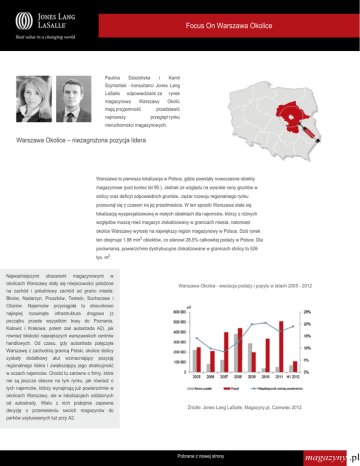 Focus On Warszawa Okolice Paulina Dziubińska i Kamil Szymański - konsultanci Jones Lang LaSalle odpowiedzialni za magazynowy Warszawy mają przyjemność najnowszy rynek Okolic przedstawić przegląd rynku nieruchomości magazynowych. Warszawa Okolice – niezagrożona pozycja lidera Warszawa to pierwsza lokalizacja w Polsce, gdzie powstały nowoczesne obiekty magazynowe (pod koniec lat 90.). Jednak ze względu na wysokie ceny gruntów w stolicy oraz deficyt odpowiednich gruntów, ciężar rozwoju regionalnego rynku przesunął się z czasem na jej przedmieścia. W ten sposób Warszawa stała się lokalizacją wyspecjalizowaną w małych obiektach dla najemców, którzy z różnych względów muszą mieć magazyn zlokalizowany w granicach miasta, natomiast okolice Warszawy wyrosły na największy region magazynowy w Polsce. Dziś rynek ten obejmuje 1,98 mln2 obiektów, co stanowi 28,5% całkowitej podaży w Polsce. Dla porównania, powierzchnie dystrybucyjne zlokalizowane w granicach stolicy to 526 tys. m2. Najważniejszymi obszarami magazynowymi w okolicach Warszawy stały się miejscowości położone na zachód i południowy zachód od granic miasta: Błonie, Nadarzyn, Pruszków, Teresin, Sochaczew i Ożarów. Najemców przyciągała tu stosunkowo najlepiej rozwinięta infrastruktura drogowa (z początku przede wszystkim trasy do Poznania, Katowic i Krakowa, potem zaś autostrada A2), jak również bliskość największych warszawskich centrów handlowych. Od czasu, gdy autostrada połączyła Warszawę z zachodnią granicą Polski, okolice stolicy zyskały dodatkowy atut wzmacniający pozycję regionalnego lidera i zwiększający jego atrakcyjność w oczach najemców. Chodzi tu zarówno o firmy, które nie są jeszcze obecne na tym rynku, jak również o tych najemców, którzy wynajmują już powierzchnie w okolicach Warszawy, ale w lokalizacjach oddalonych od autostrady. Wielu z nich podejmie zapewne decyzję o przeniesieniu swoich magazynów do parków usytuowanych tuż przy A2. Warszawa Okolice - ewolucja podaży i popytu w latach 2005 - 2012 Źródło: Jones Lang LaSalle, Magazyny.pl, Czerwiec 2012. Pobrane z nowej strony magazyny .pl Atrakcyjność okolic Warszawy potwierdzają dane rynkowe. W I połowie 2012 roku podpisano umowy na 108 tys. m2 magazynów zlokalizowanych w tym regionie (19% popytu brutto w całej Polsce). Jedynie Górny Śląsk był popularniejszą lokalizacją. Całkowicie nowe umowy najmu dotyczyły 61 tys. m2, co dawało rynkowi podwarszawskiemu trzecie miejsce za Górnym Śląskiem i Wrocławiem. Podobnie jak w całej Polsce, największy udział w popycie w okolicach Warszawy mają firmy logistyczne. W I połowie 2012 roku zdominowały one transakcje, wynajmując 77,8 tys. m2, co przełożyło się na 72% całkowitego popytu w regionie. Procentowy udział innych branż w popycie pozostawał niewielki. Nie ma wątpliwości co do faktu, iż autostrada wpływa bardzo pozytywnie na rozwój rynku magazynowego okolic Warszawy. Jest jednak i druga strona medalu - to groźba marginalizacji dla miejscowości oddalonych od A2. W takiej sytuacji znajduje się m.in. tradycyjnie najsilniejszy ośrodek w okolicach Warszawy, czyli Błonie (położone przy poprzedniej głównej trasie na Poznań). Zlokalizowane w tej miejscowości magazyny to 589 tys. m2, czyli 30% powierzchni dystrybucyjnej w okolicach Warszawy. Ze względu na spadające zainteresowanie tą lokalizacją, aż 32% magazynów w Błoniu pozostaje niewynajęte. Ponieważ miejscowość ta definitywnie straciła status najatrakcyjniejszej logistycznie lokalizacji w okolicach Warszawy, szansą dla tamtejszych parków może być obniżenie czynszu. Pozwoliłoby to przyciągać najemców, dla których bliskość autostrady nie jest kluczowym kryterium. W ten sposób Błonie mogłoby zająć rynkową niszę jako tańsza alternatywa dla parków przy A2. Nie tylko Błonie boryka się z brakiem najemców. Również w innych miejscowościach oddalonych od autostrady właściciele parków mają problem z zapełnieniem budynków. Tak jest w Teresinie i Nadarzynie, gdzie wskaźniki dostępnej powierzchni wyniosły 29%. Sytuacja w tych miejscowościach wpływa w dużym stopniu na poziom pustostanów w całym regionie. Notowany pod koniec czerwca 2012 roku wskaźnik pustych magazynów w okolicach Warszawy wyniósł 19%. Był to najwyższy – oprócz Szczecina – wynik w całym kraju. Jednak sytuacja wcale nie jest tak korzystna dla najemców, jakby to wyglądało na pierwszy rzut oka. W najciekawszych lokalizacjach wzdłuż A2 wybór jest niewielki. Dla przykładu, w Pruszkowie zaledwie 3% powierzchni magazynowej pozostaje bez najemcy. O deficycie magazynów w pobliżu A2 powinny pamiętać zwłaszcza firmy poszukujące dużych powierzchni. W ich przypadku jedyną właściwie opcją jest budowa nowego obiektu.To jednak oznacza konieczność co najmniej półrocznego oczekiwania na zrealizowanie inwestycji. Odzwierciedleniem znacznych różnic we wskaźnikach dostępnej powierzchni w poszczególnych lokalizacjach okolic Warszawy jest niejednorodna struktura czynszów efektywnych wahających się między 2,30 a 2,90 EUR/m2/miesiąc. W najbardziej atrakcyjnych rejonach najemcy muszą się liczyć z tym, że stawki będą stosunkowo wysokie i ciężko będzie im wynegocjować większe upusty. Warszawa Okolice - popyt według sektorów w I poł. 2012 r. Źródło: Jones Lang LaSalle, Magazyny.pl, Czerwiec 2012. Podsumowanie regionu Z kolei w lokalizacjach, które cierpią na chroniczny deficyt najemców, deweloperzy będą skłonni pójść na daleko idące ustępstwa. Różnice w czynszach są na tyle znaczące, że potencjalni najemcy powinni najpierw zastanowić się, jak ważny jest dla nich dostęp do autostrady, i dopiero wtedy szukać odpowiedniej oferty. Okolice Warszawy pozostaną w najbliższej przyszłości zdecydowanym liderem rynku pod względem istniejącej powierzchni. Wprawdzie na koniec I połowy 2012 roku w