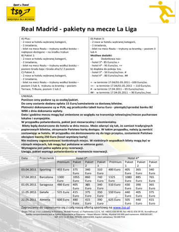 Real Madrid - pakiety na mecze La Liga A) Plus: - 2 noce w hotelu wybranej kategorii, - 2 śniadania, - bilet na mecz Realu – trybuny wzdłuż boiska – najlepsze dostępne – na środku trybun B) Pakiet 1: - 2 noce w hotelu wybranej kategorii, - 2 śniadania, - bilet na mecz Realu – trybuny wzdłuż boiska – poziom Grada baja i Grada alta/1/ 2 poziom C) Pakiet 2: - 2 noce w hotelu wybranej kategorii, - 2 śniadania, - bilet na mecz Realu – trybuny wzdłuż boiska – poziom 3 lub 4, trybuny za bramką – poziom: Terrace, Tribune, poziom 1 lub 2 D) Pakiet 3: - 2 noce w hotelu wybranej kategorii, - 2 śniadania, - bilet na mecz Realu – trybuny za bramką – poziom 3 lub 4 Możliwe dodatki: a) Dodatkowa noc: - hotel 3*- 85 Euro/os.+ - hotel 4* - 95 Euro/os. ++ b) dopłata do pokoju 1os. - hotel 3* - 50 Euro/os/noc. # - hotel 4* - 80 Euro/os/noc. ## + - w terminie 17.04/01.05.2011 –100 Euro/os. ++ - w terminie 17.04/01.05.2011 – 110 Euro/os. # - w terminie 17.04.2011 – 65 Euro/os/noc. ## - w terminie 17.04.05.2011 – 90 Euro/os./noc UWAGA: Poniższe ceny podane są za osobę/pakiet. Do ceny zostanie dodana opłata 15 Euro/zamówienie za dostawę biletów. Płatności dokonywane są w PLN, wg przelicznika tabeli kursu Euro - pieniądz/sprzedaż banku BZ WBK z dnia dokonania wpłaty. Data i godzina meczu mogą byd zmienione ze względu na transmisje telewizyjne/mecze pucharowe lokalne i europejskie. W przypadku potwierdzenia, pakiet jest niezwracalny i niezmienialny. Bilety będą dostarczone do hotelu w dniu meczu. Może zdarzyd się tak, że zamiast tradycyjnych papierowych biletów, otrzymacie Paostwo kartę dostępu. W takim przypadku, należy ją zwrócid zostawiając w hotelu. W przypadku nie dostosowania się do tego przepisu, zostaniecie Paostwo obciążeni kwotą 250 Euro (koszt wymiany karty) Nie możemy zagwarantowad konkretnych miejsc. W niektórych wypadkach bilety mogą byd w różnych miejscach, lub mogą byd położone w sektorze gości. Wymagana jest pełna wpłata przy rezerwacji. Uwaga, pakiet wymaga potwierdzenia w momencie rezerwacji. Data Przeciwnik 03.04.2011 Sporting 17.04.2011 Barcelona 01.05.2011 Saragossa 11.05.2011 Getafe 22.05.2011 Almeria Hotel 3* Premium Pakiet Pakiet 1 2 455 Euro 375 340 Euro Euro 1300 1055 860 Euro Euro Euro 480 Euro 405 365 Euro Euro 525 Euro 415 375 Euro Euro 600 Euro 480 415 Euro Euro Pakiet 3 310 Euro 740 Euro 340 Euro 350 Euro 390 Euro Hotel 4* Premium Pakiet Pakiet 1 2 480 Euro 405 365 Euro Euro 1325 1080 885 Euro Euro Euro 510 Euro 430 390 Euro Euro 550 Euro 440 405 Euro Euro 625 Euro 505 440 Euro Euro Pakiet 3 340 Euro 765 Euro 365 Euro 375 Euro 415 Euro Zapraszamy do zapoznania się z całą naszą ofertą sportową na www.tso.pl Grupa TSO sp. z o.o. z siedzibą w Poznaniu, 60-649 Poznao, ul. Piątkowska 112 A, tel. +48 61 656 99 99, fax +48 61 656 99 95, [email protected] Spółka zarejestrowana jest w Sądzie Rejonowym w Poznaniu – Nowe Miasto i Wilda, Wydział VIII KRS pod numerem: 0000265187, NIP: 972-11-45-928, REGON: 300416369, Kapitał zakładowy: 50.000 PLN