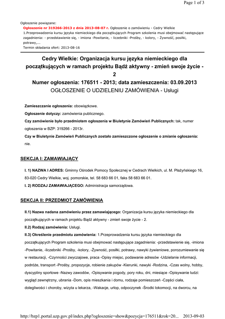 Page 1 of 3 Ogłoszenie powiązane: Ogłoszenie nr 319266-2013 z dnia 2013-08-07 r. Ogłoszenie o zamówieniu - Cedry Wielkie 1.Przeprowadzenia kursu języka niemieckiego dla początkujących Program szkolenia musi obejmować następujące zagadnienia: - przedstawienie się, - imiona -Powitanie, - liczebniki -Prośby, - kolory, - śywność, posiłki, potrawy,... Termin składania ofert: 2013-08-16 Cedry Wielkie: Organizacja kursu języka niemieckiego dla początkujących w ramach projektu Bądź aktywny - zmień swoje Ŝycie 2 Numer ogłoszenia: 176511 - 2013; data zamieszczenia: 03.09.2013 OGŁOSZENIE O UDZIELENIU ZAMÓWIENIA - Usługi Zamieszczanie ogłoszenia: obowiązkowe. Ogłoszenie dotyczy: zamówienia publicznego. Czy zamówienie było przedmiotem ogłoszenia w Biuletynie Zamówień Publicznych: tak, numer ogłoszenia w BZP: 319266 - 2013r. Czy w Biuletynie Zamówień Publicznych zostało zamieszczone ogłoszenie o zmianie ogłoszenia: nie. SEKCJA I: ZAMAWIAJĄCY I. 1) NAZWA I ADRES: Gminny Ośrodek Pomocy Społecznej w Cedrach Wielkich, ul. M. PłaŜyńskiego 16, 83-020 Cedry Wielkie, woj. pomorskie, tel. 58 683 66 01, faks 58 683 66 01. I. 2) RODZAJ ZAMAWIAJĄCEGO: Administracja samorządowa. SEKCJA II: PRZEDMIOT ZAMÓWIENIA II.1) Nazwa nadana zamówieniu przez zamawiającego: Organizacja kursu języka niemieckiego dla początkujących w ramach projektu Bądź aktywny - zmień swoje Ŝycie - 2. II.2) Rodzaj zamówienia: Usługi. II.3) Określenie przedmiotu zamówienia: 1.Przeprowadzenia kursu języka niemieckiego dla początkujących Program szkolenia musi obejmować następujące zagadnienia: -przedstawienie się, -imiona -Powitanie, -liczebniki -Prośby, -kolory, -śywność, posiłki, potrawy, nawyki Ŝywieniowe, porozumiewanie się w restauracji, -Czynności zwyczajowe, praca -Opisy miejsc, podawanie adresów -Udzielanie informacji, podróŜe, transport -Prośby, propozycje, robienie zakupów -Kierunki, nawyki -Rodzina, -Czas wolny, hobby, dyscypliny sportowe -Nazwy zawodów, -Opisywanie pogody, pory roku, dni, miesiące -Opisywanie ludzi: wygląd zewnętrzny, ubrania -Dom, opis mieszkania i domu, rodzaje pomieszczeń -Części ciała, dolegliwości i choroby, wizyta u lekarza, -Wakacje, urlop, odpoczynek -Środki lokomocji, na dworcu, na http://bzp1.portal.uzp.gov.pl/index.php?ogloszenie=show&pozycja=176511&rok=20... 2013-09-03 Page 2 of 3 lotnisku, -Orientacja w mieście, -Gramatyka: -czas teraźniejszy Präsens -odmiana czasowników regularnych i nieregularnych w czasie Präsens -zaimki osobowe w mianowniku, bierniku i celowniku, zaimki dzierŜawcze w mianowniku, bierniku i celowniku, -liczebniki główne i porządkowe, -zdanie oznajmujące i pytające, szyk wyrazów w zdaniu, szyk prosty i przestawny w zdaniu, -rodzajniki określony i nieokreślony, -mianownik, biernik i celownik rzeczownika, -przeczenie nicht, -przeczenie kein/e/ -w mianowniku, bierniku i celowniku, -odmiana czasowników modalnych w czasie Präsens -zdania z czasownikami modalnymi, -odmiana czasowników rozdzielnie i nierozdzielnie złoŜonych w czasie Präsens -rzeczowniki złoŜone, -przyimki oznaczające relacje przestrzenne, przyimki -z biernikiem i celownikiem, przysłówki czasu, -tryb rozkazujący, -czas przeszły Perfekt -stopniowanie przymiotników i przysłówków, zaimki wskazujące 2. Wykonawca w pierwszym dniu, przed rozpoczęciem kursu jest zobowiązany zapoznać uczestników z jego szczegółowym programem oraz przekazać im harmonogram realizowanych zajęć 3. Wykonawca jest zobowiązany do przeprowadzenia wśród uczestników kursu oceny merytorycznej przebiegu kursu-ewaluacji na podstawie przeprowadzonych ankiet na początku i na zakończenie kursu. Wyniki oceny merytorycznej przebiegu kursu-ewaluacji Wykonawca przekaŜe w formie pisemnej Zamawiającemu po zakończeniu kursu. 4. Wykonawca dostarcza Zamawiającemu dokumentację fotograficzną z prowadzonego kursu, po uzyskaniu pisemnej zgody uczestników kursu. 5. Miejsce szkolenia: śuławski Ośrodku Kultury i Sportu w Cedrach Wielkich 6. KaŜda osoba po zakończeniu kursów otrzyma - zaświadczenie o ukończeniu kursu języka niemieckiego dla początkujących 7. Liczba uczestników: 3 Beneficjentów Ostatecznych zakwalifikowanych przez Zamawiającego do udziału w szkoleniu pn. kurs języka niemieckiego dla początkujących, organizowanym w ramach projektu Bądź aktywny - zmień swoje Ŝycie - 2. 8.Termin realizacji: w okresie 4 września 2013r. - 31 październik 2013r. 9.Wymiar czasowy: kurs powinien obejmować 80 godzin. Określenie godzina oznacza godzinę zegarową 60 minut. 10.Odpowiednio szczegółowy harmonogram realizacji kursu z zajęciami rozpisanymi na kaŜdego uczestnika wymaga akceptacji Zamawiającego. 11.Inne postanowienia dotyczące kursu: -Zajęcia teoretyczne mogą się odbywać w dni powszednie z wyłączeniem sobót, niedziel i dni ustawowo wolnych od pracy w godzinach 9:00 - 17:00 -Wszyscy uczestnicy kursu mają otrzymać od Wykonawcy materiały edukacyjne w formie drukowanej oraz elektronicznej (płyta CD, długopis, teczka, zeszyt/notes, skrypty dotyczące danego kursu zawierające omawiane zagadnienia, oznaczone logo projektu) -Sala, w której odbędą się zajęcia muszą zostać oznaczone przez Wykonawcę logotypami instytucji finansujących oraz informacjami na temat projektu. -Zamawiający ma prawo wprowadzić zmiany w przedstawionym przez Wykonawcę harmonogramie zajęć. JeŜeli Zamawiający wprowadzi takie zmiany poinformuje o tym Wykonawcę minimum 7 dni przed terminem kursu. -Wykonawca ubezpieczy uczestników na czas trwania szkolenia -Wykonawca zagwarantuje dla uczestników podczas przerw kawowych herbatę, kawę, ciastka, wodę mineralną. 12.Cenę oferty naleŜy traktować, jako stałą i niezmienną w okresie obowiązywania umowy. 13. Zamawiający wymaga, aby Wykonawca wskazał w ofercie części zamówienia, których wykonanie powierza podwykonawcom. http://bzp1.portal.uzp.gov.pl/index.php?og