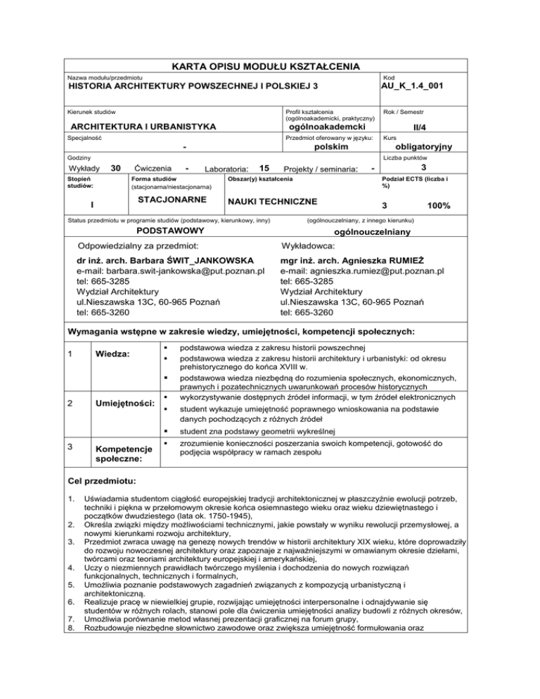 karta przedmiotu - Wydział Architektury Politechniki Poznańskiej