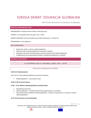 SZKOŁA DEBAT: EDUKACJA GLOBALNA KRYTYCZNE MYŚLENIE W EDUKACJI GLOBALNEJ KWESTIE ORGANIZACYJNE ORGANIZATOR: Fundacja Partners Polska, www.fpp.org.pl TERMIN: 12-13 listopada 2013 rok, godz. 9.30 – 16.00 MIEJSCE SZKOLENIA: Centrum Konferencyjne Zielna (Warszawa, ul. Zielna 37) PROWADZĄCA: dr Ewa Dąbrowa CELE SZKOLENIA Budowanie wiedzy z zakresu edukacji globalnej. Ukazanie miejsca edukacji globalnej w przestrzeni szkolnej. Rozwijanie warsztatu metodycznego w zakresie realizacji treści edukacji globalnej. Przygotowanie do przeprowadzenia debat o problemach globalnych w szkołach. AGENDA SZKOLENIA 12 LISTOPADA 2013 R. (WTOREK), GODZ. 9.30 – 16.00 EDUKACJA GLOBALNA W SZKOLE 9.30-10.15: Wprowadzenie 10.15-13.15: Treści edukacji globalnej w przestrzeni szkolnej: Edukacja globalna – czym powinna być? 10.45-11.00: przerwa kawowa 11.00 – 13.15: Miejsce edukacji globalnej w polskiej szkole: Identyfikacja obszarów; Edukacja globalna - w świetle dokumentów programowych i w praktyce. Nauczyciele wobec problemów edukacji globalnej - ćwiczenie. Zasady pracy z uczniami w ramach edukacji globalnej. 13.15-13.45: przerwa na lunch (kanapka) 1|S t r o n a Warsztat jest współfinansowany w ramach programu polskiej współpracy rozwojowej Ministerstwa Spraw Zagranicznych RP w 2013 r. oraz ze środków Komisji Europejskiej. 13.45-16.00: Wybrane problemy globalnego świata na przykładzie krajów Południa: Wybrane problemy krajów globalnego Południa: bieda i wykluczenie, realizacja prawa dostępu do edukacji, degradacja środowiska naturalnego. Spotkanie z edukatorem z Kenii! Identyfikacja zależności między problemami globalnymi na podstawie filmu Szkoła z blachy. Język analizy problemów globalnych. 15.45-16.00: Podsumowanie dnia 13 LISTOPADA 2013 ROK (PIĄTEK), 9.30 – 16.00 DEBATA JAKO NARZĘDZIE REALIZACJI EDUKACJI GLOBALNEJ W ŚRODOWISKU SZKOLNYM 9.30-10.45: Narzędzia pracy szkolnej w zakresie edukacji globalnej Narzędzia wykorzystywane w szkole w zakresie edukacji globalnej – przegląd. Ćwiczenie – prezentacja jednego problemy z zakresu edukacji globalnej na podstawie wybranego narzędzia. Możliwości i ograniczenia wynikające z dostępnych narzędzi. Wartość debaty w edukacji globalnej. Prezentacja różnych typów debat, ze szczególnym uwzględnieniem debaty oksfordzkiej. 10.45-11.00: przerwa kawowa 11.00-15.30: Debata oksfordzka jako narzędzie krytycznego myślenia podczas zajęć edukacji globalnej. Doświadczenia uczestników warsztatu w pracy Debatą oksfordzką Na czym polega debata oksfordzka? – zasady organizacji i prowadzenia. Przygotowanie do przeprowadzenia debaty w ramach warsztatu (podział ról, przygotowanie argumentów do debaty przez stronę ‘propozycji’ i ‘opozycji’, organizacja sali itd. 13.15-13.45: przerwa na lunch (kanapka) 13.45 – 15.30: Przeprowadzenie debaty oksfordzkiej. Podsumowanie debaty – organizacja, argumentacja. Przygotowanie uczniów do debaty o problemach globalnego świata. 15.30-16.00: Zakończenie szkolenia: podsumowanie merytoryczne, ewaluacja, rozdanie zaświadczeń. 2|S t r o n a Warsztat jest współfinansowany w ramach programu polskiej współpracy rozwojowej Ministerstwa Spraw Zagranicznych RP w 2013 r. oraz ze środków Komisji Europejskiej.