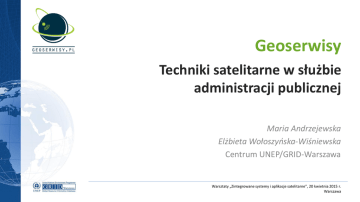 Geoserwisy Techniki satelitarne w służbie administracji publicznej Maria Andrzejewska Elżbieta Wołoszyńska-Wiśniewska Centrum UNEP/GRID-Warszawa Warsztaty „Zintegrowane systemy i aplikacje satelitarne”, 20 kwietnia 2015 r. Warszawa Centrum UNEP/GRID-Warszawa • Status fundacji • Utworzone w 1991 r. (UNEP – Ministerstwo Środowiska) • Ośrodek sieci GRID (ang. Global Resource Information Database) • Geoinformacja dla administracji publicznej • Nowoczesne technologie w edukacji przyrodniczej • Budujemy partnerstwa www.gridw.pl Geoinformacja dla adm. publicznej • Seminaria geoinformacyjne – webinaria • Szkolenia stacjonarne – kursy online • Aplikacje mapowe, bazy danych przestrzennych Techniki satelitarne • Wspieranie rozwoju wiedzy i umiejętności pracowników administracji publicznej z zakresu teledetekcji satelitarnej • Promocja zastosowania produktów satelitarnych m.in. w zarządzaniu środowiskiem, planowaniu przestrzennym, ochronie bioróżnorodności • Aplikacje mapowe/mobilne Status RCO Mazovia Źródło: Program Copernicus, www.copernicus.eu Realizacja projektu: „Serwisy ESA jako wsparcie w zarządzaniu środowiskiem w Polsce” Współpraca: Projekt zrealizowany ze środków ESA PECS The Plan for European Co-operating States Cel projektu Promocja efektywnego wykorzystania produktów i usług Programu Copernicus przez administrację publiczną w Polsce, zwłaszcza jako narzędzia wspierającego wypełnianie obowiązków dotyczących monitorowania stanu środowiska i raportowania w tym zakresie. Podejście ukierunkowane na użytkownika Badanie potrzeb użytkowników Jak często wykorzystuje Pani/Pan w swojej pracy zobrazowania satelitarne? Zobrazowania satelitarne najczęściej stosowane przy: • analizie zasięgów obszarów chronionych (weryfikacja przebiegu granic), • analizie pokrycia terenu, • lokalizacji obiektów (zwłaszcza na obszarach szczególnie narażonych na klęski żywiołowe), • działaniach planistycznych. Źródło: http://www.esa.int Podejście ukierunkowane na użytkownika Scenariusze zastosowania danych i produktów satelitarnych w zarządzaniu środowiskiem, planowaniu przestrzennym, zarządzaniu kryzysowym… Wybrane produkty informacyjne Dedykowany system (geoportal oraz aplikacja mobilna) Scenariusze zastosowania danych i produktów satelitarnych w zarządzaniu środowiskiem, planowaniu przestrzennym, zarządzaniu kryzysowym Monitorowanie rozwoju obszarów zurbanizowanych Rozwój infrastruktury a obszary cenne przyrodniczo Identyfikacja/monitorowanie siedlisk nieleśnych Zapraszamy do kontaktu www.geoserwisy.pl/geoportal Portal informacyjny www.geoserwisy.pl Scenariusze zastosowania danych i produktów satelitarnych w zarządzaniu środowiskiem, planowaniu przestrzennym, zarządzaniu kryzysowym Kurs online http://e-platforma.gridw.pl Portal Geoserwisy.pl (www.geoserwisy.pl) Sekcje dedykowane Sekcje dedykowane Otwarte szkolenie online (http://e-platforma.gridw.pl) Otwarte szkolenie online (http://e-platforma.gridw.pl) Wybrane produkty informacyjne Dedykowany system (geoportal oraz aplikacja mobilna) Portal informacyjny www.geoserwisy.pl Scenariusze zastosowania danych i produktów satelitarnych w zarządzaniu środowiskiem, planowaniu przestrzennym, zarządzaniu kryzysowym Kurs online http://e-platforma.gridw.pl Centrum UNEP/GRID-Warszawa Sobieszyńska 8 00-764 Warszawa Telefon +48 22 840 66 64 Fax: +48 22 851 62 01 http://www.gridw.pl Maria Andrzejewska [email protected] Elżbieta Wołoszyńska-Wiśniewska [email protected]