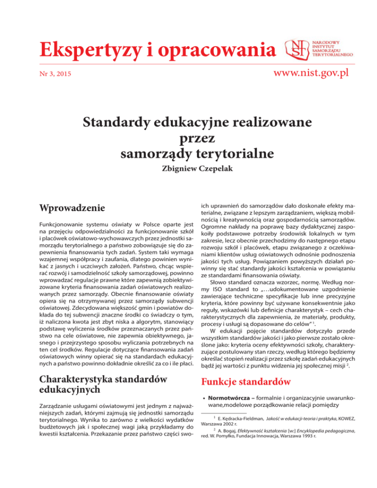 Ekspertyzy i opracowania www.nist.gov.pl Nr 3, 2015 Standardy edukacyjne realizowane przez samorządy terytorialne Zbigniew Czepelak Wprowadzenie Funkcjonowanie systemu oświaty w Polsce oparte jest na przejęciu odpowiedzialności za funkcjonowanie szkół i placówek oświatowo-wychowawczych przez jednostki samorządu terytorialnego a państwo zobowiązuje się do zapewnienia finansowania tych zadań. System taki wymaga wzajemnej współpracy i zaufania, dlatego powinien wynikać z jasnych i uczciwych założeń. Państwo, chcąc wspierać rozwój i samodzielność szkoły samorządowej, powinno wprowadzać regulacje prawne które zapewnią zobiektywizowane kryteria finansowania zadań oświatowych realizowanych przez samorządy. Obecnie finansowanie oświaty opiera się na otrzymywanej przez samorządy subwencji oświatowej. Zdecydowana większość gmin i powiatów dokłada do tej subwencji znaczne środki co świadczy o tym, iż naliczona kwota jest zbyt niska a algorytm, stanowiący podstawę wyliczenia środków przeznaczanych przez państwo na cele oświatowe, nie zapewnia obiektywnego, jasnego i przejrzystego sposobu wyliczania potrzebnych na ten cel środków. Regulacje dotyczące finansowania zadań oświatowych winny opierać się na standardach edukacyjnych a państwo powinno dokładnie określić za co i ile płaci. Charakterystyka standardów edukacyjnych Zarządzanie usługami oświatowymi jest jednym z najważniejszych zadań, którymi zajmują się jednostki samorządu terytorialnego. Wynika to zarówno z wielkości wydatków budżetowych jak i społecznej wagi jaką przykładamy do kwestii kształcenia. Przekazanie przez państwo części swo- ich uprawnień do samorządów dało doskonałe efekty materialne, związane z lepszym zarządzaniem, większą mobilnością i kreatywnością oraz gospodarnością samorządów. Ogromne nakłady na poprawę bazy dydaktycznej zaspokoiły podstawowe potrzeby środowisk lokalnych w tym zakresie, lecz obecnie przechodzimy do następnego etapu rozwoju szkół i placówek, etapu związanego z oczekiwaniami klientów usług oświatowych odnośnie podnoszenia jakości tych usług. Powiązaniem powyższych działań powinny się stać standardy jakości kształcenia w powiązaniu ze standardami finansowania oświaty. Słowo standard oznacza wzorzec, normę. Według normy ISO standard to „…udokumentowane uzgodnienie zawierające techniczne specyfikacje lub inne precyzyjne kryteria, które powinny być używane konsekwentnie jako reguły, wskazówki lub definicje charakterystyk – cech charakterystycznych dla zapewnienia, że materiały, produkty, procesy i usługi są dopasowane do celów” 1. W edukacji pojęcie standardów dotyczyło przede wszystkim standardów jakości i jako pierwsze zostało określone jako: kryteria oceny efektywności szkoły, charakteryzujące postulowany stan rzeczy, według którego będziemy określać stopień realizacji przez szkołę zadań edukacyjnych bądź jej wartości z punktu widzenia jej społecznej misji 2. Funkcje standardów • Normotwórcza – formalnie i organizacyjnie uwarunkowane,modelowe porządkowanie relacji pomiędzy 1 E. Kędracka-Fieldman, Jakość w edukacji-teoria i praktyka, KOWEZ, Warszawa 2002 r. 2 A. Bogaj, Efektywność kształcenia [w:] Encyklopedia pedagogiczna, red. W. Pomyłko, Fundacja Innowacja, Warszawa 1993 r. EKSPERTYZY Nr 3(3) 21 grudnia 2015 techniczno-organizacyjnymi i jakościowymi kryteriami świadczenia usług oświatowych a potrzebami w tym zakresie; • Stymulująca - rozumiana jako zespół czynników mających wpływ na kształt i zasady funkcjonowania rynku usług oświatowych; • Ekonomiczna – określająca, poprzez kryteria kosztów, racjonalność finansową świadczonych usług w tym również porównywalność kosztów realizacji zadań oświatowych; • Społeczna – relacja między sposobem funkcjonowania infrastruktury usług oświatowych a poziomem zaspokojenia potrzeb w tym zakresie. Zasady którym powinny odpowiadać standardy usług • Adekwatności – to znaczy względnej zgodności między potrzebami określonych grup klientów a oferowanym zakresem i jakością usług; • Elastyczności – to znaczy stosowania metod, technik i sposobów zaspokajania potrzeb w zależności od zaistniałej sytuacji, w granicach gwarantujących zachowanie pierwotnego znaczenia i celu realizowanego zadania; • Ramowości – to znaczy możliwości poruszania się w procesie zaspokajania potrzeb w odpowiednim, o ustalonej rozpiętości, przedziale norm i normatywów, pozwalających, dzięki możliwości wyboru kryteriów, działać skutecznie na rzecz konkretnego klienta lub na rzecz grupy klientów; • Spójności – to znaczy korelacji rozwiązań przyjętych i stosowanych na różnych poziomach zarządzania sferą społeczną.3 Rodzaje standardów oświatowych Oświata obejmuje różnorodne grupy zadań, których zdefiniowanie jest uzależnione od przyjętego kryterium. W ramach próby definiowania standardów oświatowych w oparciu o ich zakres i obszar oddziaływania, można sprecyzować podział na kilka rodzajów standardów mających ponadto charakter ogólnopolski lub lokalny. Formułowanie standardów musi uwzględniać kryteria, które powinny: • zawierać opis oczekiwanego i pożądanego stanu, służącego rozwojowi określonego obiektu edukacyjnego, • stanowić spójną całość, • być zgodne z prawem, • być akceptowane społecznie, • charakteryzować się racjonalnością i uniwersalnością. Z formułowaniem standardów wiąże się określanie wskaźników które są miernikami spełniania standardów. W literaturze możemy spotkać się z różnymi podziałami standardów edukacyjnych. Wg Toruńskiego4 podział standardów J. Boczoń, Standaryzacja usług społecznych, SPLOT, 2004 r. J. Toruński, Standardy jakości procesu kształcenia, Zeszyty naukowe Akademii Podlaskiej w Siedlcach Seria: Administracja i Zarządza