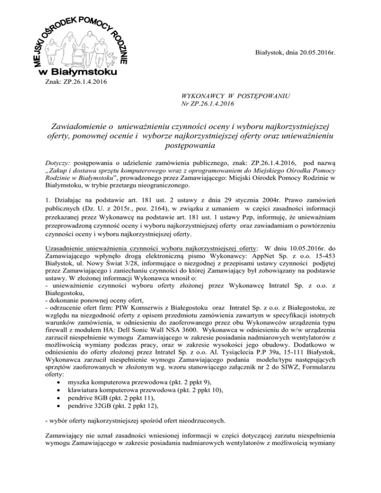 Białystok, dnia 20.05.2016r. Znak: ZP.26.1.4.2016 WYKONAWCY W POSTĘPOWANIU Nr ZP.26.1.4.2016 Zawiadomienie o unieważnieniu czynności oceny i wyboru najkorzystniejszej oferty, ponownej ocenie i wyborze najkorzystniejszej oferty oraz unieważnieniu postępowania Dotyczy: postępowania o udzielenie zamówienia publicznego, znak: ZP.26.1.4.2016, pod nazwą „Zakup i dostawa sprzętu komputerowego wraz z oprogramowaniem do Miejskiego Ośrodka Pomocy Rodzinie w Białymstoku”, prowadzonego przez Zamawiającego: Miejski Ośrodek Pomocy Rodzinie w Białymstoku, w trybie przetargu nieograniczonego. 1. Działając na podstawie art. 181 ust. 2 ustawy z dnia 29 stycznia 2004r. Prawo zamówień publicznych (Dz. U. z 2015r., poz. 2164), w związku z uznaniem w części zasadności informacji przekazanej przez Wykonawcę na podstawie art. 181 ust. 1 ustawy Pzp, informuję, że unieważniam przeprowadzoną czynność oceny i wyboru najkorzystniejszej oferty oraz zawiadamiam o powtórzeniu czynności oceny i wyboru najkorzystniejszej oferty. Uzasadnienie unieważnienia czynności wyboru najkorzystniejszej oferty: W dniu 10.05.2016r. do Zamawiającego wpłynęło drogą elektroniczną pismo Wykonawcy: AppNet Sp. z o.o. 15-453 Białystok, ul. Nowy Świat 3/28, informujące o niezgodnej z przepisami ustawy czynności podjętej przez Zamawiającego i zaniechaniu czynności do której Zamawiający był zobowiązany na podstawie ustawy. W złożonej informacji Wykonawca wnosił o: - unieważnienie czynności wyboru oferty złożonej przez Wykonawcę Intratel Sp. z o.o. z Białegostoku, - dokonanie ponownej oceny ofert, - odrzucenie ofert firm: PIW Komserwis z Białegostoku oraz Intratel Sp. z o.o. z Białegostoku, ze względu na niezgodność oferty z opisem przedmiotu zamówienia zawartym w specyfikacji istotnych warunków zamówienia, w odniesieniu do zaoferowanego przez obu Wykonawców urządzenia typu firewall z modułem HA: Dell Sonic Wall NSA 3600. Wykonawca w odniesieniu do w/w urządzenia zarzucił niespełnienie wymogu Zamawiającego w zakresie posiadania nadmiarowych wentylatorów z możliwością wymiany podczas pracy, oraz w zakresie wysokości jego obudowy. Dodatkowo w odniesieniu do oferty złożonej przez Intratel Sp. z o.o. Al. Tysiąclecia P.P 39a, 15-111 Białystok, Wykonawca zarzucił niespełnienie wymogu Zamawiającego podania modelu/typu następujących sprzętów zaoferowanych w złożonym wg. wzoru stanowiącego załącznik nr 2 do SIWZ, Formularzu oferty: myszka komputerowa przewodowa (pkt. 2 ppkt 9), klawiatura komputerowa przewodowa (pkt. 2 ppkt 10), pendrive 8GB (pkt. 2 ppkt 11), pendrive 32GB (pkt. 2 ppkt 12), - wybór oferty najkorzystniejszej spośród ofert nieodrzuconych. Zamawiający nie uznał zasadności wniesionej informacji w części dotyczącej zarzutu niespełnienia wymogu Zamawiającego w zakresie posiadania nadmiarowych wentylatorów z możliwością wymiany podczas pracy, oraz w zakresie wysokości obudowy zaoferowanego urządzenia typu firewall z modułem HA: Dell Sonic Wall NSA 3600. Swoje stanowisko Zamawiający oparł na oświadczeniu firmy Dell Sp. z o.o. Al. Jerozolimskie 123A, 02-017 Warszawa – producenta oferowanego urządzenia typu firewall z modułem HA: Dell Sonic Wall NSA 3600, a także wyjaśnienia poszczególnych Wykonawców, w tym firmę AppNet wnoszącą informację na podstawie art. 181 ust. 2 ustawy Pzp, jak również opinie przedstawicieli firm zajmujących się montażem i eksploatacją urządzeń sieciowych W wyniku powtórnego badania i oceny ofert, Zamawiający uznał natomiast zasadność zarzutu niespełnienia przez Wykonawcę Intratel Sp. z o.o. wymogu Zamawiającego podania nazwy producenta oraz modelu/typu w odniesieniu do następujących sprzętów zaoferowanych w złożonym wg. wzoru stanowiącego załącznik nr 2 do SIWZ, Formularzu oferty: myszka komputerowa przewodowa (pkt. 2 ppkt 9), klawiatura komputerowa przewodowa (pkt. 2 ppkt 10), pendrive 8GB (pkt. 2 ppkt 11), pendrive 32GB (pkt. 2 ppkt 12). W związku z potwierdzeniem niezgodności oferty wybranego Wykonawcy z treścią specyfikacji istotnych warunków zamówienia, Zamawiający unieważnia przeprowadzoną w dniu 05.05.2016r. czynność oceny i wyboru najkorzystniejszej oferty. POWTÓRZONY WYBÓR NAJKORZYSTNIEJSZEJ OFERTY. 2. Działając na podstawie art. 92 ust. 2 ustawy z dnia 29 stycznia 2004r. Prawo zamówień publicznych (Dz. U. z 2015r. poz. 2164) informuję, że po dokonaniu badania i oceny ofert złożonych w postępowaniu w sprawie udzielenia zamówienia publicznego, znak: ZP.26.1.4.2016, pod nazwą „Zakup i dostawa sprzętu komputerowego wraz z oprogramowaniem do Miejskiego Ośrodka Pomocy Rodzinie w Białymstoku”, prowadzonym przez Zamawiającego: Miejski Ośrodek Pomocy Rodzinie w Białymstoku, w trybie przetargu nieograniczonego, wybrano jako najkorzystniejszą: Ofertę nr 3 – złożoną przez AppNet Sp. z o.o. 15-453 Białystok, ul. Nowy Świat 3/28, za cenę 496 733,04 zł. Oferta w/w Wykonawcy jest jedyną ważną ofertą jaka została złożona w tym postępowaniu, odpowiada wszystkim wymaganiom przedstawionym w ustawie – Prawo zamówień publicznych oraz specyfikacji istotnych warunków zamówienia i została oceniona jako najkorzystniejsza na podstawie przyjętych kryteriów oceny ofert – ceny(waga 97%) oraz termin wykonania dostawy (waga 3%) (otrzymała najwyższą liczbę punktów – 97,00 pkt). 3. Realizując zapis art. 92 ust. 1 pkt 1 ustawy , przekazuję poniżej informacje o wykonawcach, którzy złożyli oferty w przedmiotowym postępowaniu wraz ze streszczeniem, oceną i porównaniem złożonych ofert. Ocena ofert: Kryteria oceny i ich znaczenie: cena – waga 97%; termin wykonania dostawy – 3%. Liczba punktów Liczba Liczba punktów Firma (nazwa) lub nazwisko oraz adres w kryterium cena punktów w ogółem Wykonawcy Przedsiębiorstwo InnowacyjnoWdrożeniowe „KOMSERWIS” Spółka z o.o. 15-044 Białystok, ul. Piasta 16 kryterium