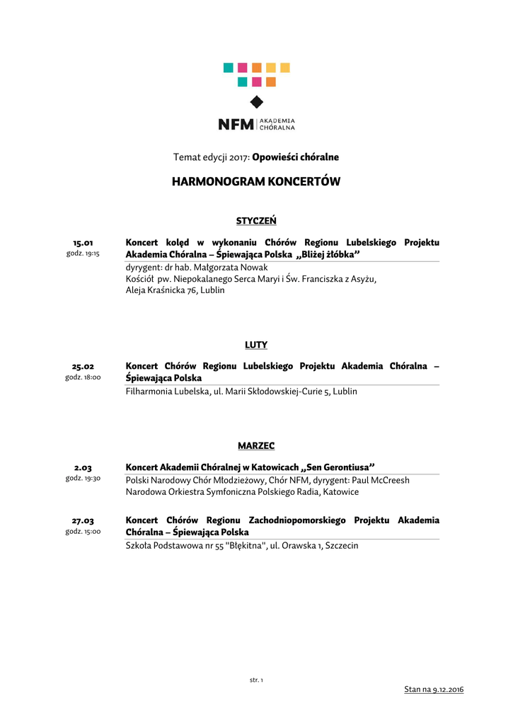 Temat edycji 2017: Opowieści chóralne HARMONOGRAM KONCERTÓW STYCZEŃ 15.01 godz. 19:15 Koncert kolęd w wykonaniu Chórów Regionu Lubelskiego Projektu Akademia Chóralna – Śpiewająca Polska „Bliżej żłóbka” dyrygent: dr hab. Małgorzata Nowak Kościół pw. Niepokalanego Serca Maryi i Św. Franciszka z Asyżu, Aleja Kraśnicka 76, Lublin LUTY 25.02 godz. 18:00 Koncert Chórów Regionu Lubelskiego Projektu Akademia Chóralna – Śpiewająca Polska Filharmonia Lubelska, ul. Marii Skłodowskiej-Curie 5, Lublin MARZEC 2.03 godz. 19:30 27.03 godz. 15:00 Koncert Akademii Chóralnej w Katowicach „Sen Gerontiusa” Polski Narodowy Chór Młodzieżowy, Chór NFM, dyrygent: Paul McCreesh Narodowa Orkiestra Symfoniczna Polskiego Radia, Katowice Koncert Chórów Regionu Zachodniopomorskiego Projektu Akademia Chóralna – Śpiewająca Polska Szkoła Podstawowa nr 55 "Błękitna", ul. Orawska 1, Szczecin str. 1 Stan na 9.12.2016 MAJ 18.05 godz. 18:30 Koncert Chórów Młodzieżowych Regionów Podlaskiego i WarmińskoMazurskiego Projektu Akademia Chóralna – Śpiewająca Polska – Bob Chilcott – A Little Jazz Mass Koncert w ramach Festiwalu Nauki i Sztuki Kościół pw. bł. Bolesławy Lament, Białystok CZERWIEC / LIPIEC 2.06 godz. 18:00 Koncert Chórów Regionu Śląskiego Projektu Akademia Chóralna – Śpiewająca Polska z okazji Dnia Dziecka Pszczyna 27.06 Koncert Chóru Dyrygentów W ramach Wakacyjnej Akademii Chóralnej Sala koncertowa Uniwersytetu Wrocławskiego Aula Leopoldina, Plac Uniwersytecki 1, Wrocław 29.06 Koncert chórów „Najsłynniejsze piosenki europejskie” W ramach Wakacyjnej Akademii Chóralnej Plac przed Narodowym Forum Muzyki, Plac Wolności 1, Wrocław 30.06 I Koncert Finałowy Akademii Chóralnej – Śpiewającej Polski – Gustav Mahler II Symfonia c-moll „Zmartwychwstanie” W ramach Wakacyjnej Akademii Chóralnej Narodowe Forum Muzyki, Plac Wolności 1, Wrocław 1.07 Koncert „Moniuszko inaczej” W ramach Festiwalu Moniuszkowskiego 2017 2.07 II Koncert Finałowy Akademii Chóralnej – Śpiewającej Polski W ramach Wakacyjnej Akademii Chóralnej Narodowe Forum Muzyki, Plac Wolności 1, Wrocław WRZESIEŃ 1.09 godz. 19:00 Koncert Akademii Chóralnej w Zielonej Górze „Pory Roku” Polski Narodowy Chór Młodzieżowy, dyrygenci: Agnieszka Franków-Żelazny, Marcin Tomczak Filharmonia Zielonogórska, Plac Powstańców Wielkopolskich 10, Zielona Góra str. 2 Stan na 9.12.2016 2.09 godz. 19:00 3.09 godz. 17:00 Koncert Akademii Chóralnej w Gorzowie „Pory Roku” Polski Narodowy Chór Młodzieżowy, dyrygenci: Agnieszka Franków-Żelazny, Marcin Tomczak Centrum Edukacji Artystycznej – Filharmonia Gorzowska, ul. Dziewięciu Muz 10, Gorzów Wielkopolski Koncert Akademii Chóralnej w Poznaniu „Pory Roku” Polski Narodowy Chór Młodzieżowy, dyrygenci: Agnieszka Franków-Żelazny, Marcin Tomczak Aula Uniwersytetu im. Adama Mickiewicza w Poznaniu, ul. Wieniawskiego 1, Poznań PAŹDZIERNIK 27.10 godz. 10:00 Prezentacje Chórów Regionu Lubelskiego Projektu Akademia Chóralna – Śpiewająca Polska w ramach Konkursu Poezji, Prozy i Pieśni Patriotycznej im. Ryszarda Kaczorowskiego „Ojczyzno moja najmilsza” Centrum Kultury w Lublinie, ul. Peowiaków 12, Lublin LISTOPAD 9.11 godz. 18:00 16.11 godz. 10:30 17.11 godz. 9:00 18.11 godz. 11:30 24.11 godz. 17:00 Koncert Chórów Regionu Lubelskiego Projektu Akademia Chóralna – Śpiewająca Polska podczas Gali Konkursu Poezji, Prozy i Pieśni Patriotycznej im. Ryszarda Kaczorowskiego „Ojczyzno moja najmilsza” Sala Operowa Centrum Spotkania Kultur w Lublinie, Plac Teatralny 1, Lublin Koncert Chórów Regionu Pomorskiego Projektu Akademia Chóralna – Śpiewająca Polska Sala koncertowa Akademii Muzycznej w Gdańsku, ul. Łąkowa 1-2, Gdańsk Koncert Jesienny Chórów Szkolnych Regionu Wielkopolski Południowej Projektu Akademia Chóralna – Śpiewająca Polska Aula Domu katechetycznego przy Kościele pw. Św. Antoniego w Ostrowie Wielkopolskim, ul. Raszkowska 39, Ostrów Wielkopolski Koncert Chórów Regionu Małopolskiego Projektu Akademia Chóralna – Śpiewająca Polska Sala koncertowa Akademii Muzycznej w Krakowie, Świętego Tomasza 43, Kraków Koncert Chórów Regionów Podlaskiego i Warmińsko-Mazurskiego Projektu Akademia Chóralna – Śpiewająca Polska Sala widowiskowa Ełckiego Centrum Kultury, ul. Wojska Polskiego 47, Ełk str. 3 Stan na 9.12.2016 25.11 godz. 17:00 Koncert Chórów Regionu Opolskiego Projektu Akademia Chóralna – Śpiewająca Polska Miejsko-Gminny Ośrodek Kultury w Głogówku ul. Stefana Batorego 10, Głogówek GRUDZIEŃ 1.12 godz. 17:00 3.12 godz. 9:00 i 11:00 6.12 godz.16:00 8.12 godz. 10:00 10.12 godz. 15:00 13.12 godz. 10:00 16.12 godz. 16:00 17.12 godz. 10:00 i 11:30 Koncert Chórów Dziecięcych Regionów Podlaskiego i WarmińskoMazurskiego Projektu Akademia Chóralna – Śpiewająca Polska Aula Widowiskowa Wydziału Pedagogiki i Psychologii Uniwersytetu w Białymstoku, ul. Świerkowa 20, Białystok Koncert Chórów Regionów Wrocław i Dolny Śląsk Projektu Akademia Chóralna – Śpiewająca Polska w ramach Koncertów Edukacyjnych NFM Sala Główna KGHM, Narodowe Forum Muzyki, Plac Wolności 1, Wrocław Koncert Chórów Regionu Podkarpackiego Projektu Akademia Chóralna – Śpiewająca Polska „Rozśpiewały się obłoki” Millenium Hall, aleja Kopisto 1, Rzeszów Koncert Chórów Regionu Świętokrzyskiego Projektu Akademia Chóralna – Śpiewająca Polska „Opowieść chóralna” Starachowickie Centrum Kultury, ul. Radomska 21, Starachowice Zimowy Koncert Chórów Regionu Wielkopolski Zachodniej Projektu Akademia Chóralna – Śpiewająca Polska w ramach Wielkopolskiego Przeglądu „Śpiewamy kolędy i pastorałki” Rawicz 2017 Sala widowiskowa Domu Kultury w Rawiczu, ul. Targowa 1, Rawicz Koncert kolęd w wykonaniu Chórów Regionu Wielkopolski Południowej Projektu Akademia Chóralna – Śpiewająca Polska (chóry ostrowskie) Ostro